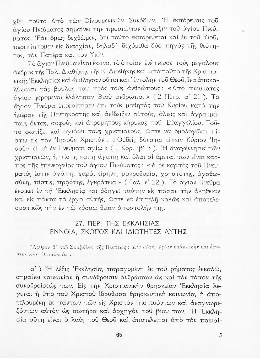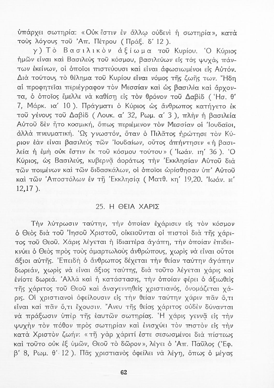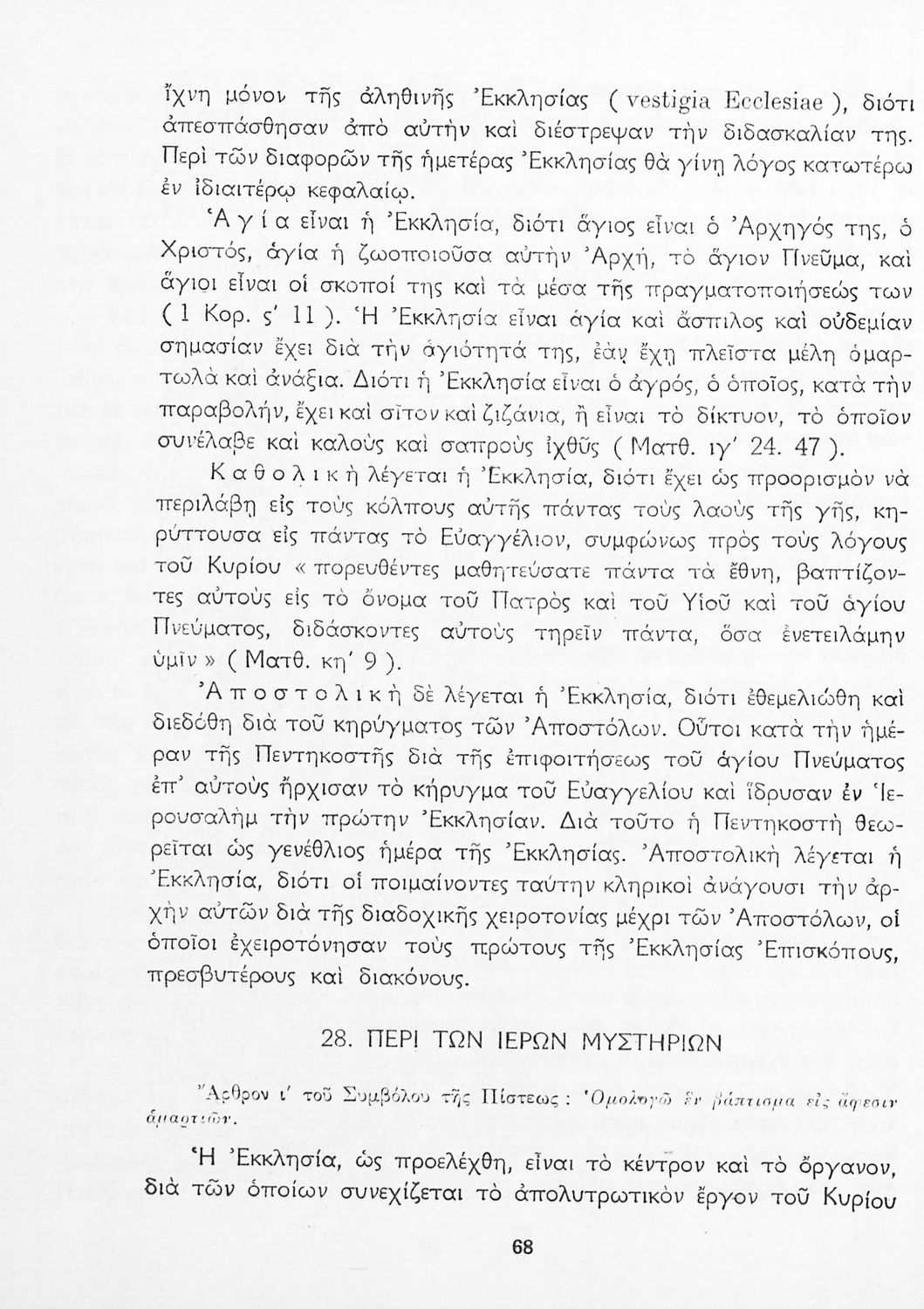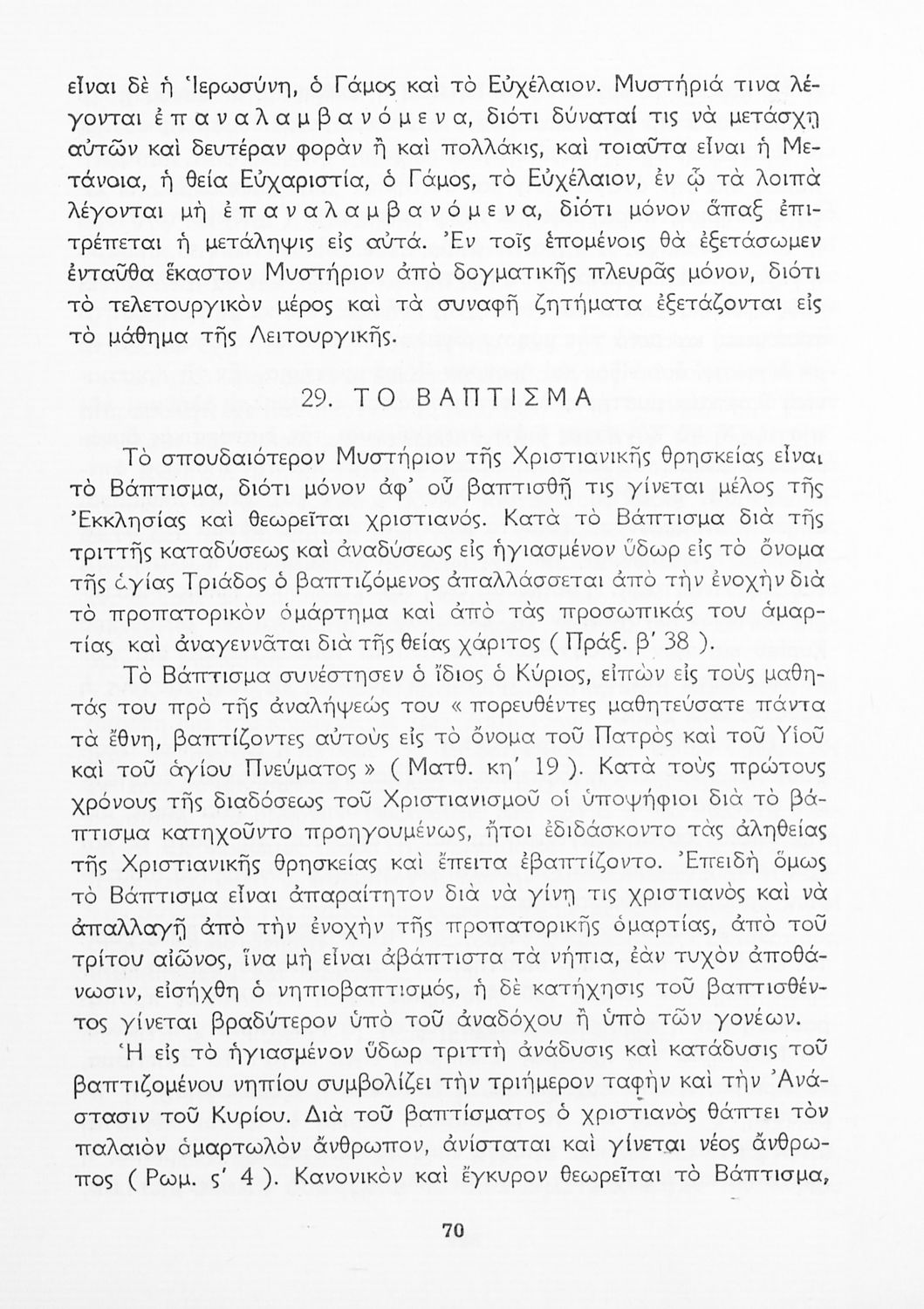 Σχολικό εγχειρίδιο Θρησκευτικών που αναλύει την έννοια της κατήχησης στις διάφορες θρησκείες με έμφαση στο ορθόδοξο χριστιανικό δόγμα, το οποίο εξετάσει από δογματική και ηθική σκοπιά. Περιλαμβάνει και στοιχεία λειτουργικής της Ορθόδοξης Εκκλησίας. Περιέχονται εκκλησιαστικοί ύμνοι και προσευχές. Φέρει το σύμβολο της δικτατορίας.