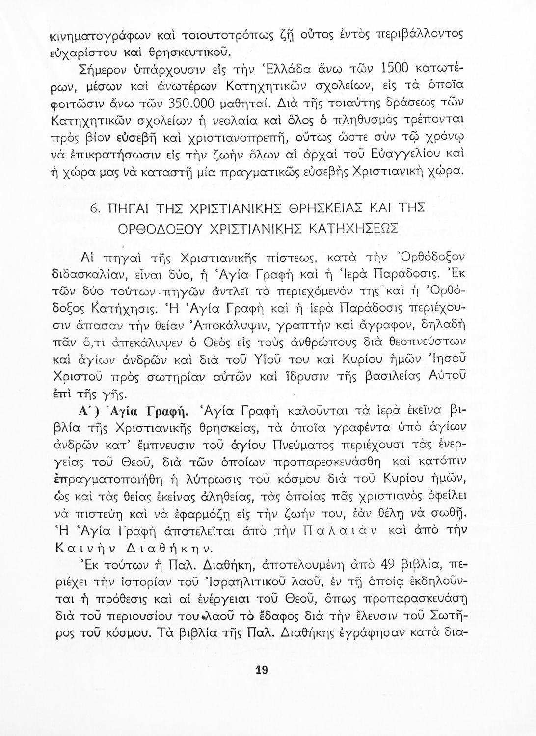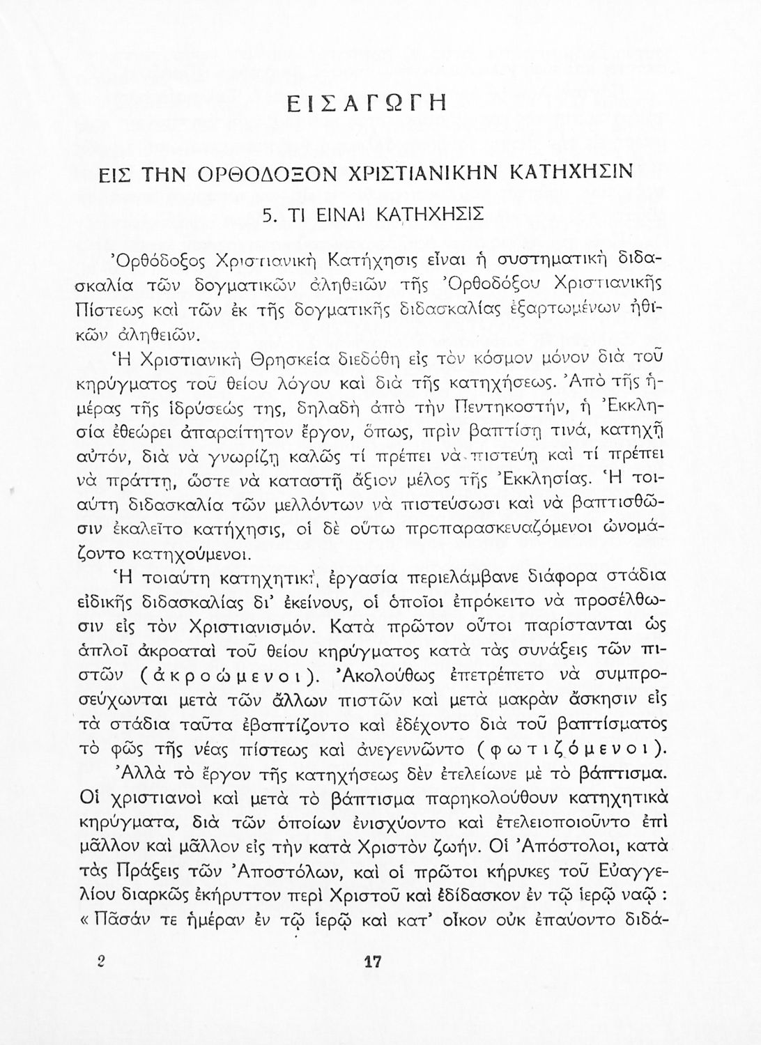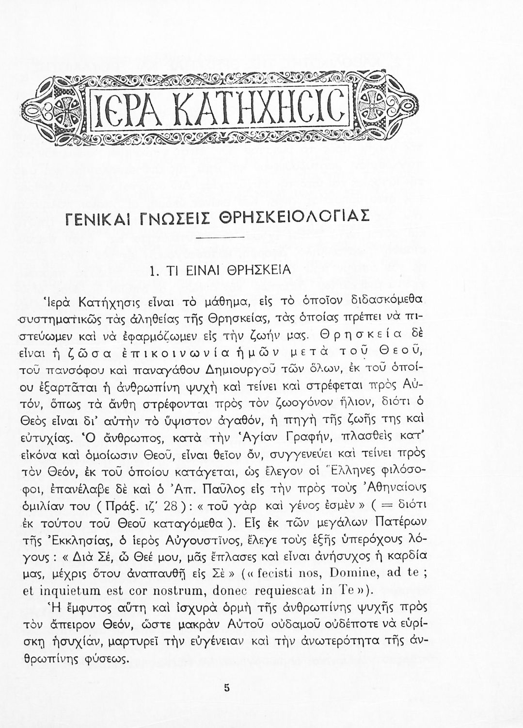 Σχολικό εγχειρίδιο Θρησκευτικών που αναλύει την έννοια της κατήχησης στις διάφορες θρησκείες με έμφαση στο ορθόδοξο χριστιανικό δόγμα, το οποίο εξετάσει από δογματική και ηθική σκοπιά. Περιλαμβάνει και στοιχεία λειτουργικής της Ορθόδοξης Εκκλησίας. Περιέχονται εκκλησιαστικοί ύμνοι και προσευχές. Φέρει το σύμβολο της δικτατορίας.
