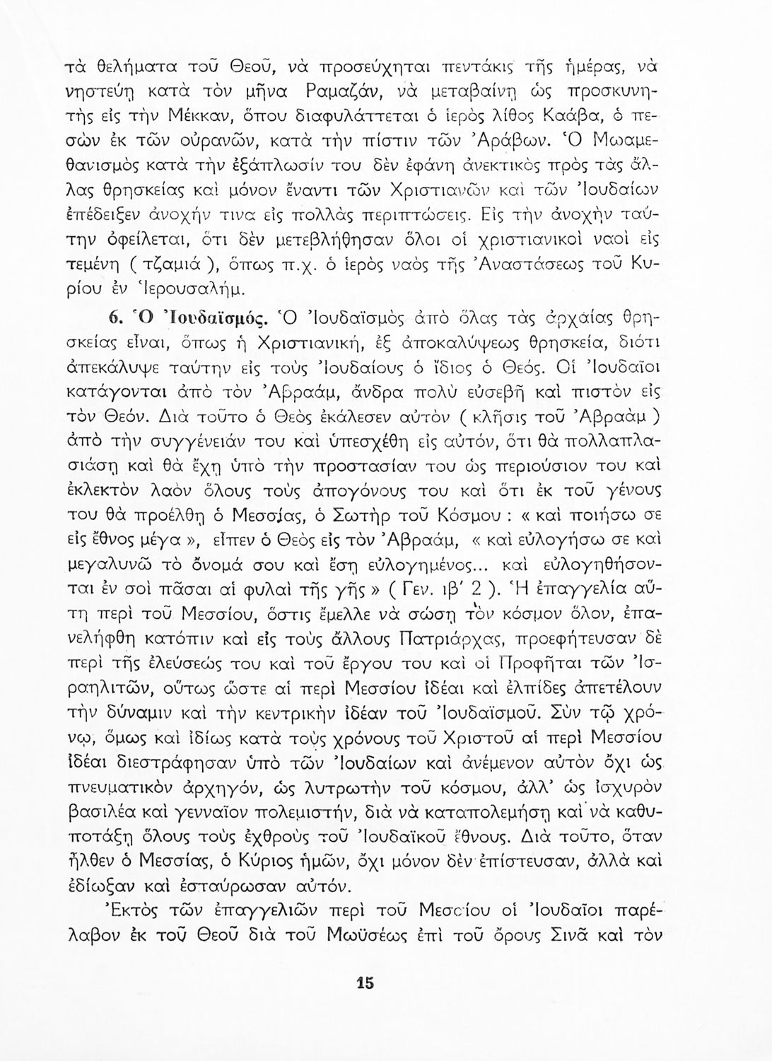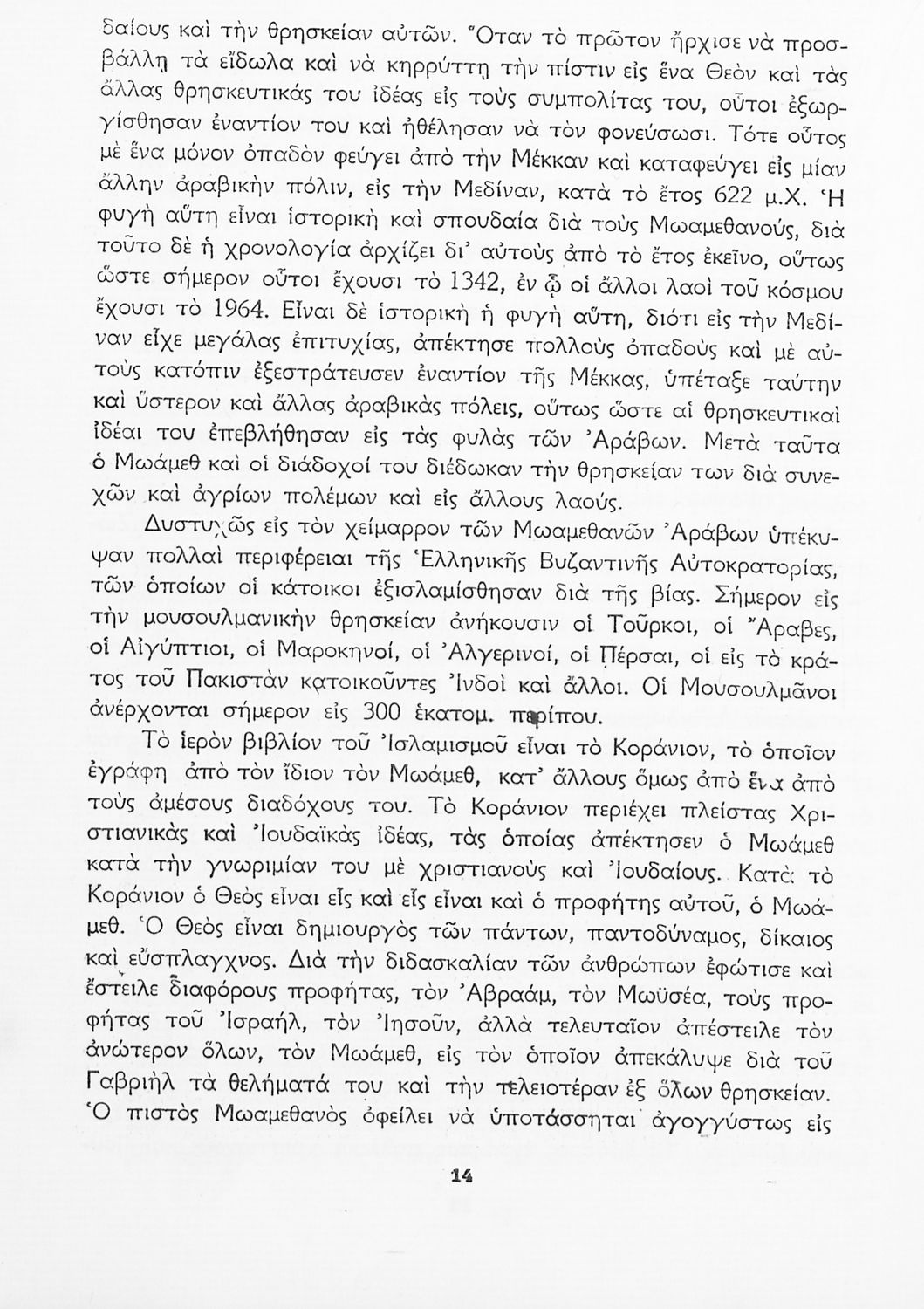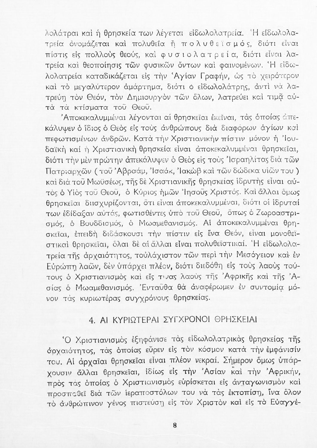 Σχολικό εγχειρίδιο Θρησκευτικών που αναλύει την έννοια της κατήχησης στις διάφορες θρησκείες με έμφαση στο ορθόδοξο χριστιανικό δόγμα, το οποίο εξετάσει από δογματική και ηθική σκοπιά. Περιλαμβάνει και στοιχεία λειτουργικής της Ορθόδοξης Εκκλησίας. Περιέχονται εκκλησιαστικοί ύμνοι και προσευχές. Φέρει το σύμβολο της δικτατορίας.