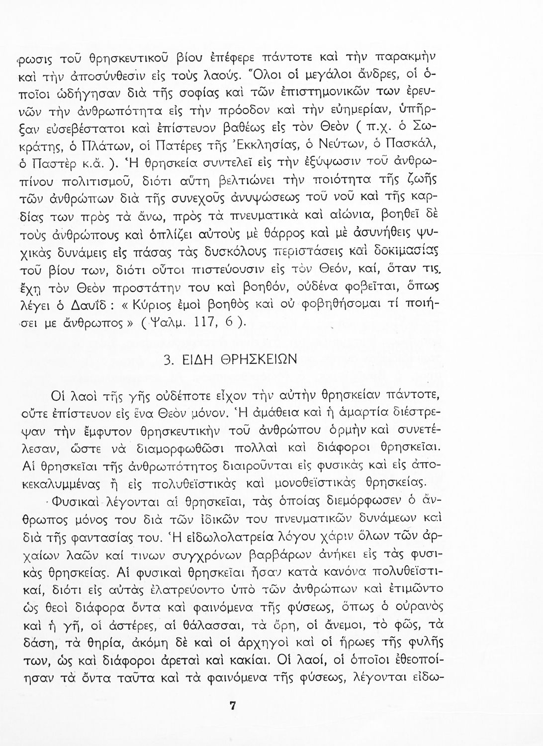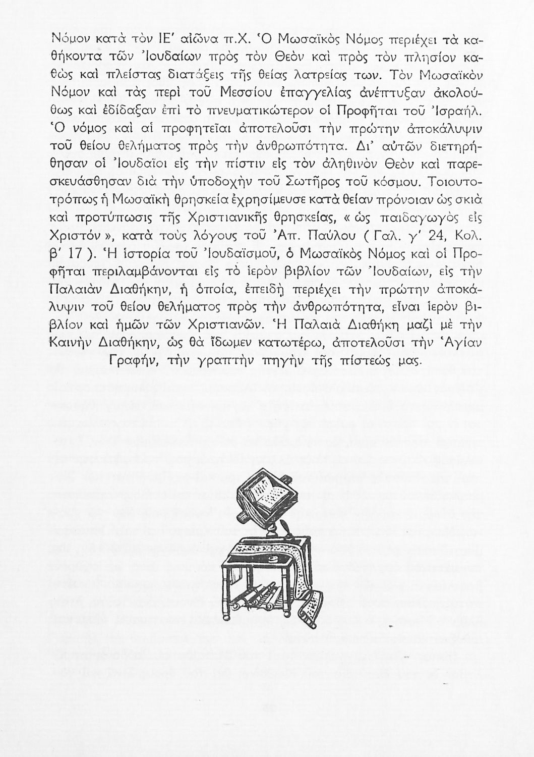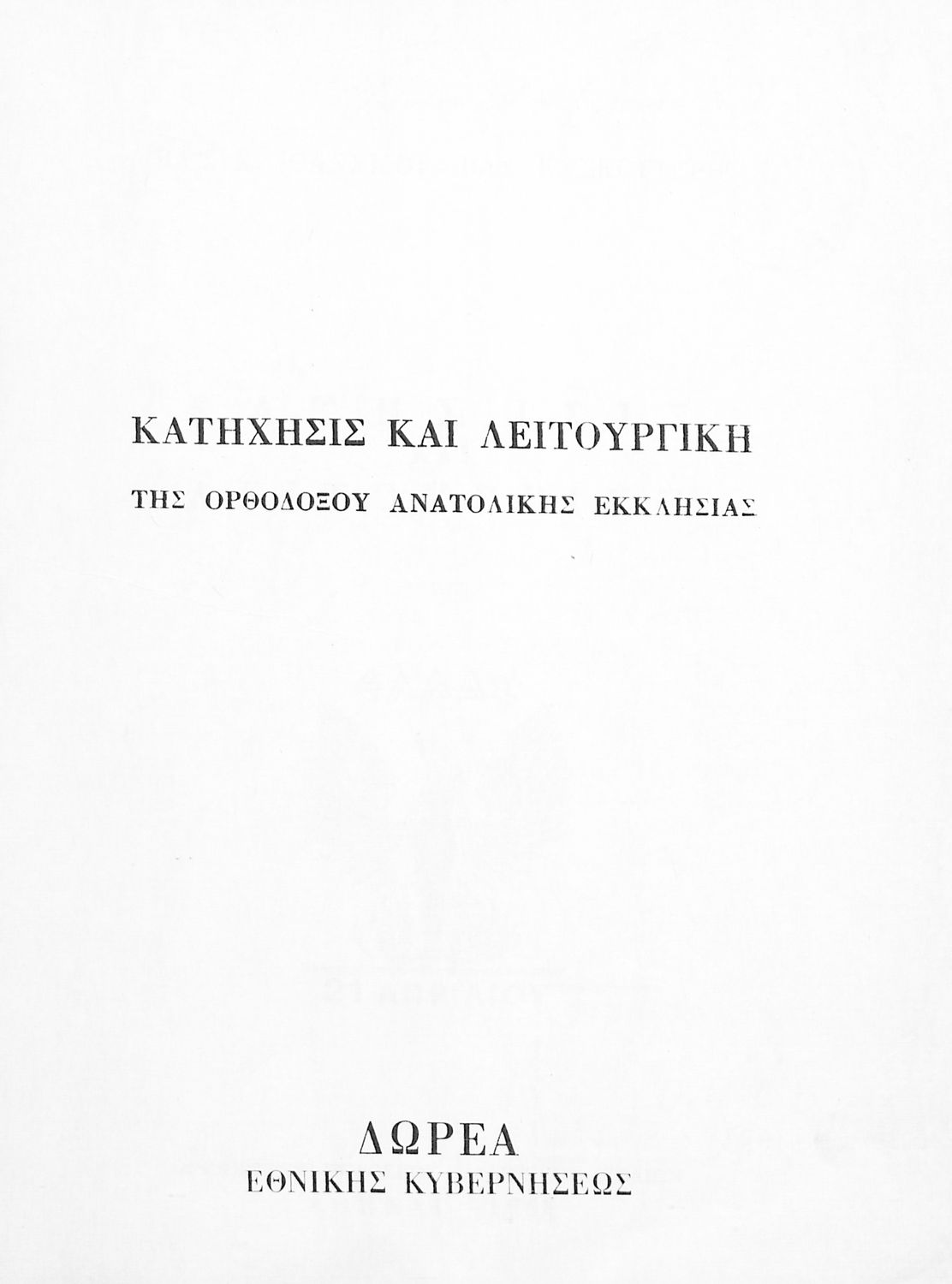 Βαθμίδα εκπαίδευσης: Δευτεροβάθμια Μάθημα: Θρησκευτικά Γλώσσα: Καθαρεύουσα Παρουσίαση περιεχομένου: Σχολικό εγχειρίδιο Θρησκευτικών που αναλύει την έννοια της κατήχησης στις διάφορες θρησκείες με έμφαση στο ορθόδοξο χριστιανικό δόγμα, το οποίο εξετάσει από δογματική και ηθική σκοπιά. Περιλαμβάνει και στοιχεία λειτουργικής της Ορθόδοξης Εκκλησίας. Περιέχονται εκκλησιαστικοί ύμνοι και προσευχές. Φέρει το σύμβολο της δικτατορίας. |