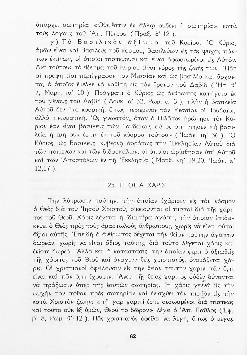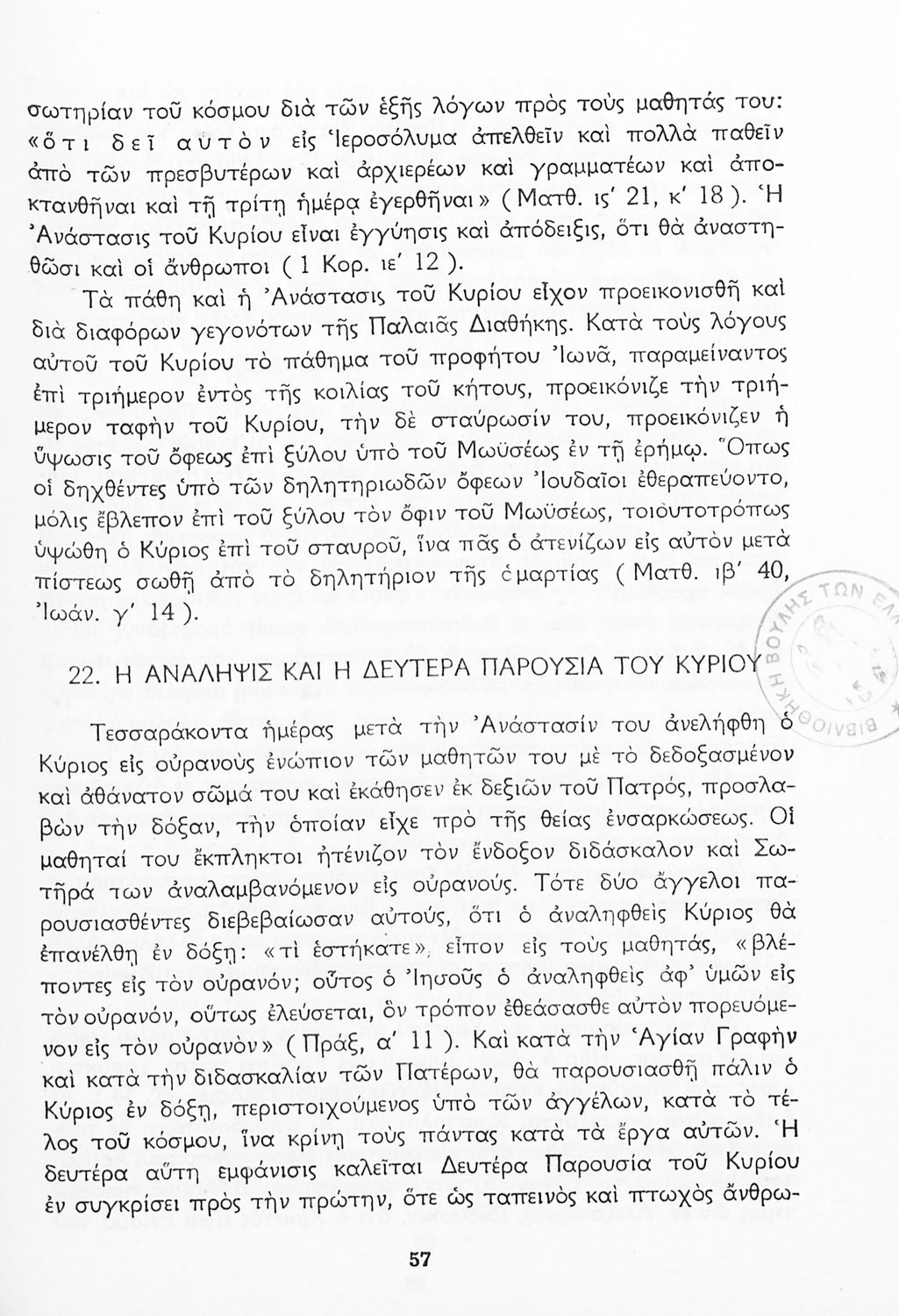 Σχολικό εγχειρίδιο Θρησκευτικών Ε' Γυμνασίου που αναλύει την έννοια της κατήχησης στις διάφορες θρησκείες με έμφαση στο ορθόδοξο χριστιανικό δόγμα, το οποίο εξετάσει από δογματική και ηθική σκοπιά. Περιλαμβάνει και στοιχεία λειτουργικής της Ορθόδοξης Εκκλησίας. Περιέχονται εκκλησιαστικοί ύμνοι και προσευχές. Φέρει το σύμβολο της δικτατορίας.