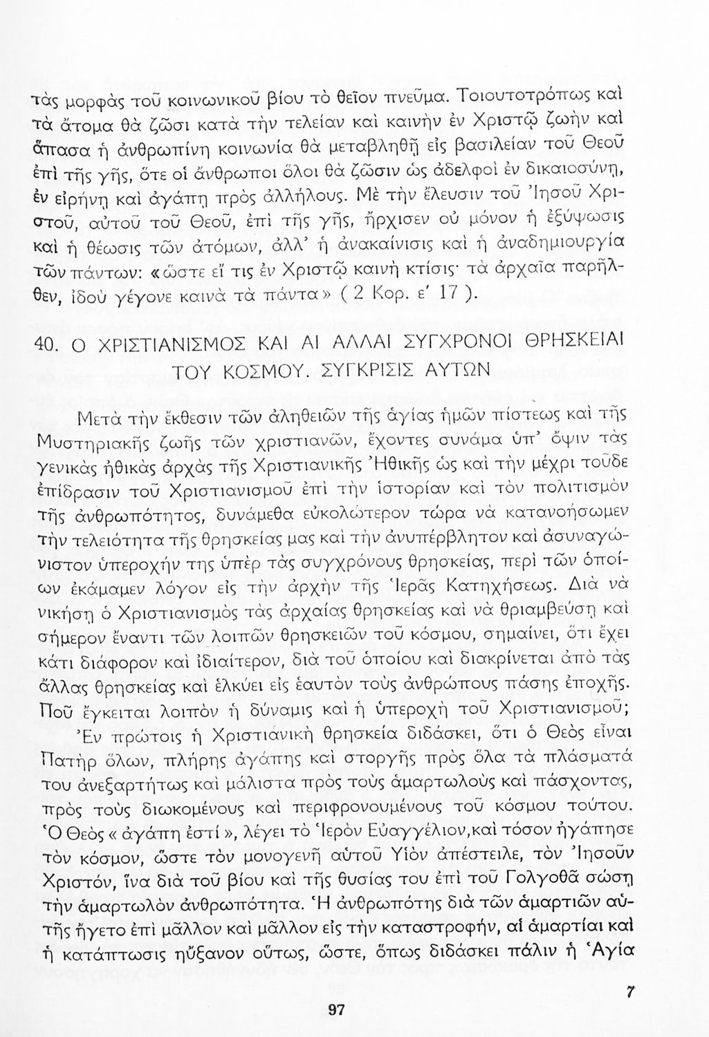 Σχολικό εγχειρίδιο Θρησκευτικών Ε' Γυμνασίου που αναλύει την έννοια της κατήχησης στις διάφορες θρησκείες με έμφαση στο ορθόδοξο χριστιανικό δόγμα, το οποίο εξετάσει από δογματική και ηθική σκοπιά. Περιλαμβάνει και στοιχεία λειτουργικής της Ορθόδοξης Εκκλησίας. Περιέχονται εκκλησιαστικοί ύμνοι και προσευχές. Φέρει το σύμβολο της δικτατορίας.