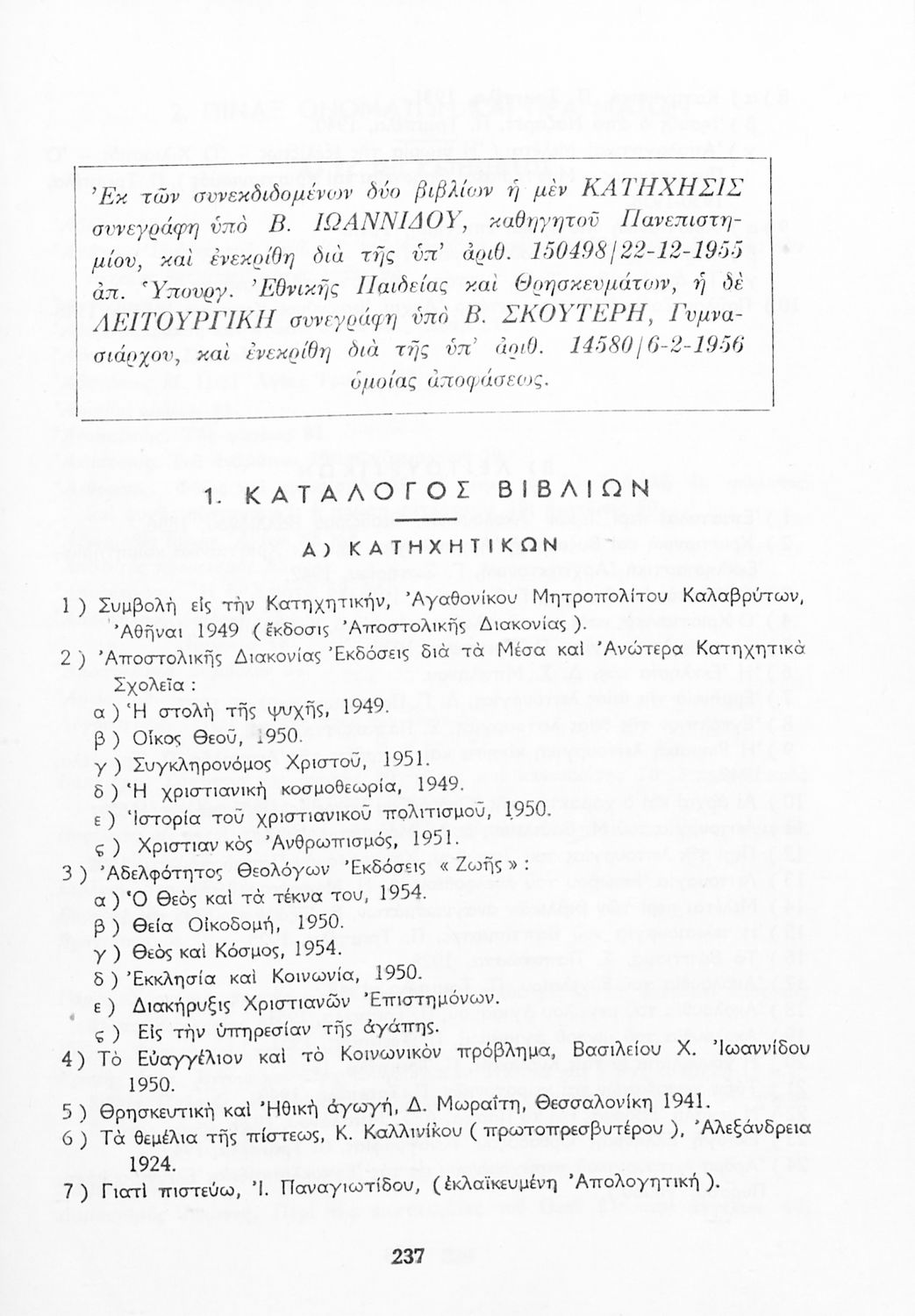 Σχολικό εγχειρίδιο Θρησκευτικών Ε' και ΣΤ΄ Γυμνασίου που αναλύει την έννοια της κατήχησης στις διάφορες θρησκείες με έμφαση στο ορθόδοξο χριστιανικό δόγμα, το οποίο εξετάζει από δογματική και ηθική σκοπιά. Περιλαμβάνει και στοιχεία λειτουργικής της Ορθόδοξης Εκκλησίας. Περιέχονται εκκλησιαστικοί ύμνοι και προσευχές. Φέρει το σύμβολο της δικτατορίας.