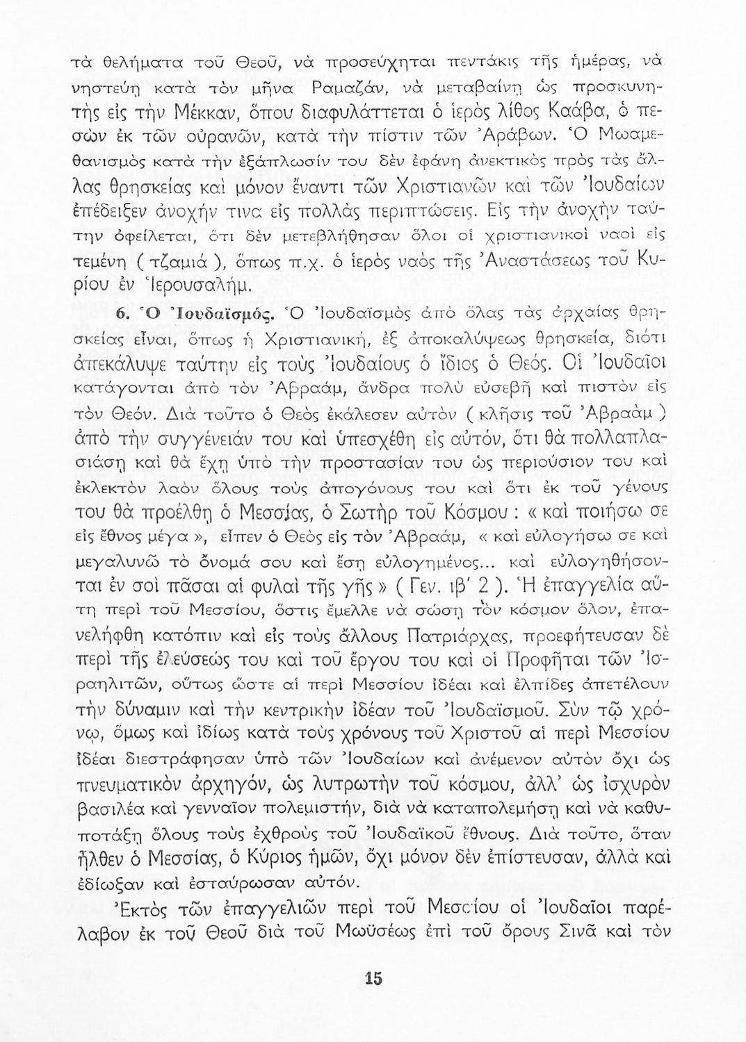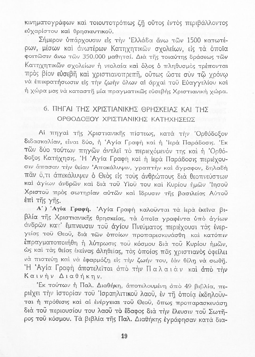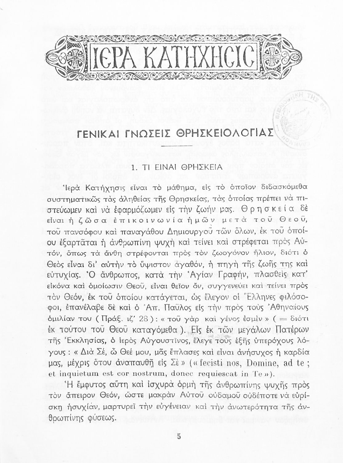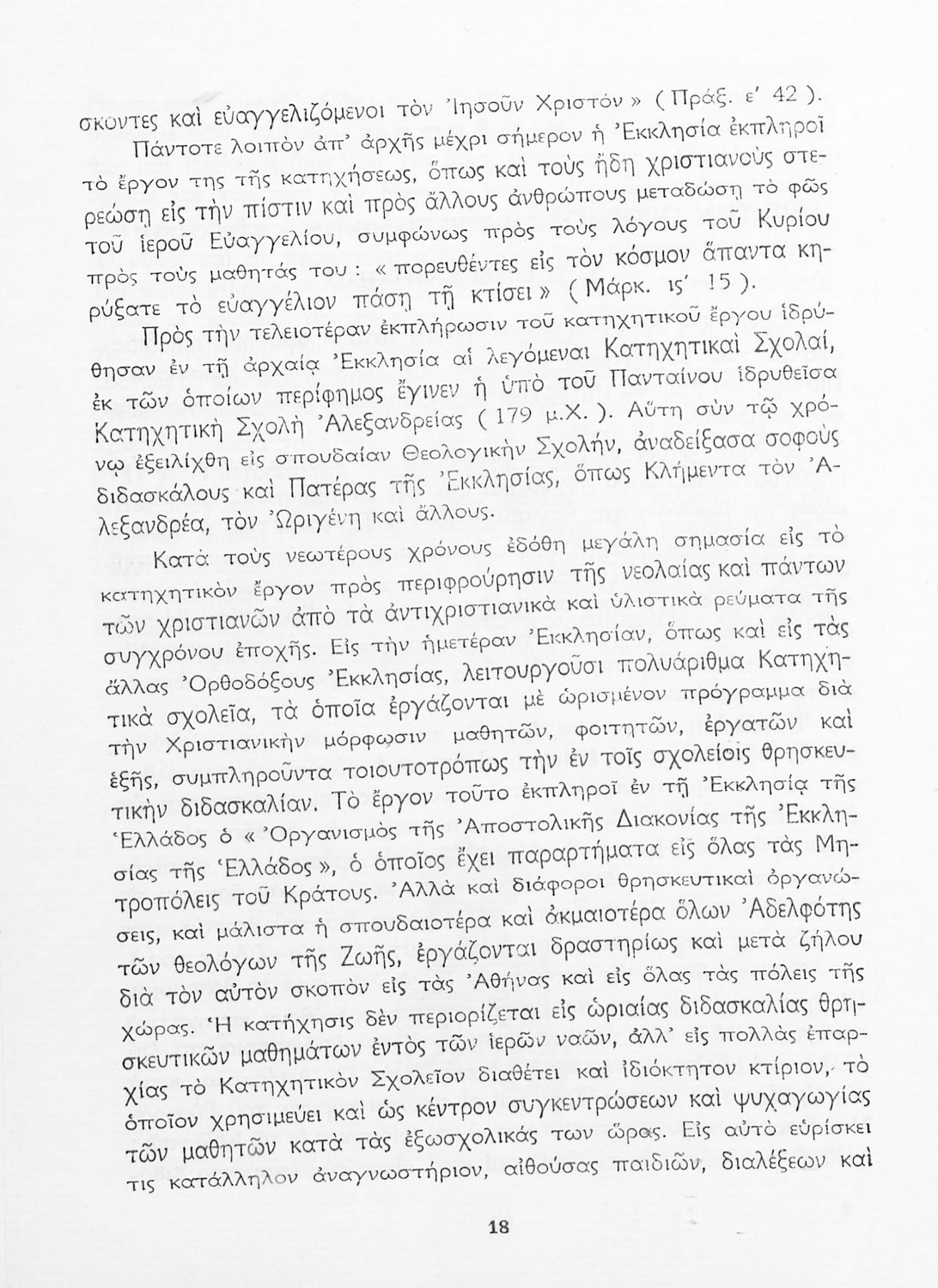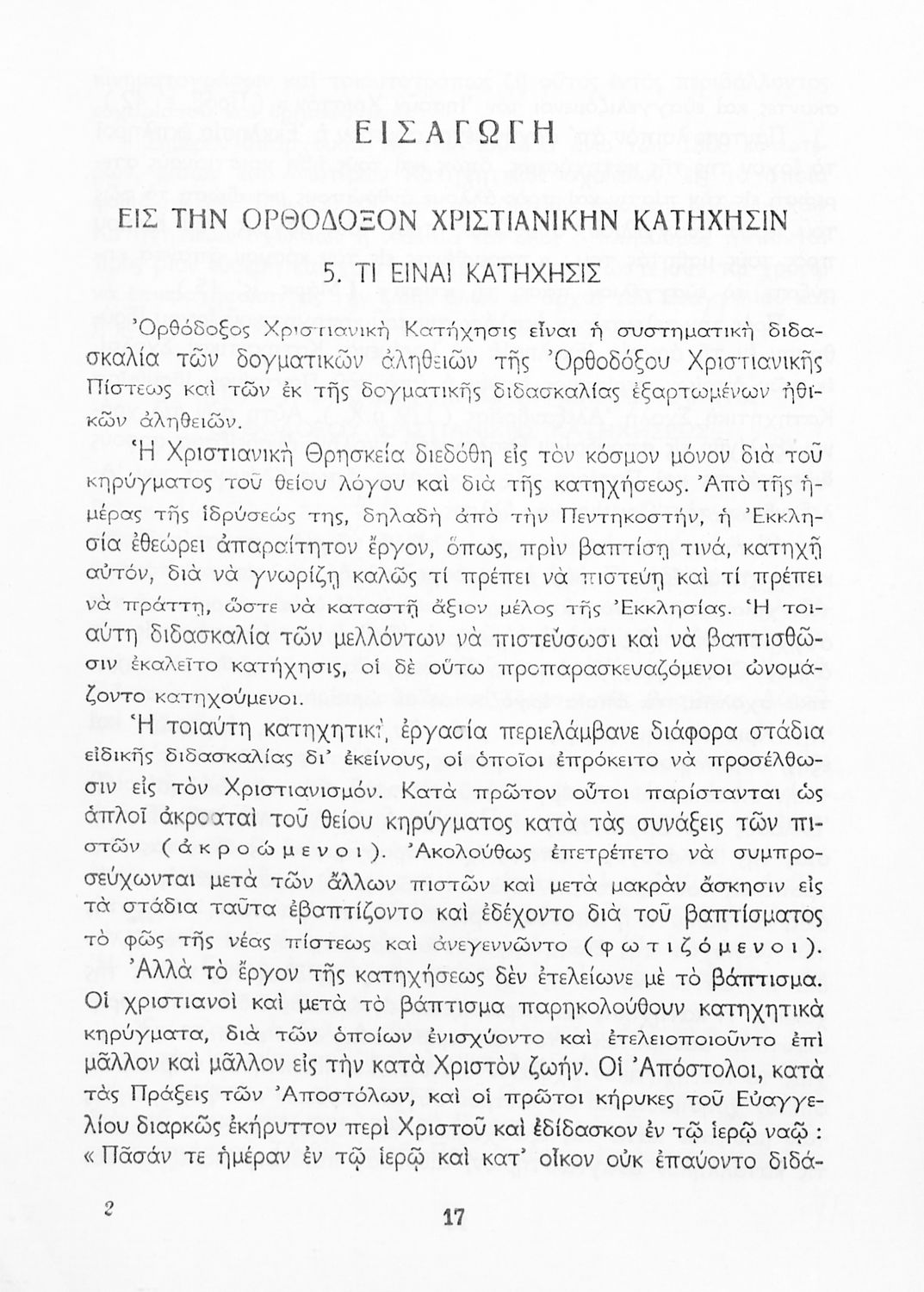 Σχολικό εγχειρίδιο Θρησκευτικών Ε' και ΣΤ΄ Γυμνασίου που αναλύει την έννοια της κατήχησης στις διάφορες θρησκείες με έμφαση στο ορθόδοξο χριστιανικό δόγμα, το οποίο εξετάζει από δογματική και ηθική σκοπιά. Περιλαμβάνει και στοιχεία λειτουργικής της Ορθόδοξης Εκκλησίας. Περιέχονται εκκλησιαστικοί ύμνοι και προσευχές. Φέρει το σύμβολο της δικτατορίας.