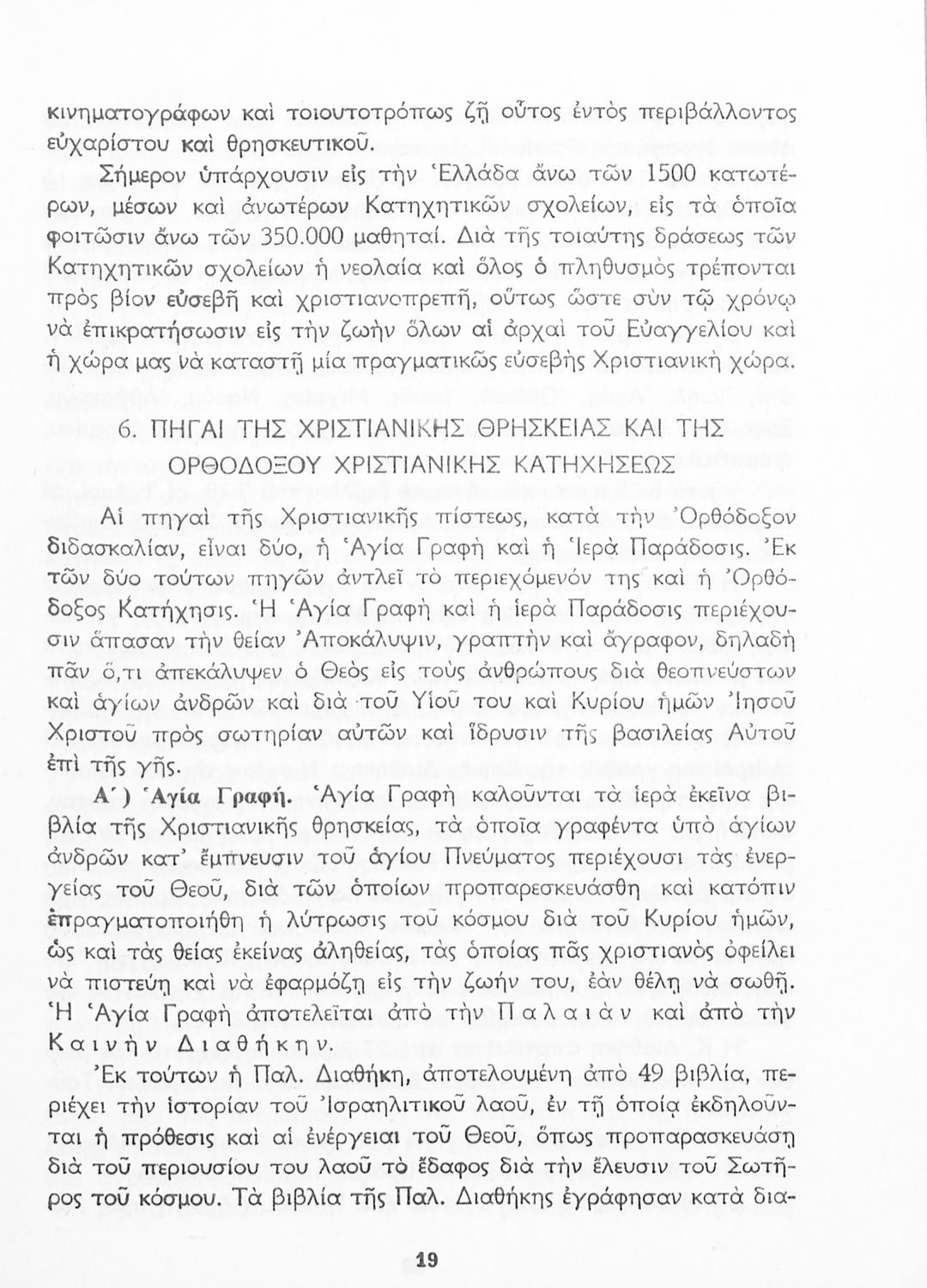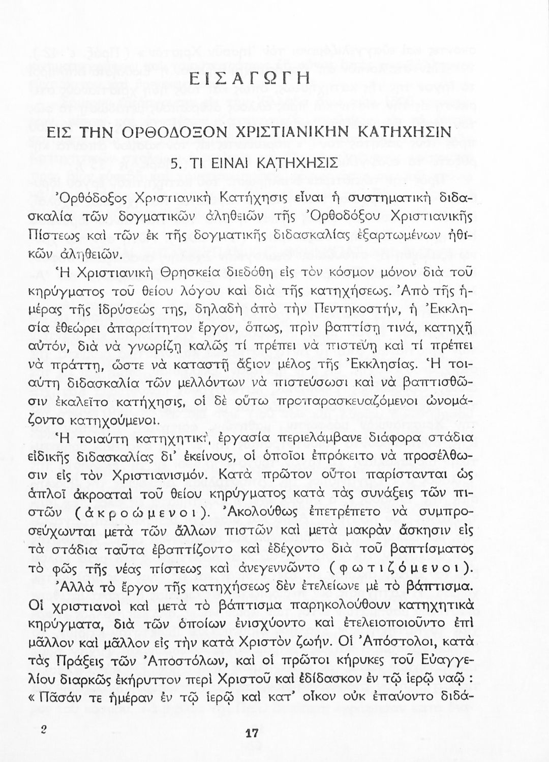 Σχολικό εγχειρίδιο Θρησκευτικών για τους μαθητές της Γ΄ και Ε' Γυμνασίου που αναλύει την έννοια της κατήχησης στις διάφορες θρησκείες με έμφαση στο ορθόδοξο χριστιανικό δόγμα, το οποίο εξετάσει από δογματική και ηθική σκοπιά. Περιλαμβάνει και στοιχεία λειτουργικής της Ορθόδοξης Εκκλησίας. Περιέχονται εκκλησιαστικοί ύμνοι και προσευχές. Φέρει το σύμβολο της δικτατορίας.