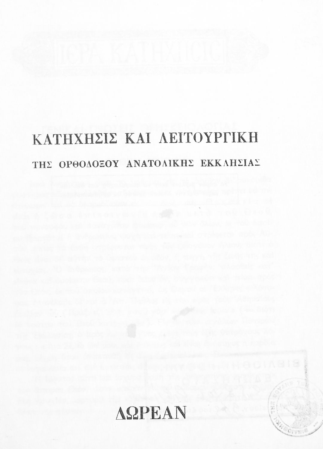 Τίτλος: Κατήχησις και Λειτουργική της Ορθόδοξου Ανατολικής Εκκλησίας