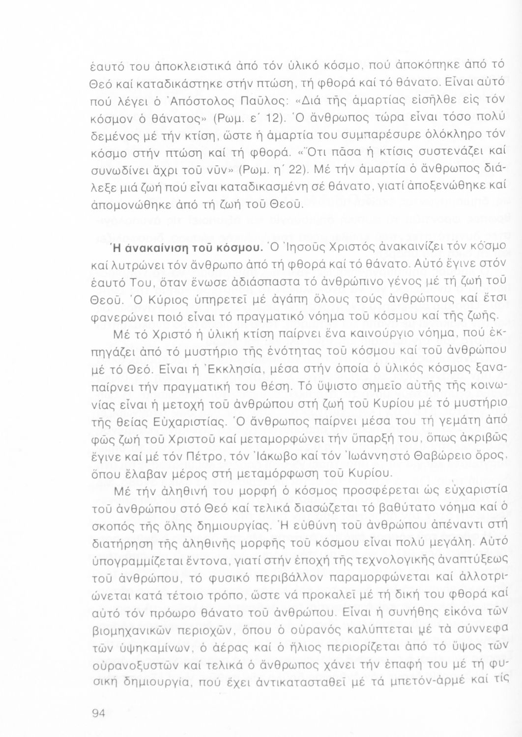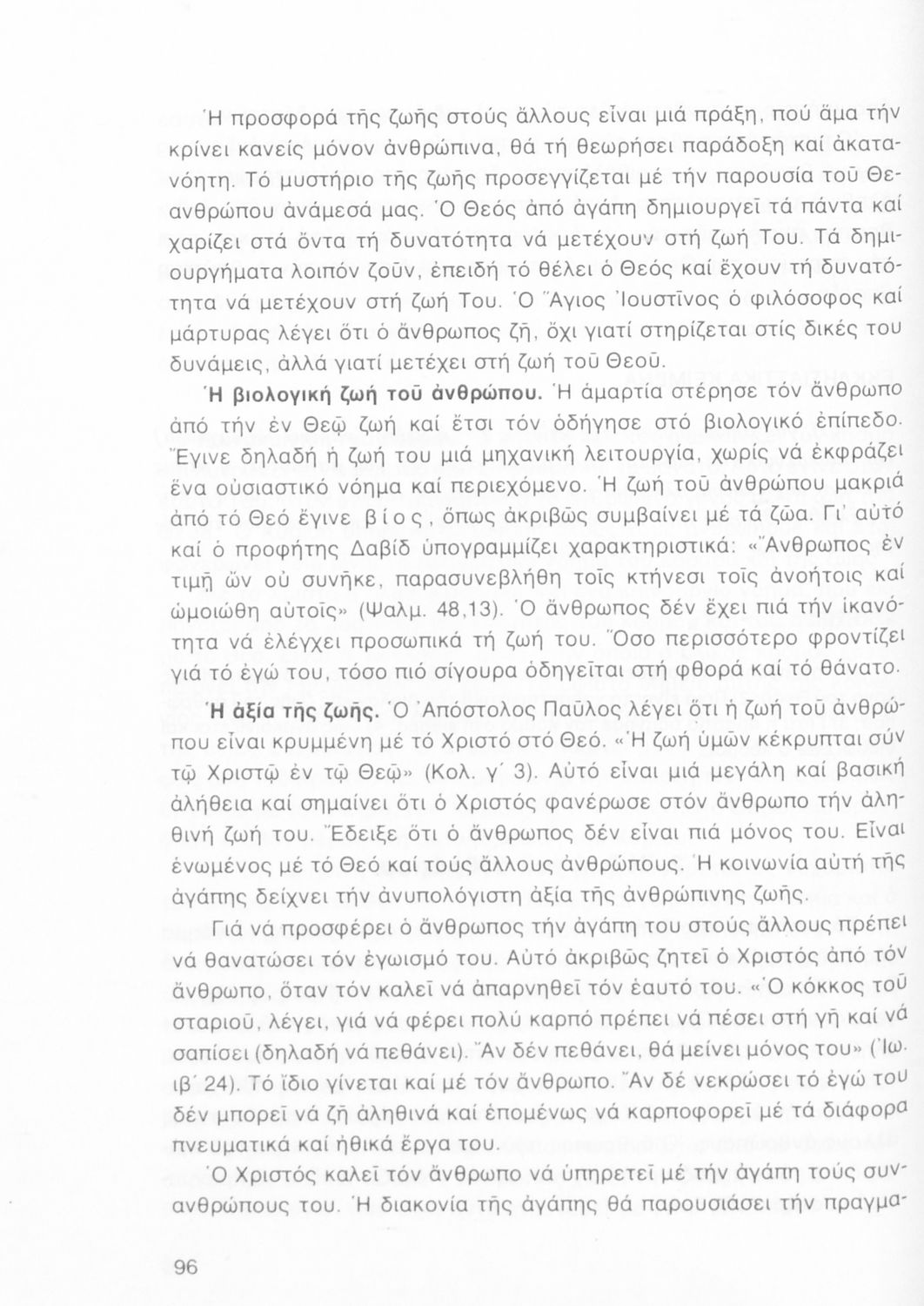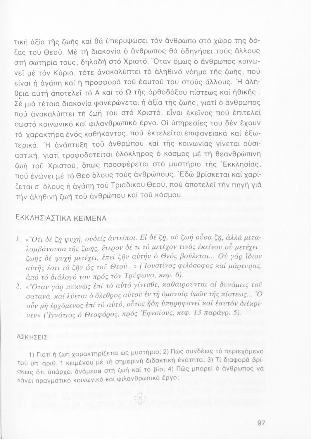 Σχολικό εγχειρίδιο Θρησκευτικών Α΄, Β΄ και Γ΄ Λυκείου που, μέσα από τα κείμενα των Πατέρων της Εκκλησίας, πραγματεύεται ζητήματα αρετής, ηθικής αμαρτίας, λύτρωσης, δικαιοσύνης και αγάπης. Επίσης αναφέρεται ...