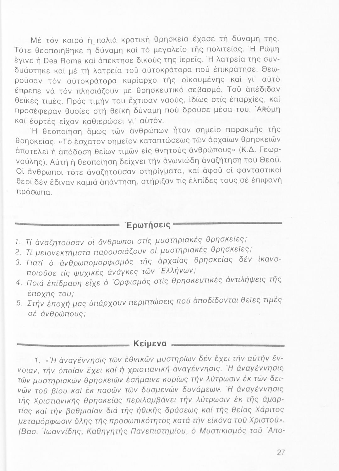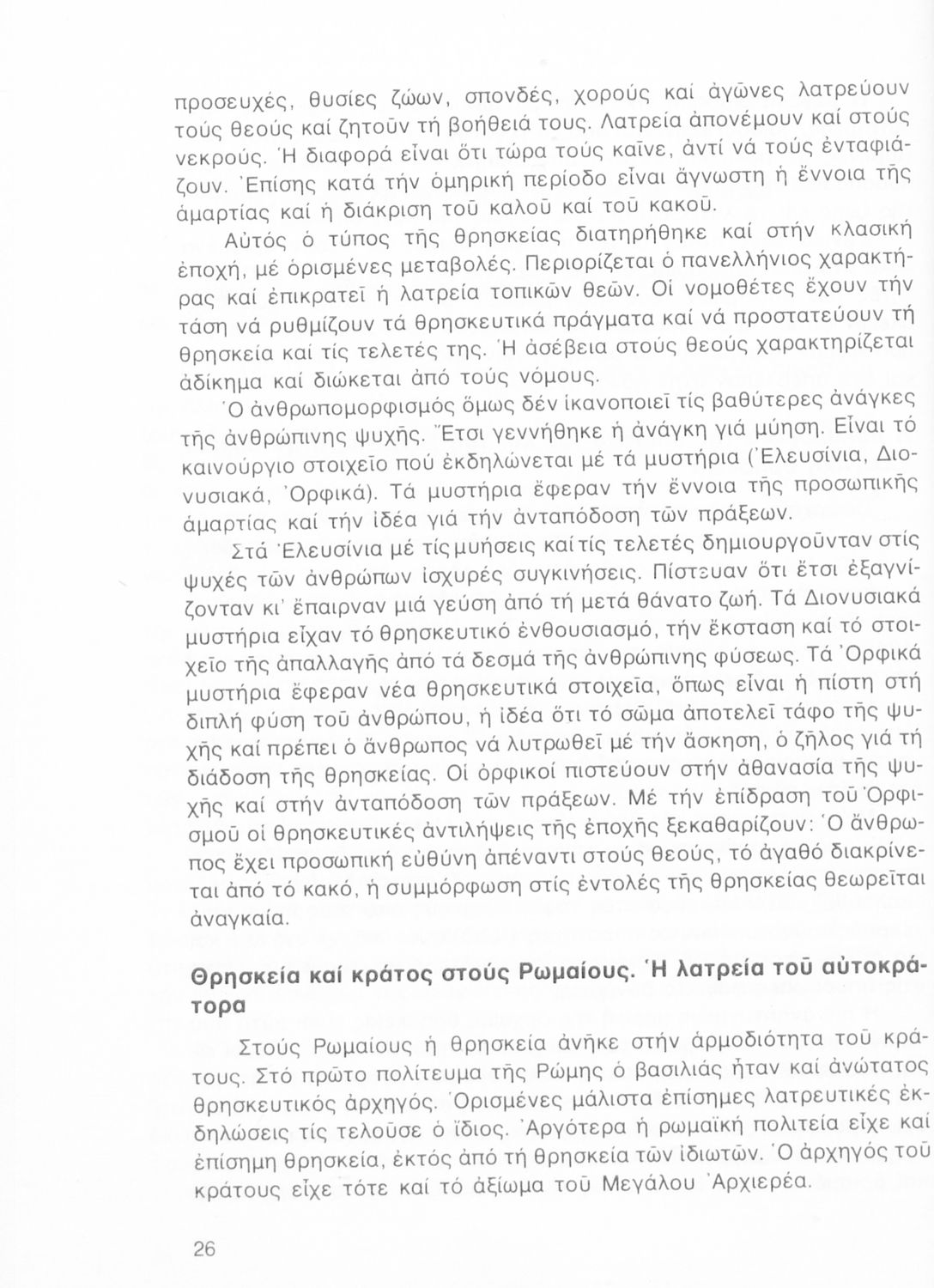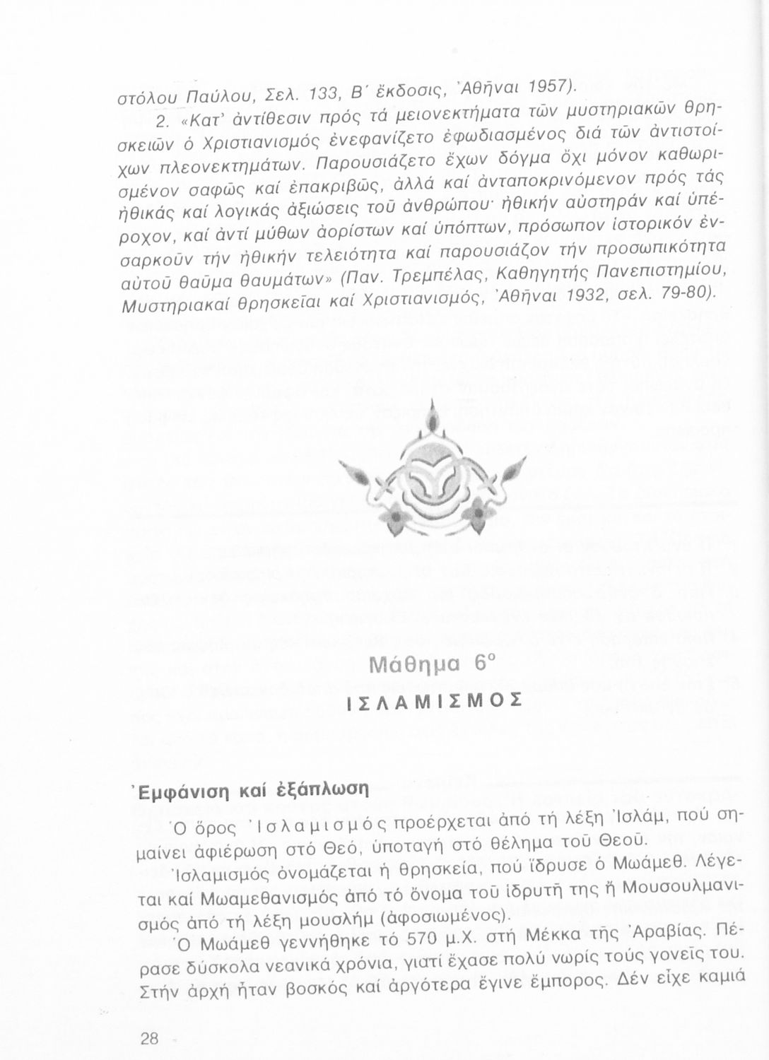 Βαθμίδα εκπαίδευσης: Δευτεροβάθμια Τάξη: Β' Λυκείου Μάθημα: Θρησκευτικά Γλώσσα: Δημοτική Παρουσίαση περιεχομένου: Σχολικό εγχειρίδιο Θρησκευτικών Β΄ Λυκείου που περιλαμβάνει μια συνοπτική παρουσίαση των κυριότερων θρησκειών, αναλύει τη σχέση του χριστιανισμού με τις άλλες θρησκείες, και εστιάζει στις πηγές και τα θρησκευτικά κείμενα της χριστιανικής πίστης. Περιέχει και ερωτήσεις κατανόησης. |