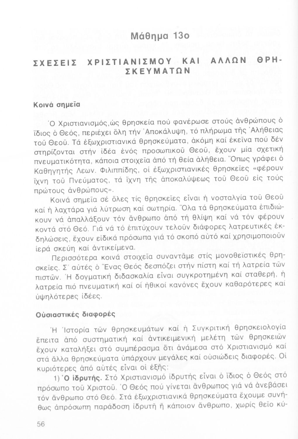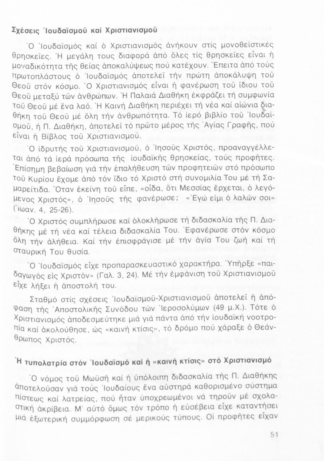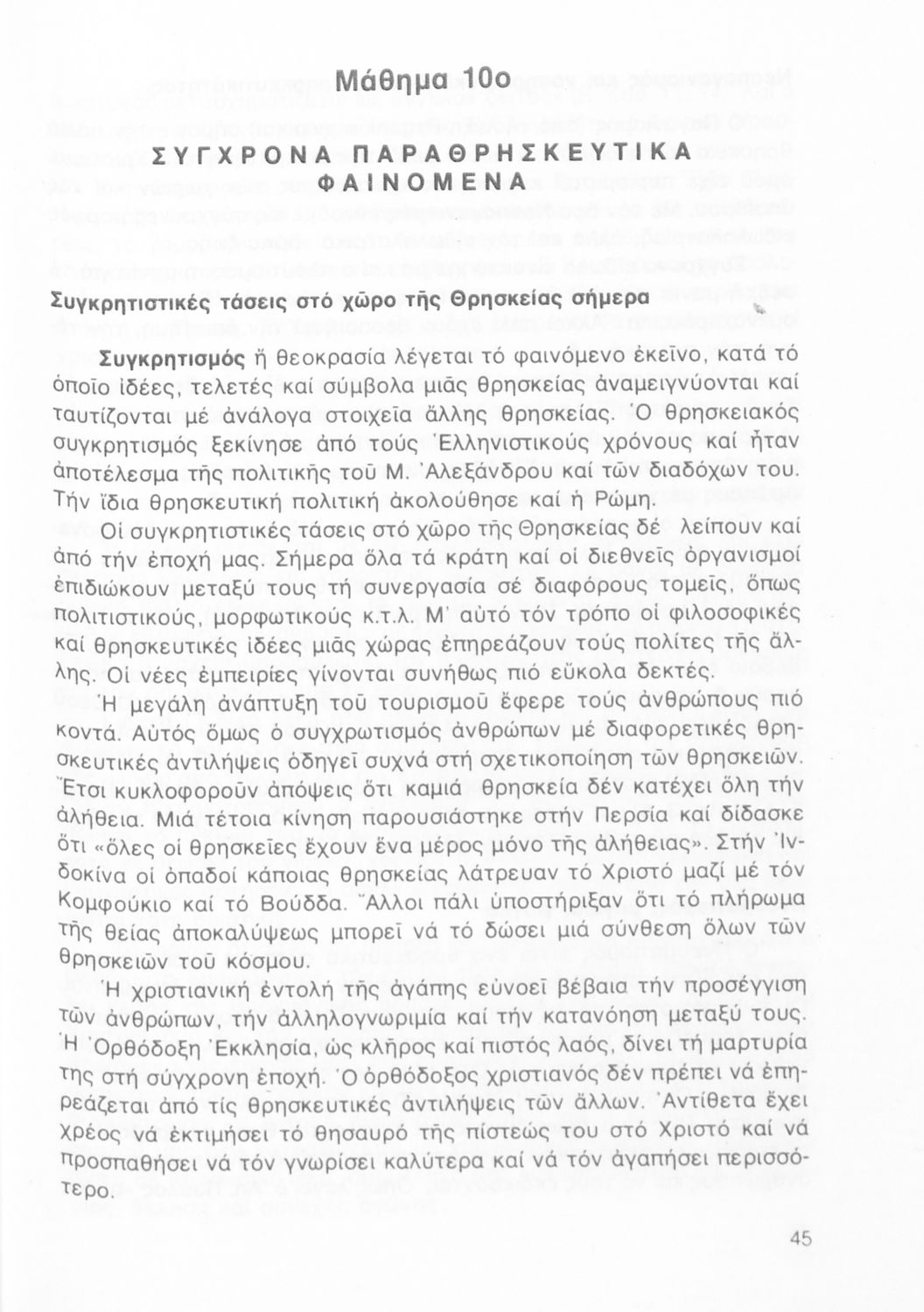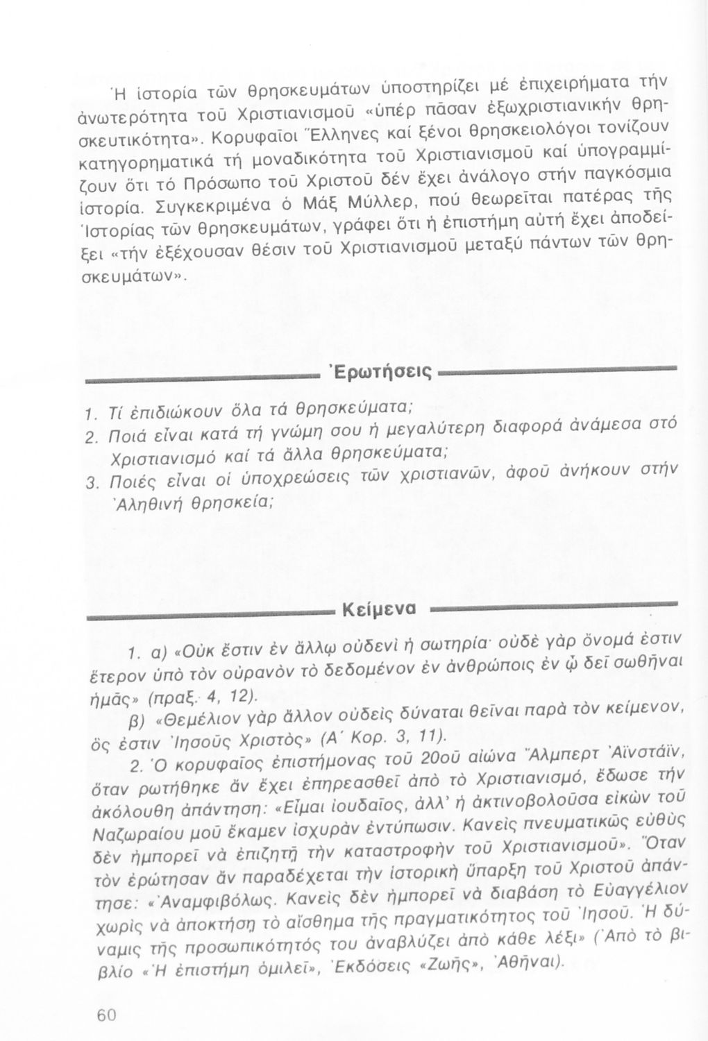 Βαθμίδα εκπαίδευσης: Δευτεροβάθμια Τάξη: Β' Λυκείου Μάθημα: Θρησκευτικά Γλώσσα: Δημοτική Παρουσίαση περιεχομένου: Σχολικό εγχειρίδιο Θρησκευτικών Β΄ Λυκείου που περιλαμβάνει μια συνοπτική παρουσίαση των κυριότερων θρησκειών, αναλύει τη σχέση του χριστιανισμού με τις άλλες θρησκείες, και εστιάζει στις πηγές και τα θρησκευτικά κείμενα της χριστιανικής πίστης. Περιέχει και ερωτήσεις κατανόησης. |