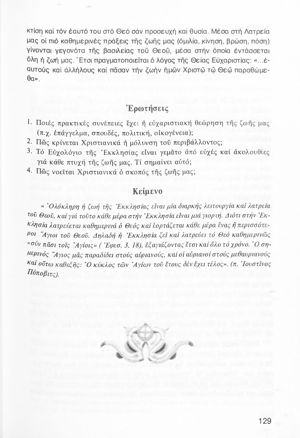 Σχολικό εγχειρίδιο Θρησκευτικών Α΄ Λυκείου που πραγματεύεται εκκλησιολογικά ζητήματα όπως η δομή και η οργάνωση της εκκλησίας και η σχέση της με άλλα δόγματα και αιρέσεις Περιέχει και στοιχεία για την κοινωνική δράση της Εκκλησίας και για τις μορφές της χριστιανικής τέχνης και αναλύει φαινόμενα όπως ο ασκητισμός και ο μοναχισμός.