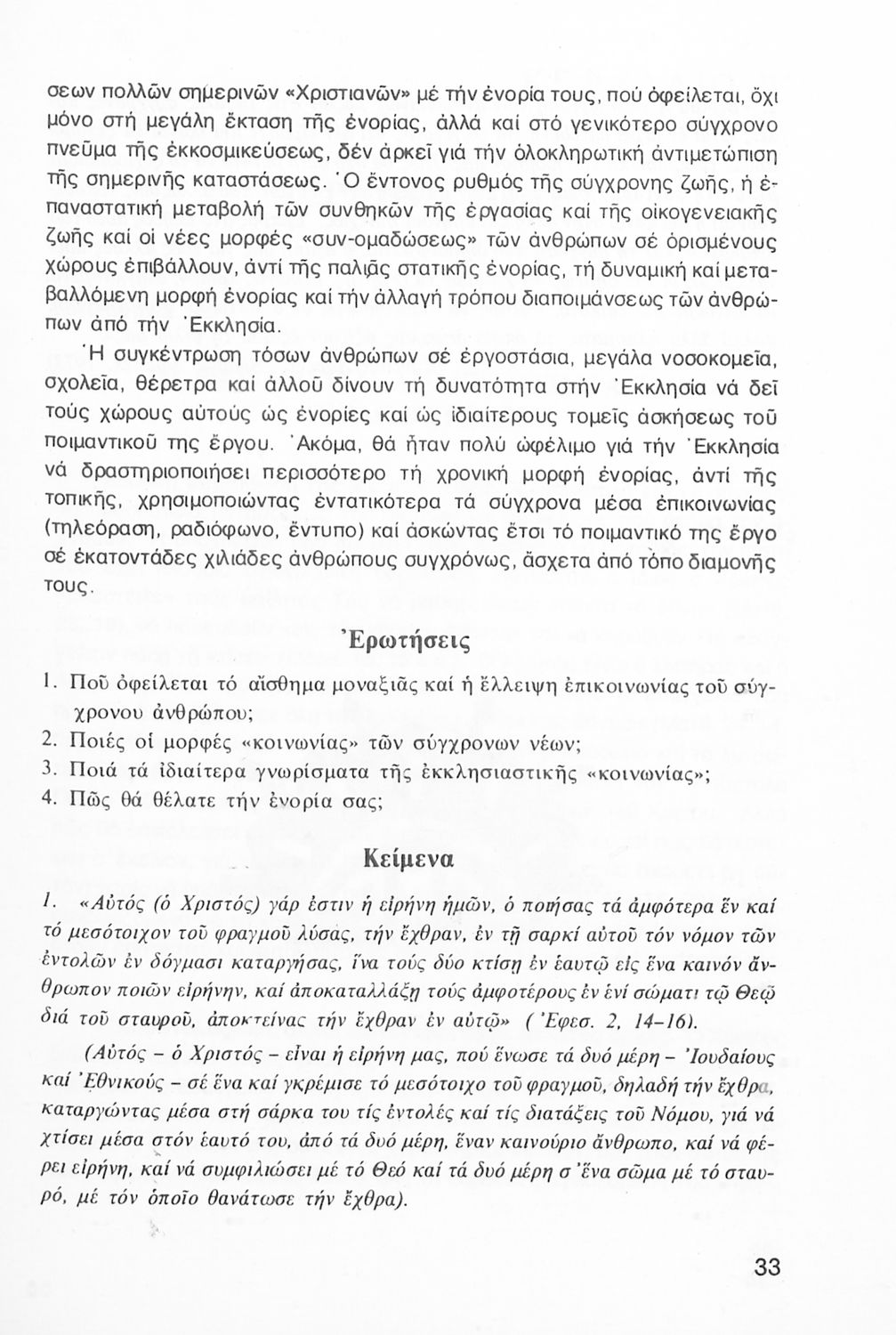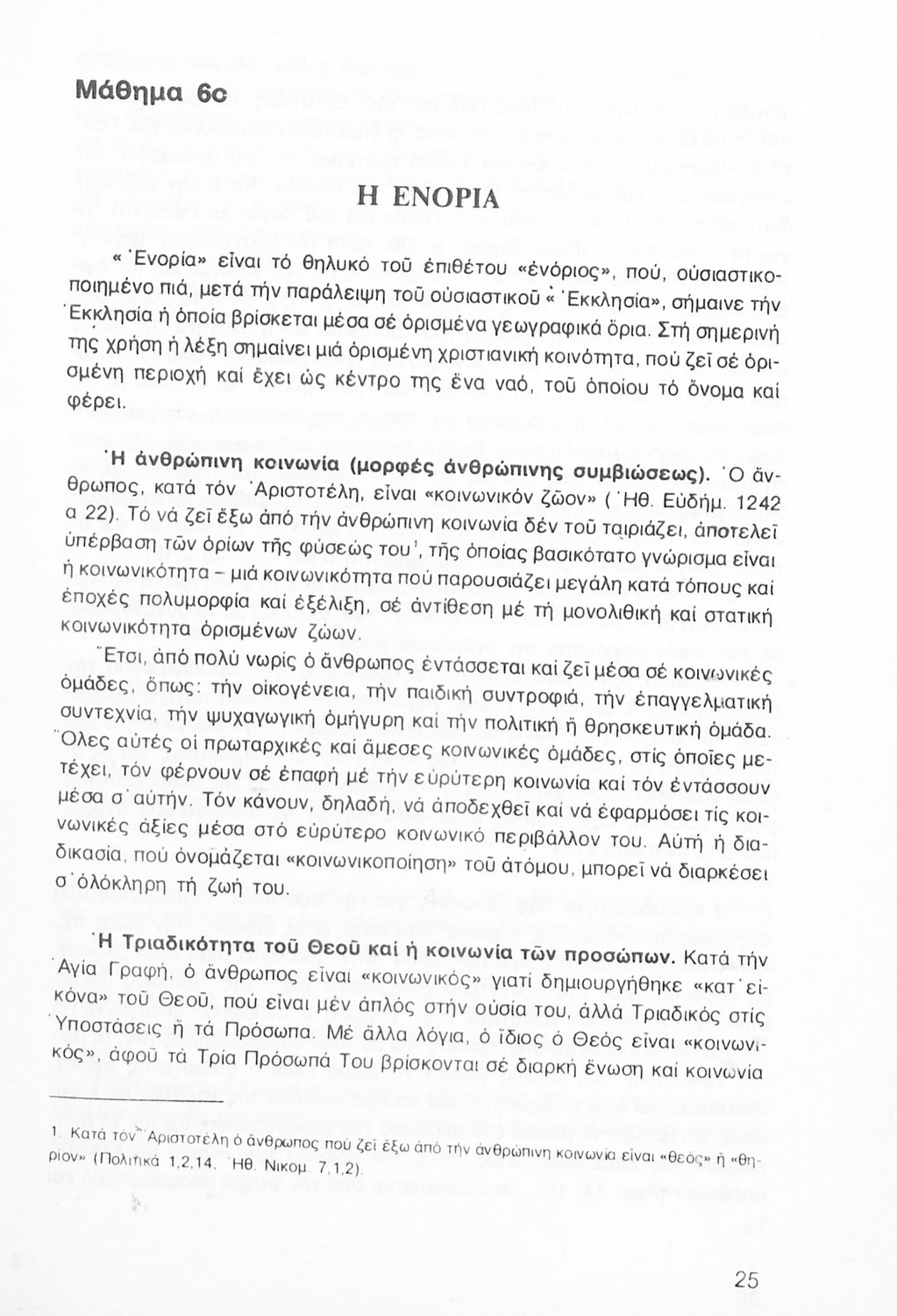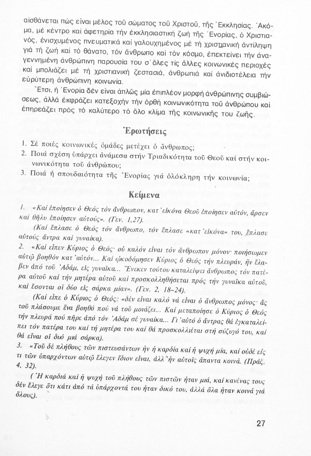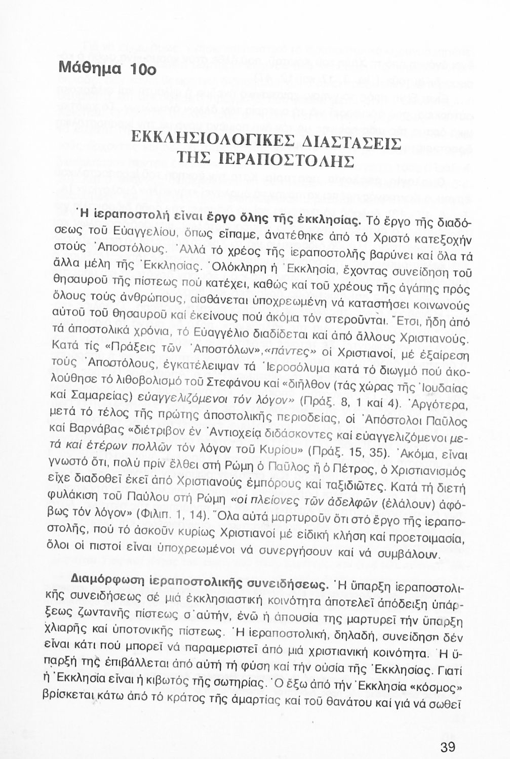 Σχολικό εγχειρίδιο Θρησκευτικών Α΄ Λυκείου που πραγματεύεται εκκλησιολογικά ζητήματα όπως η δομή και η οργάνωση της εκκλησίας και η σχέση της με άλλα δόγματα και αιρέσεις Περιέχει και στοιχεία για την κοινωνική δράση της Εκκλησίας και για τις μορφές της χριστιανικής τέχνης και αναλύει φαινόμενα όπως ο ασκητισμός και ο μοναχισμός.