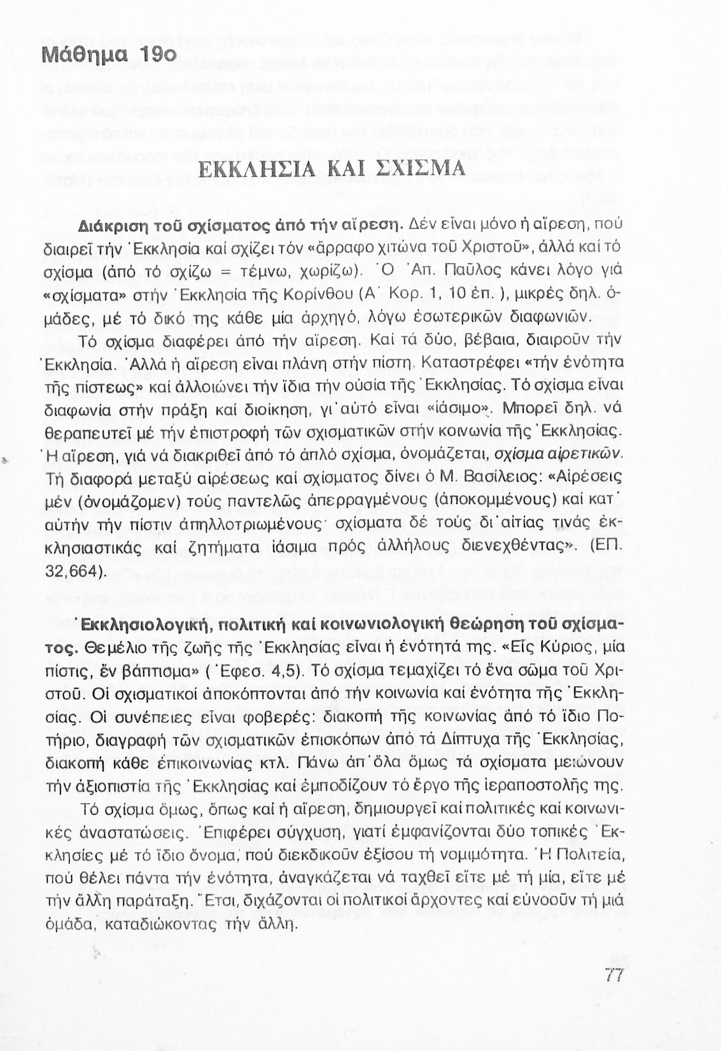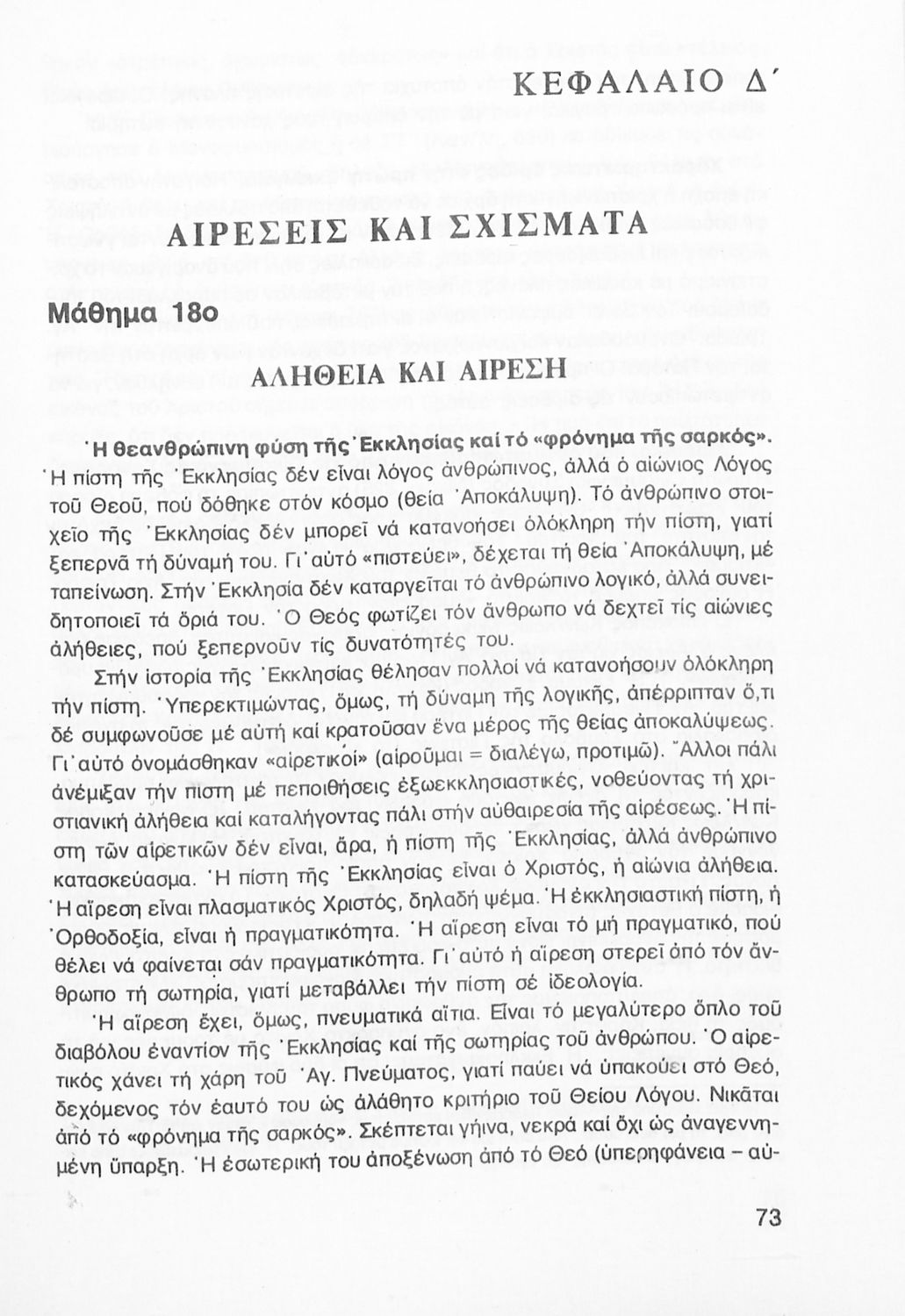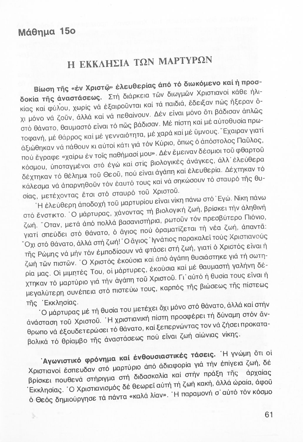 Σχολικό εγχειρίδιο Θρησκευτικών Α΄ Λυκείου που πραγματεύεται εκκλησιολογικά ζητήματα όπως η δομή και η οργάνωση της εκκλησίας και η σχέση της με άλλα δόγματα και αιρέσεις Περιέχει και στοιχεία για την κοινωνική δράση της Εκκλησίας και για τις μορφές της χριστιανικής τέχνης και αναλύει φαινόμενα όπως ο ασκητισμός και ο μοναχισμός.