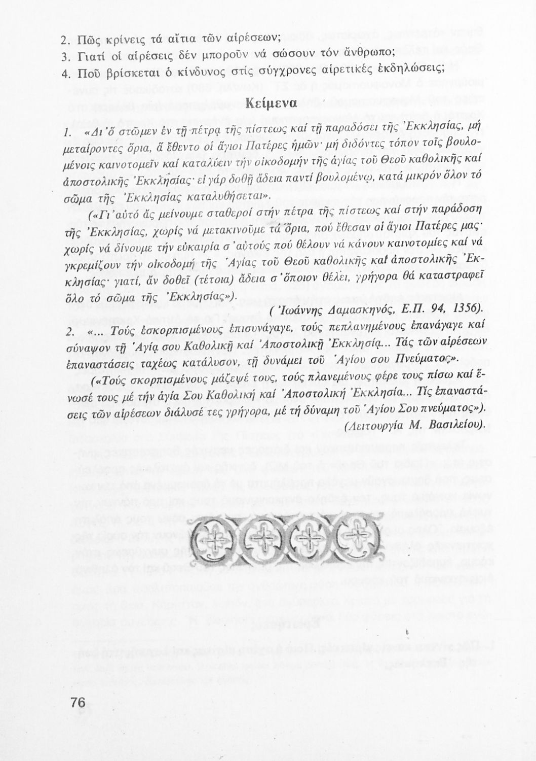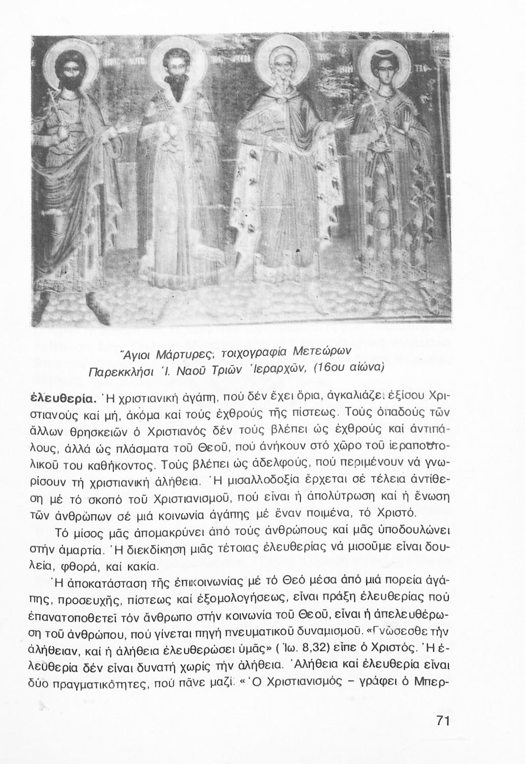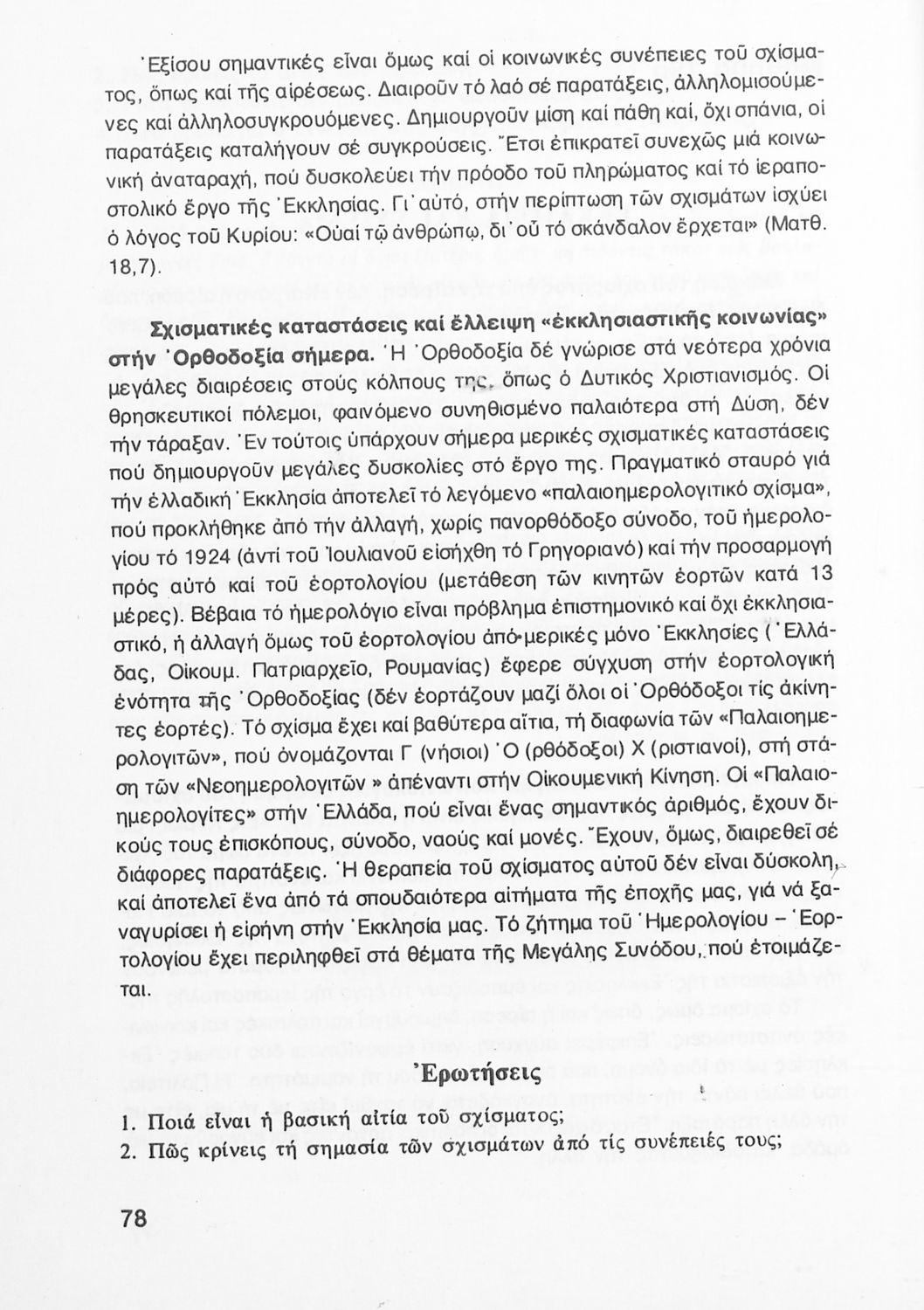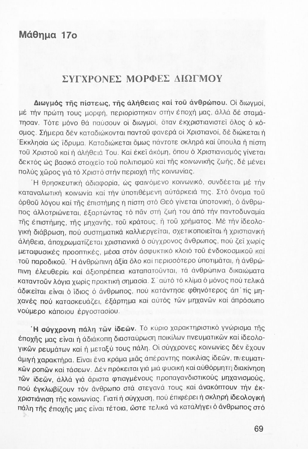 Σχολικό εγχειρίδιο Θρησκευτικών Α΄ Λυκείου που πραγματεύεται εκκλησιολογικά ζητήματα όπως η δομή και η οργάνωση της εκκλησίας και η σχέση της με άλλα δόγματα και αιρέσεις Περιέχει και στοιχεία για την κοινωνική δράση της Εκκλησίας και για τις μορφές της χριστιανικής τέχνης και αναλύει φαινόμενα όπως ο ασκητισμός και ο μοναχισμός.