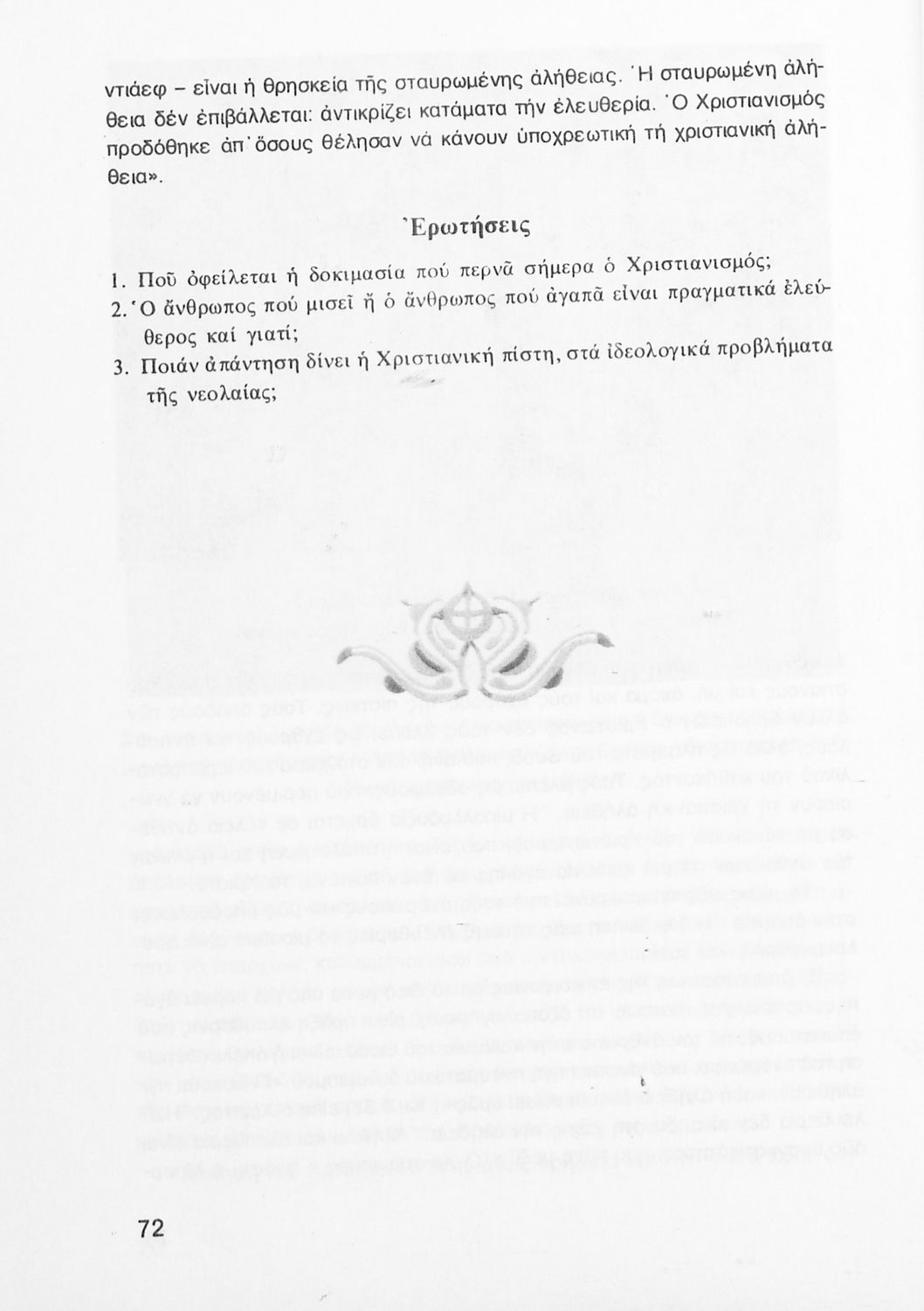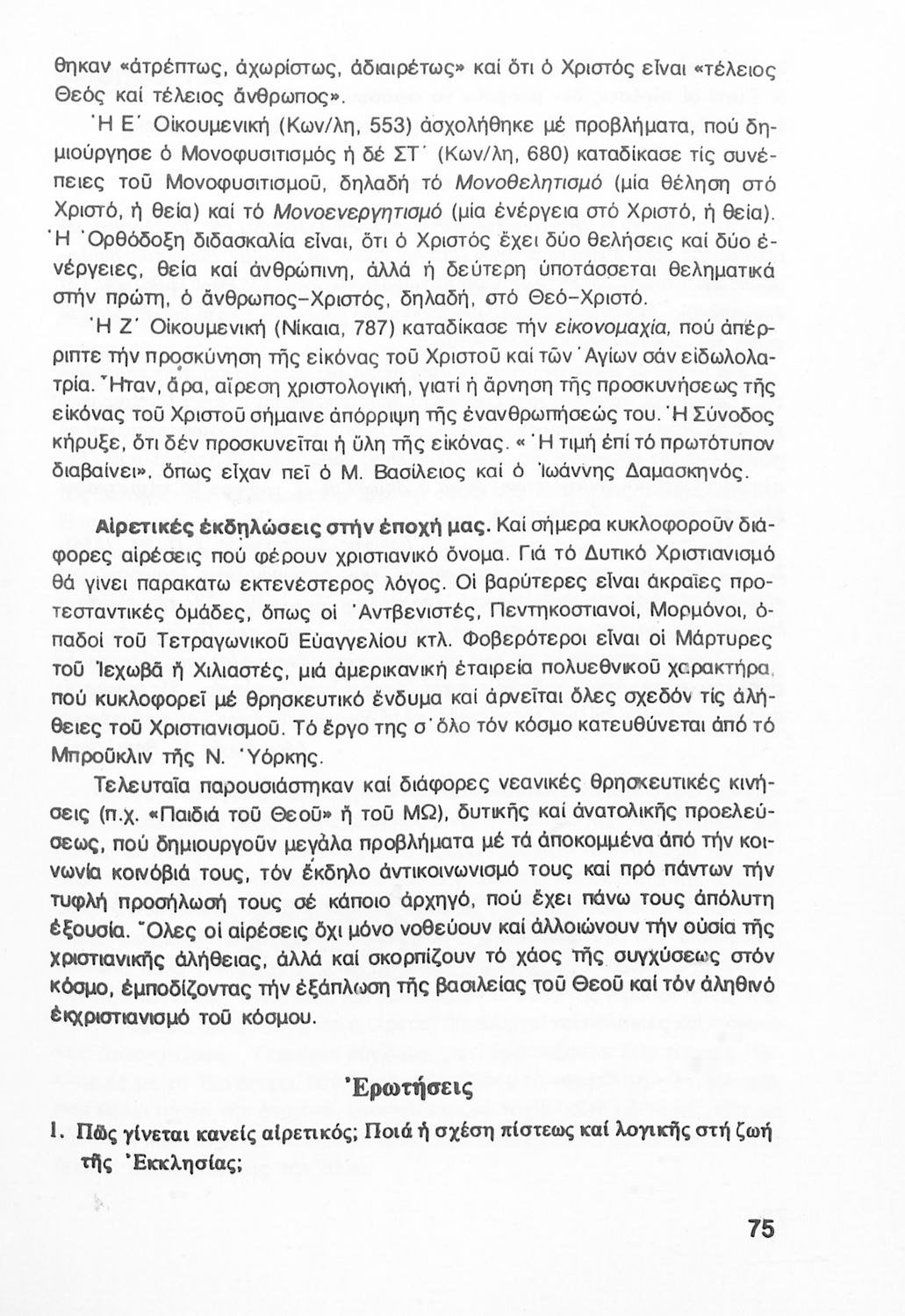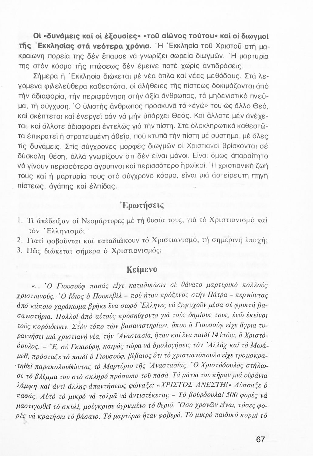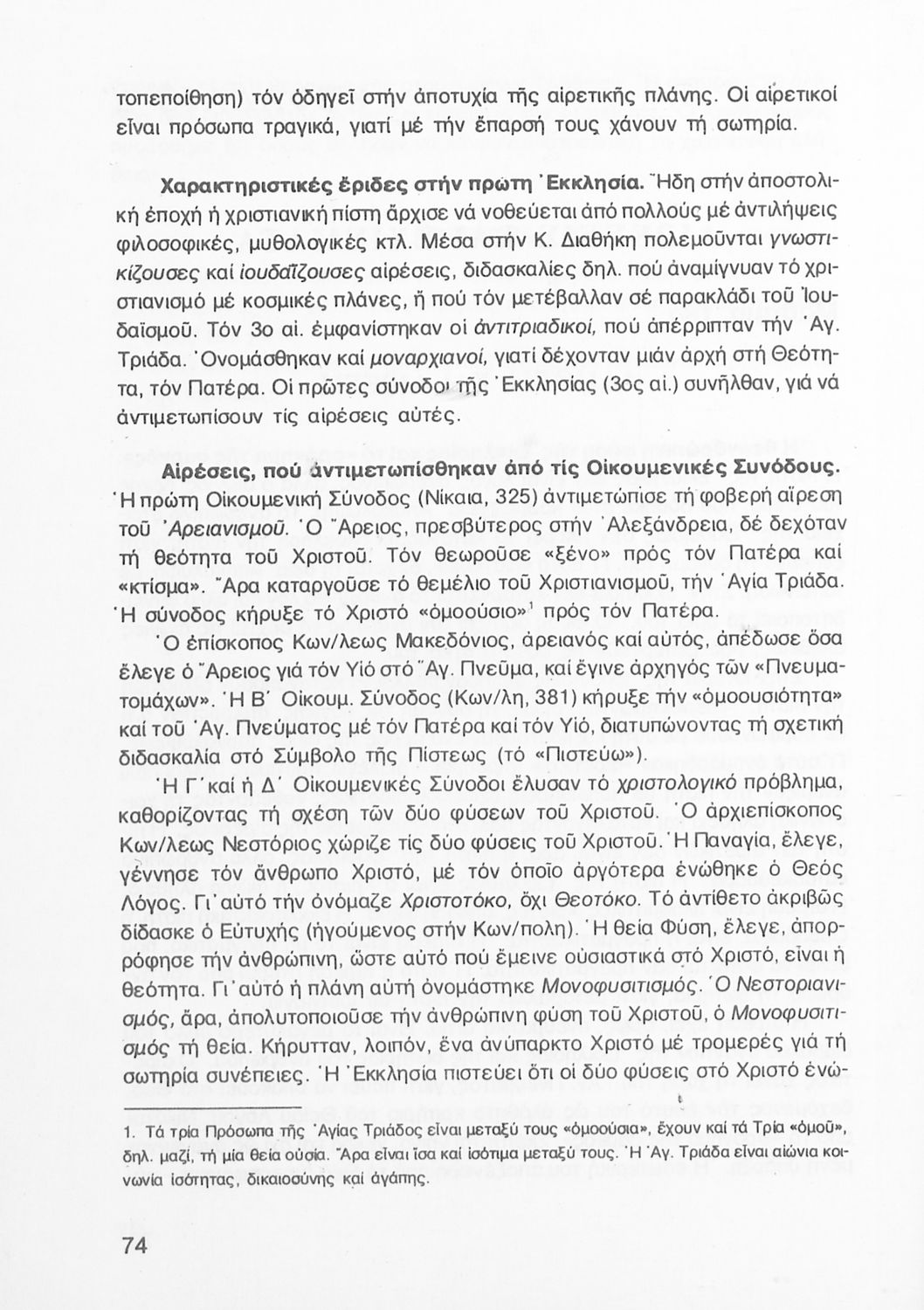 Βαθμίδα εκπαίδευσης: Δευτεροβάθμια Τάξη: Α' Λυκείου Μάθημα: Θρησκευτικά Γλώσσα: Δημοτική Παρουσίαση περιεχομένου: Σχολικό εγχειρίδιο Θρησκευτικών Α΄ Λυκείου που πραγματεύεται εκκλησιολογικά ζητήματα όπως η δομή και η οργάνωση της εκκλησίας και η σχέση της με άλλα δόγματα και αιρέσεις Περιέχει και στοιχεία για την κοινωνική δράση της Εκκλησίας και για τις μορφές της χριστιανικής τέχνης και αναλύει φαινόμενα όπως ο ασκητισμός και ο μοναχισμός. |
