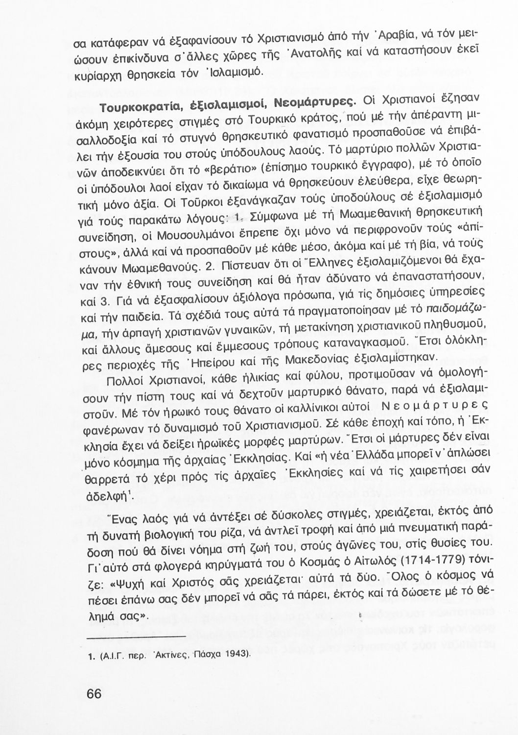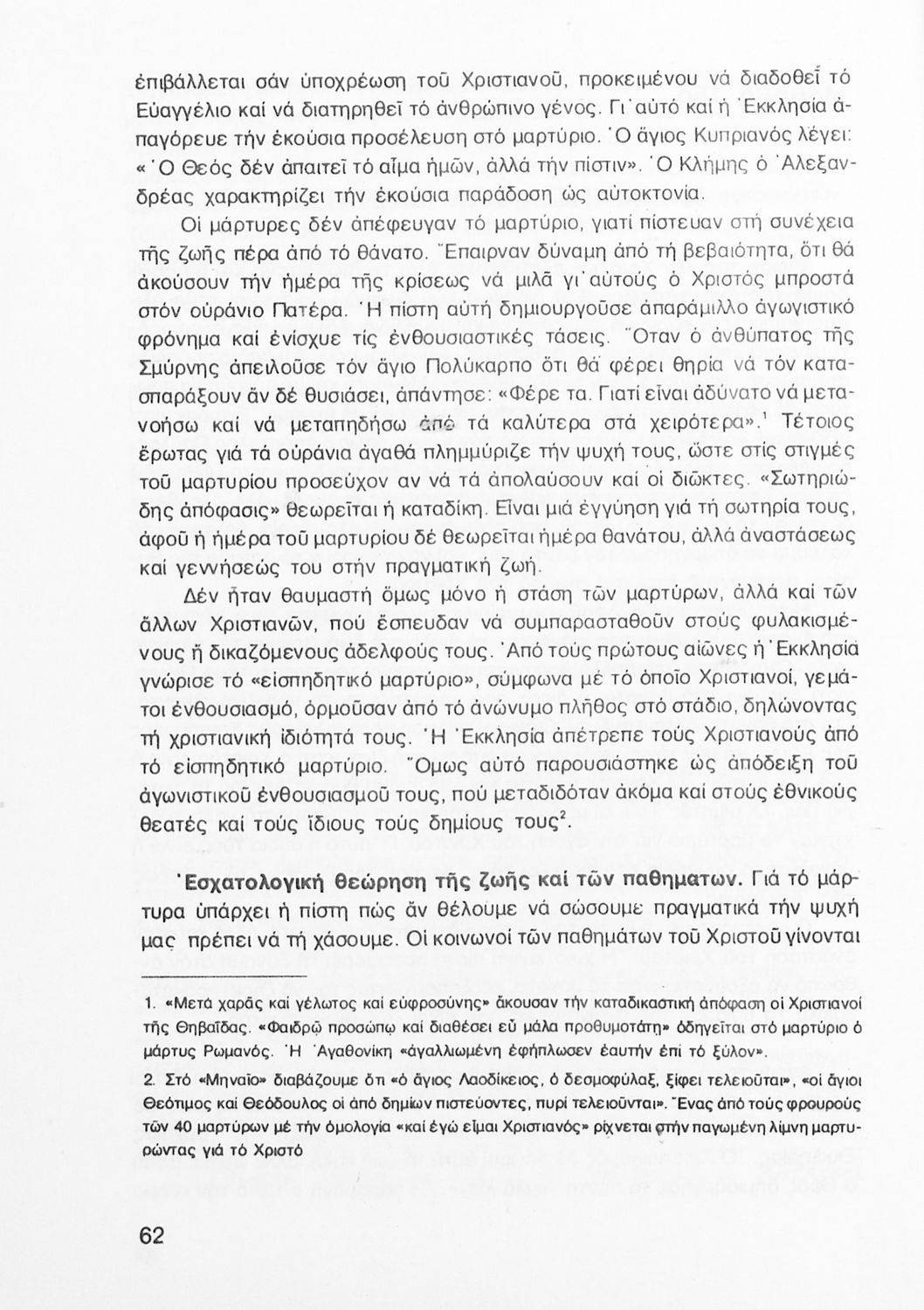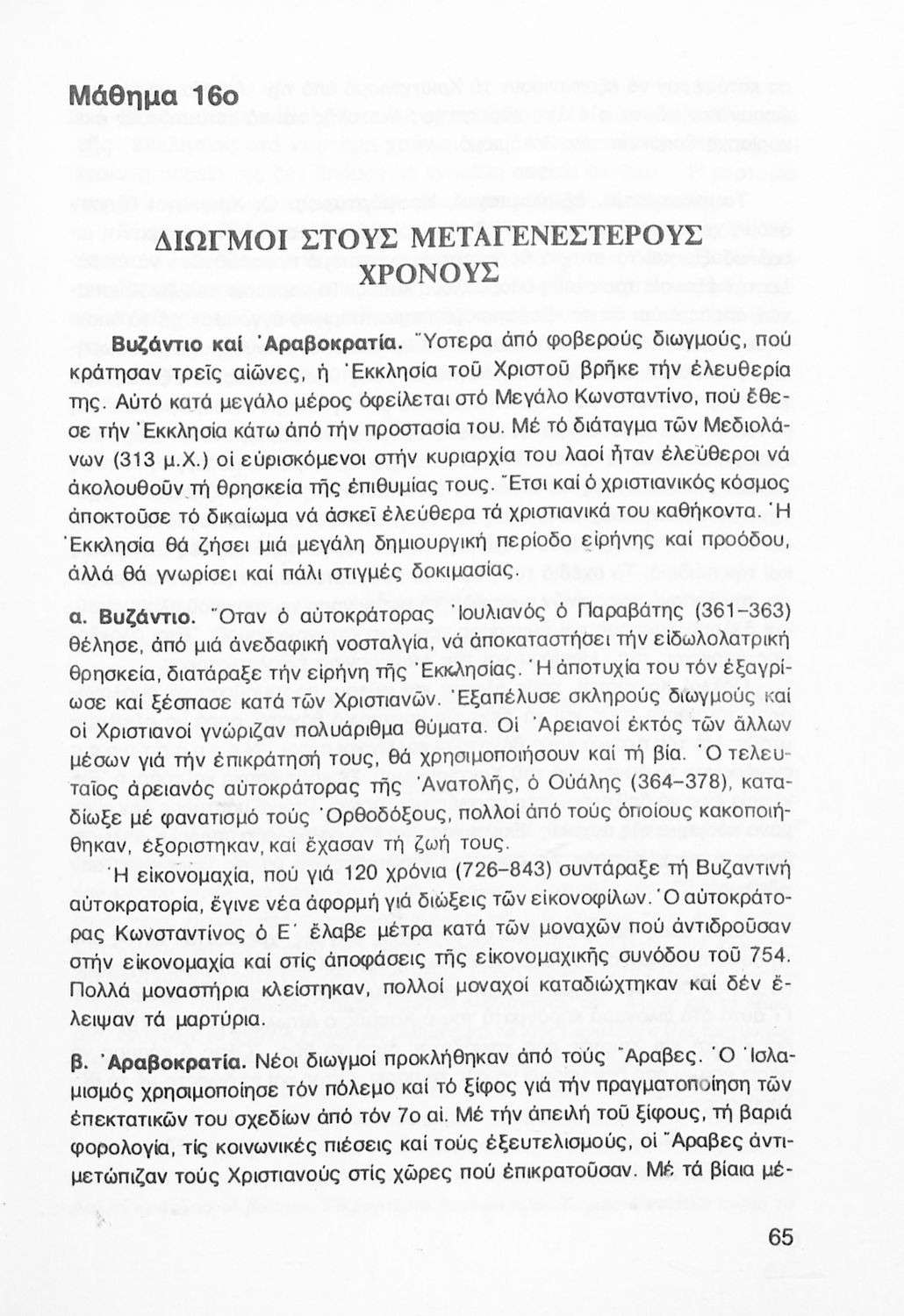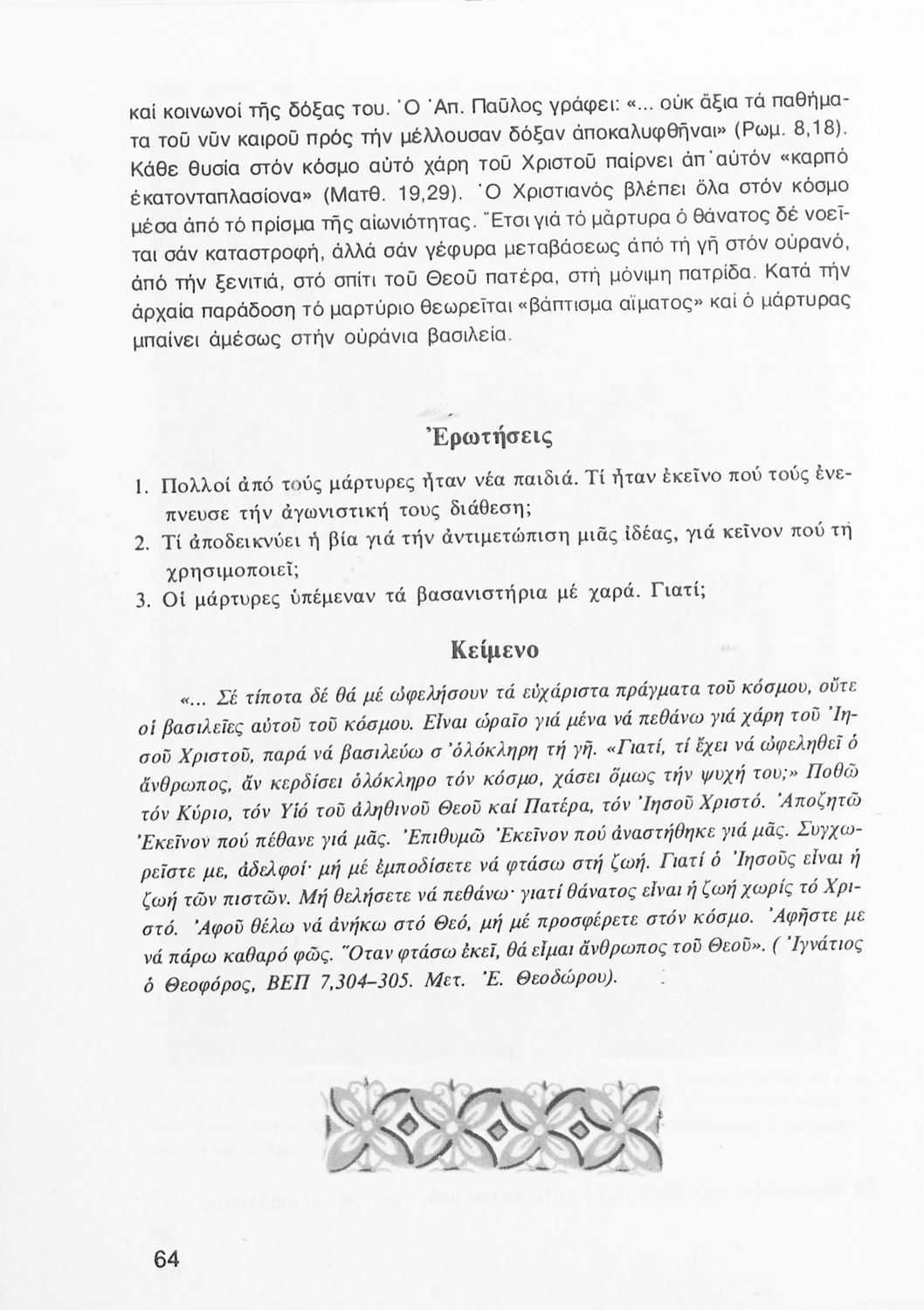 Βαθμίδα εκπαίδευσης: Δευτεροβάθμια Τάξη: Α' Λυκείου Μάθημα: Θρησκευτικά Γλώσσα: Δημοτική Παρουσίαση περιεχομένου: Σχολικό εγχειρίδιο Θρησκευτικών Α΄ Λυκείου που πραγματεύεται εκκλησιολογικά ζητήματα όπως η δομή και η οργάνωση της εκκλησίας και η σχέση της με άλλα δόγματα και αιρέσεις Περιέχει και στοιχεία για την κοινωνική δράση της Εκκλησίας και για τις μορφές της χριστιανικής τέχνης και αναλύει φαινόμενα όπως ο ασκητισμός και ο μοναχισμός. |