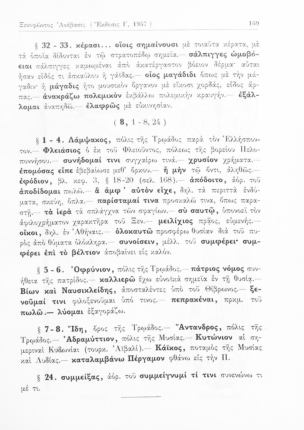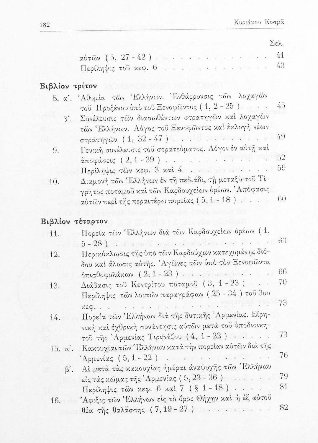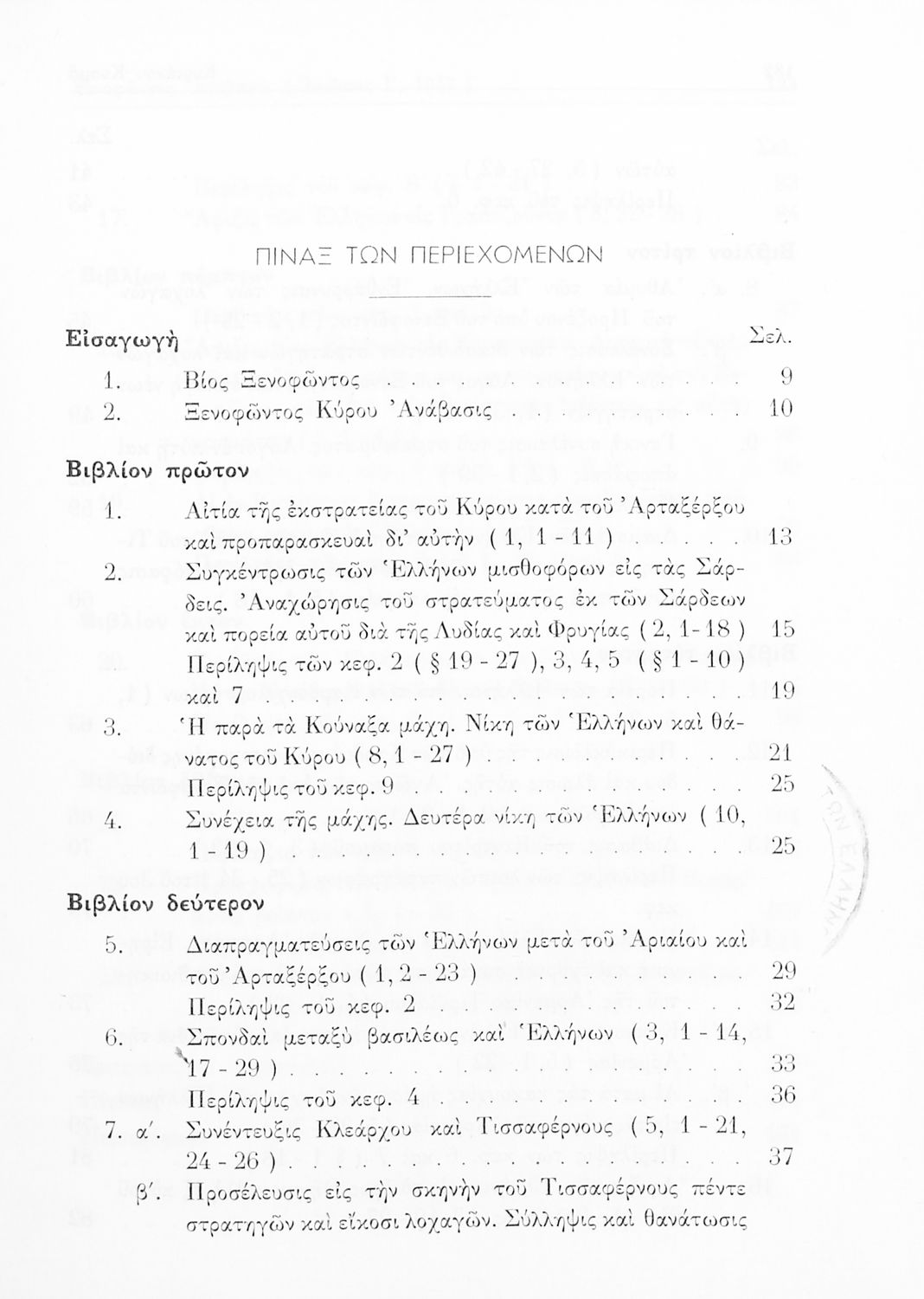 Σχολικό εγχειρίδιο Αρχαίων Ελληνικών για τις τάξεις του Γυμνασίου. Το βιβλίο αναφέρεται στην ιστορική συγγραφή του Ξενοφώντα για την εκστρατεία του Κύρου κατά του Αρταξέρξη και την κάθοδο των Μυρίων. Στο δεύτερο μέρος το βιβλίο περιέχει τα “Ελληνικά” του Ξενοφώντα που αφορούν την ιστορία των τελευταίων επτά ετών του Πελοποννησιακού πολέμου και τα συμβάντα από το τέλος του Πελοποννησιακού πολέμου μέχρι τη μάχη της Μαντινείας.