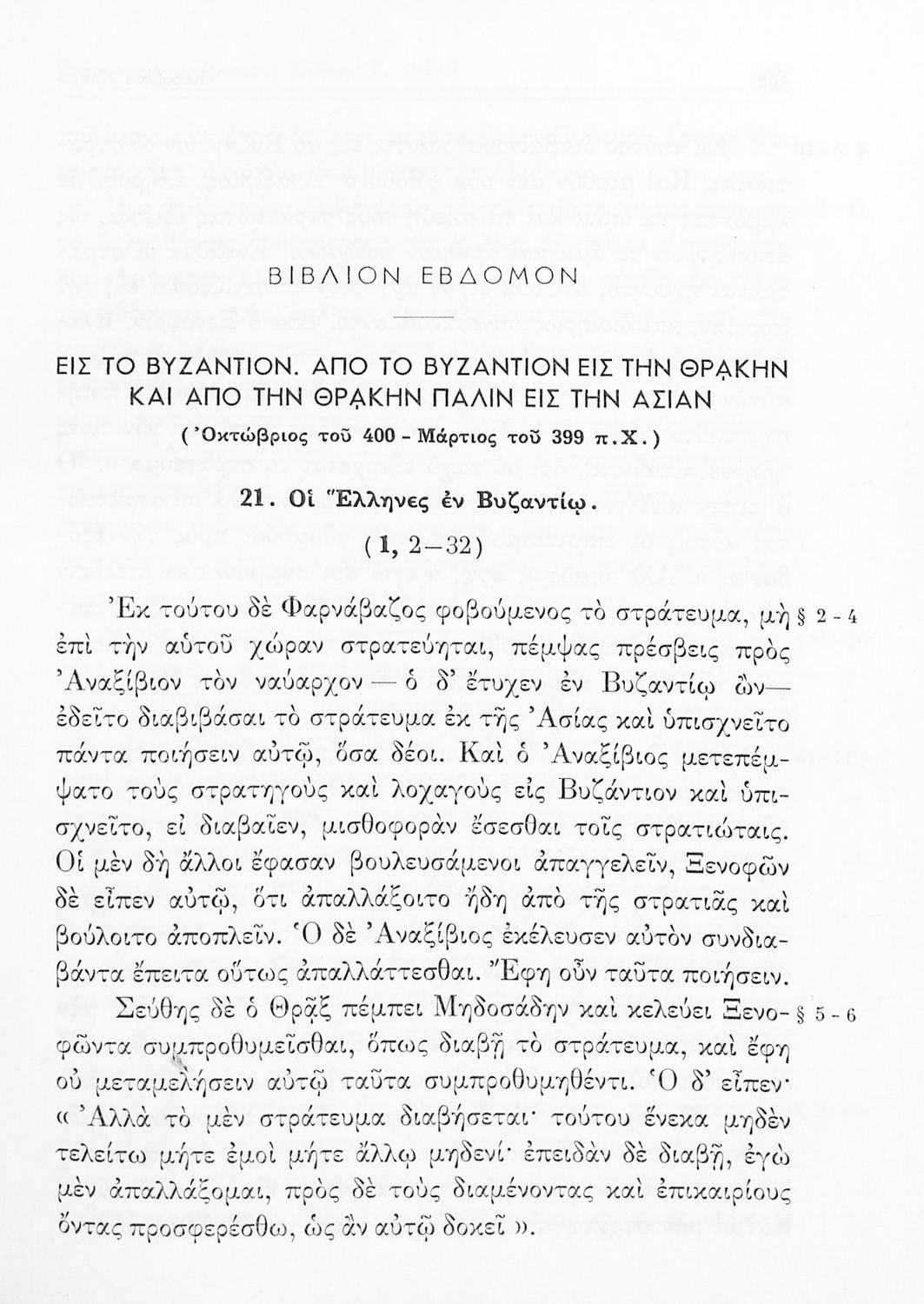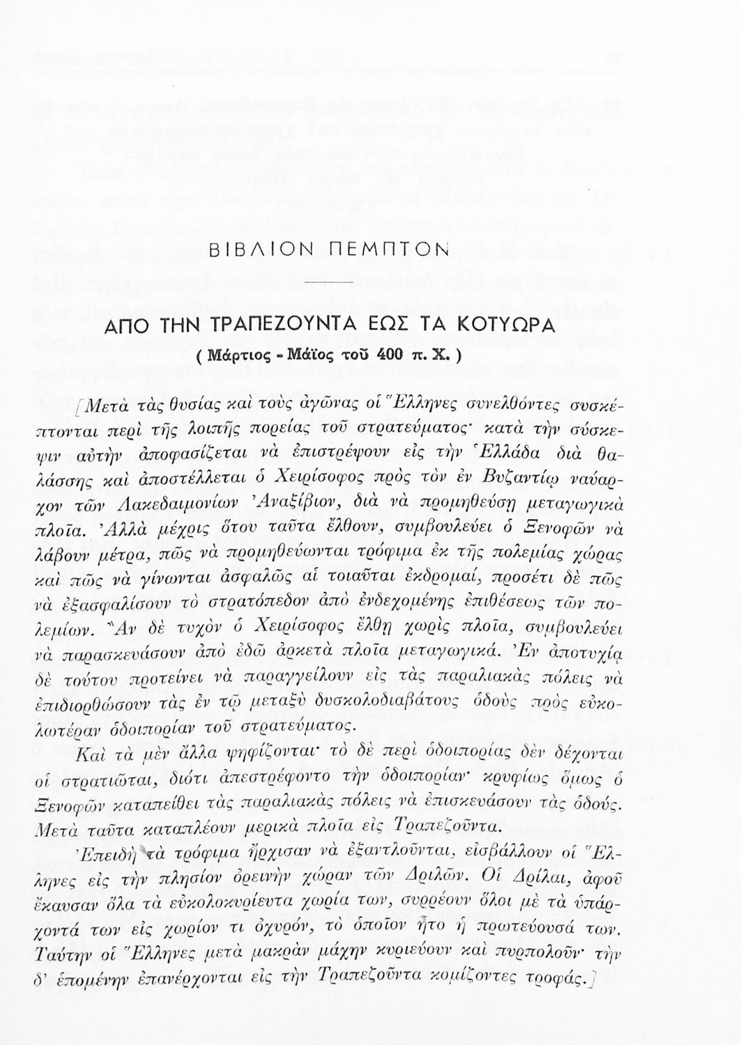Σχολικό εγχειρίδιο Αρχαίων Ελληνικών για τις τάξεις του Γυμνασίου. Το βιβλίο αναφέρεται στην ιστορική συγγραφή του Ξενοφώντα για την εκστρατεία του Κύρου κατά του Αρταξέρξη και την κάθοδο των Μυρίων. Στο δεύτερο μέρος το βιβλίο περιέχει τα “Ελληνικά” του Ξενοφώντα που αφορούν την ιστορία των τελευταίων επτά ετών του Πελοποννησιακού πολέμου και τα συμβάντα από το τέλος του Πελοποννησιακού πολέμου μέχρι τη μάχη της Μαντινείας.