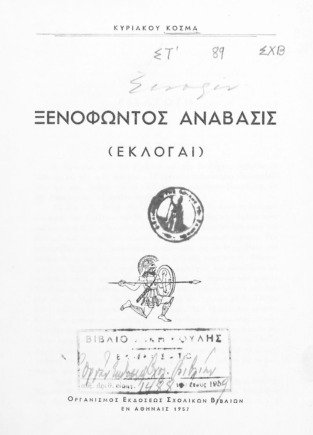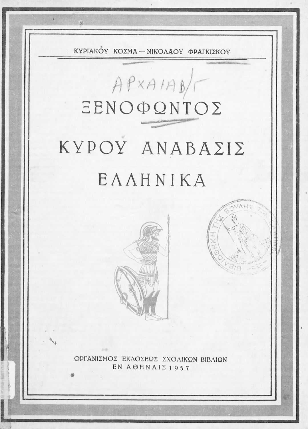 Σχολικό εγχειρίδιο Αρχαίων Ελληνικών για τη Β΄ Γυμνασίου. Πρόκειται για βιβλίο αρχαίων σε μετάφραση από το έργο του Ξενοφώντα. Στο βιβλίο απεικονίζεται το σύμβολο της επταετίας.