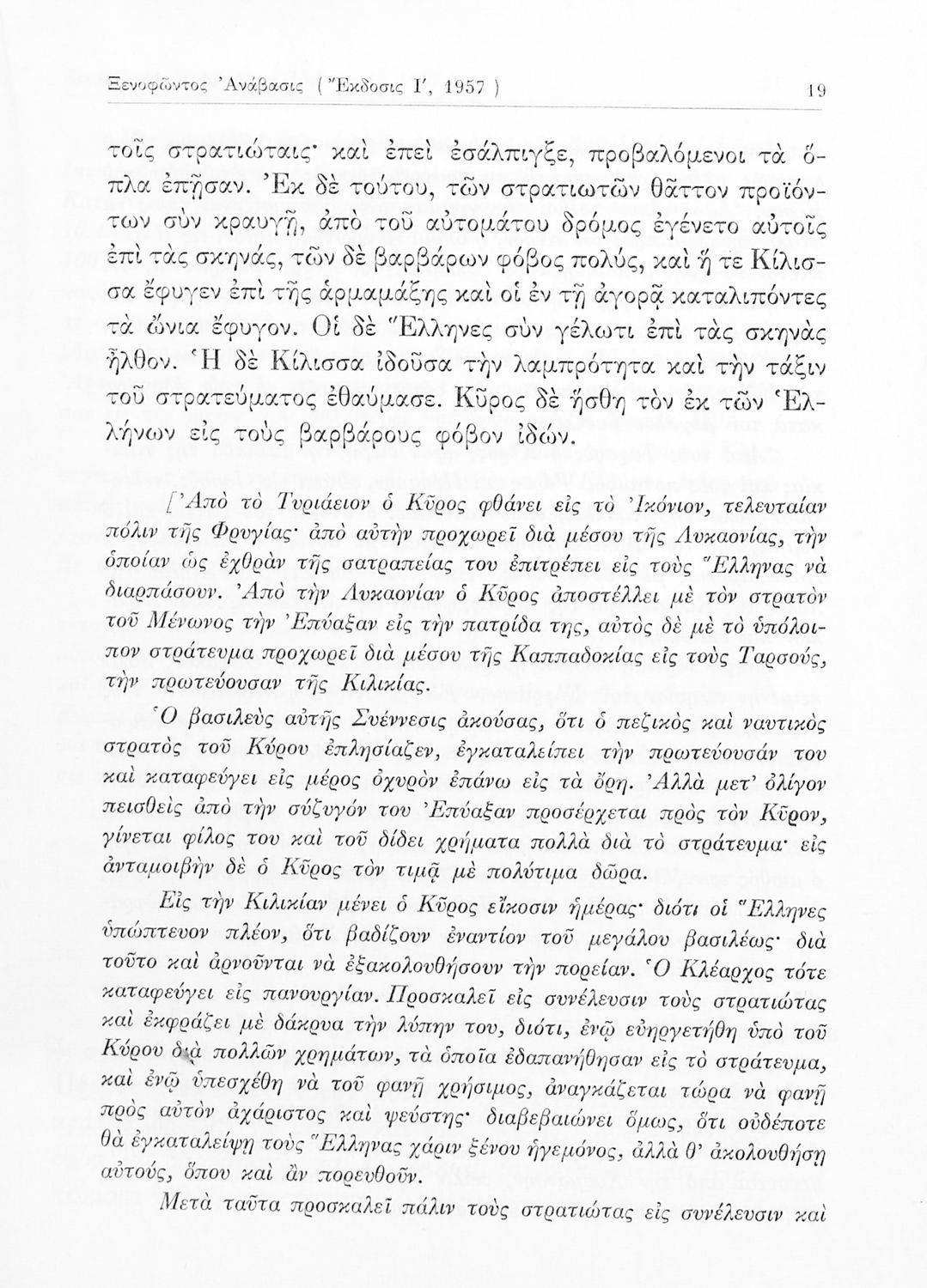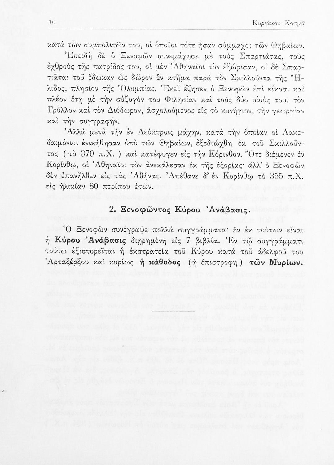 Σχολικό εγχειρίδιο Αρχαίων Ελληνικών για τις τάξεις του Γυμνασίου. Το βιβλίο αναφέρεται στην ιστορική συγγραφή του Ξενοφώντα για την εκστρατεία του Κύρου κατά του Αρταξέρξη και την κάθοδο των Μυρίων. Στο δεύτερο μέρος το βιβλίο περιέχει τα “Ελληνικά” του Ξενοφώντα που αφορούν την ιστορία των τελευταίων επτά ετών του Πελοποννησιακού πολέμου και τα συμβάντα από το τέλος του Πελοποννησιακού πολέμου μέχρι τη μάχη της Μαντινείας.