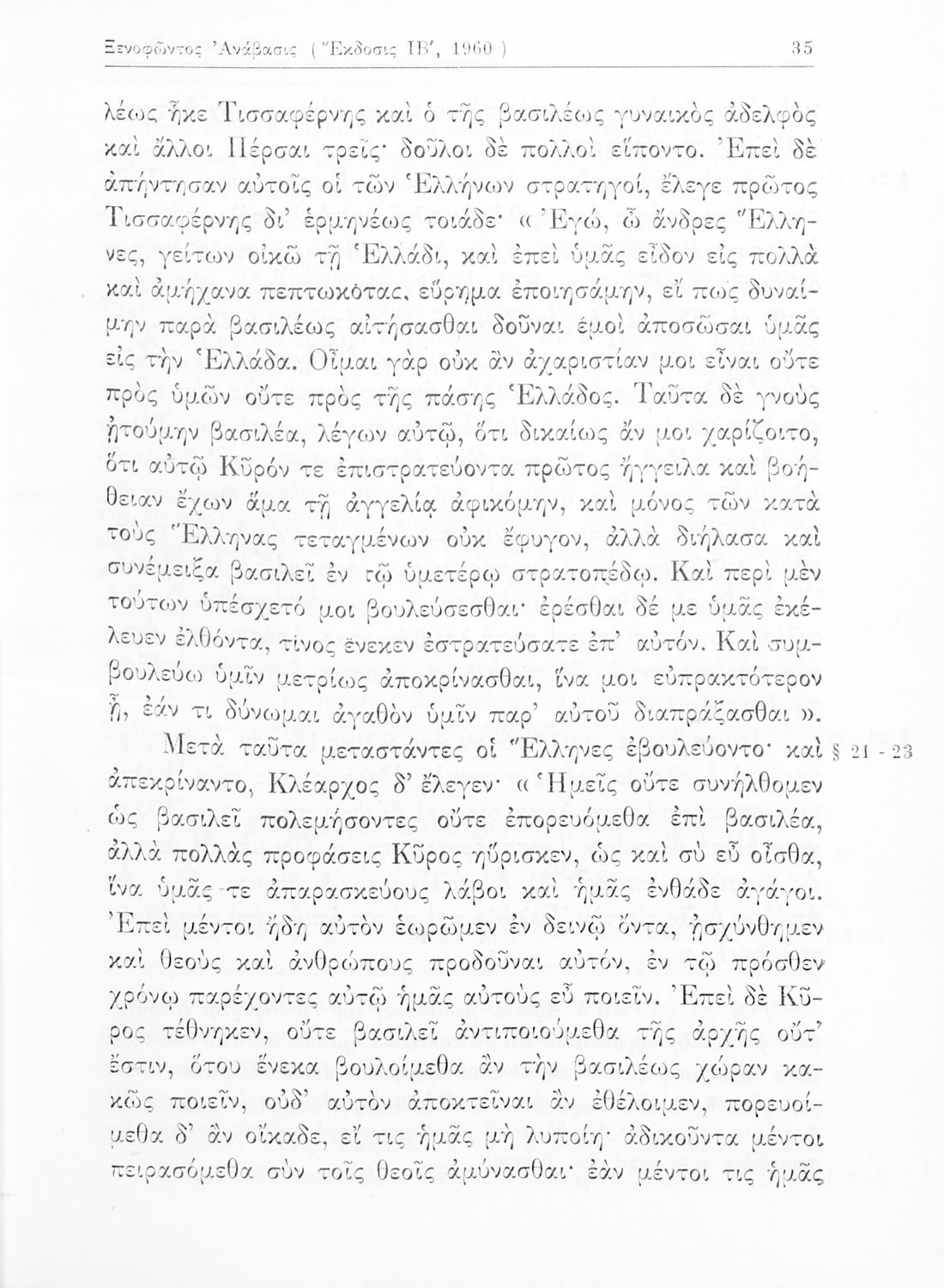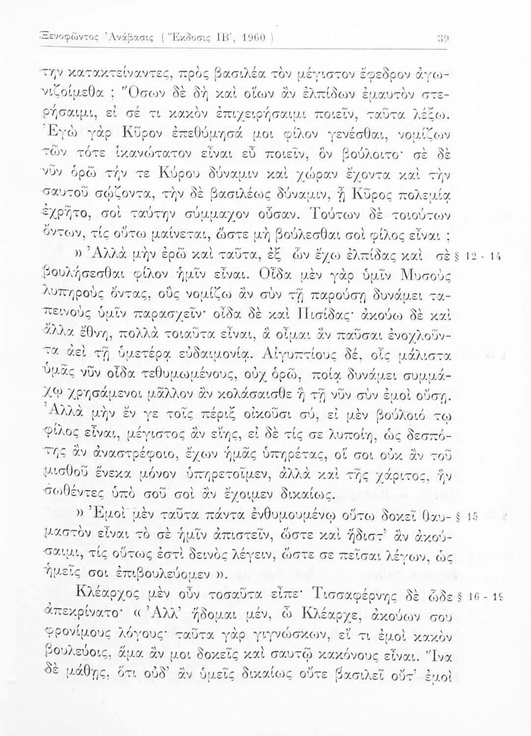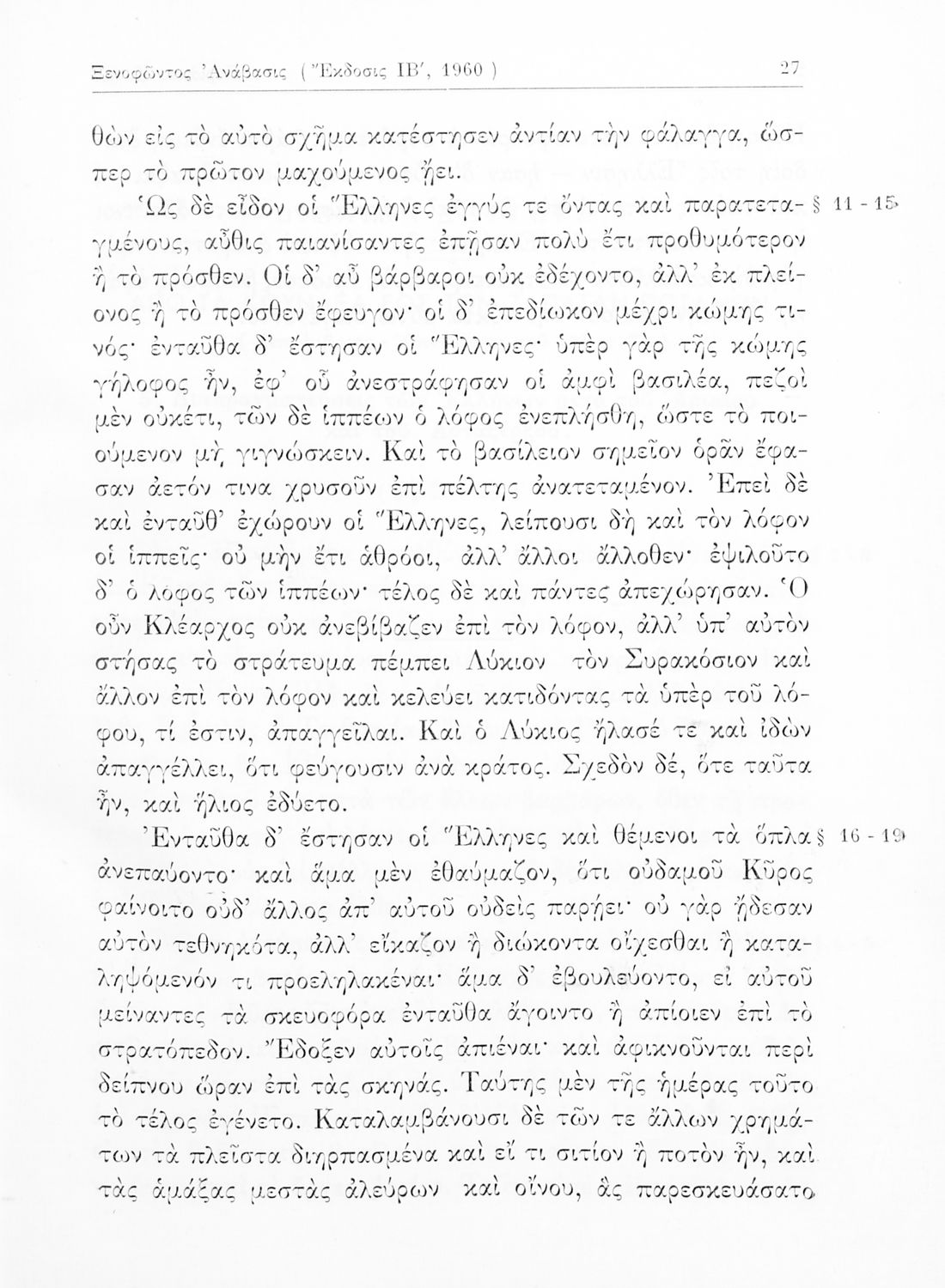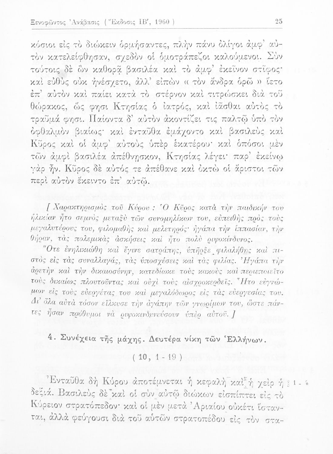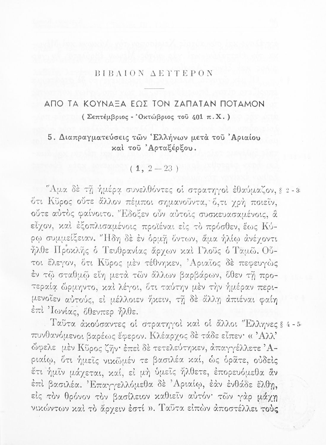 Σχολικό Εγχειρίδιο Αρχαίων Ελληνικών της Β' Γυμνασίου. Το βιβλίο αναφέρεται στο σύγγραμμα του Ξενοφώντα για την εκστρατεία του Κύρου κατά του Αρταξέρξη και κυρίως την κάθοδο ( επιστροφή) των Μυρίων. Στο δεύτερο μέρος το βιβλίο περιέχει τα “Ελληνικά” του Ξενοφώντα που αφορούν την ιστορία των τελευταίων επτά ετών του Πελοποννησιακού πολέμου και τα συμβάντα από το τέλος του Πελοποννησιακού πολέμου μέχρι τη μάχη της Μαντινείας.