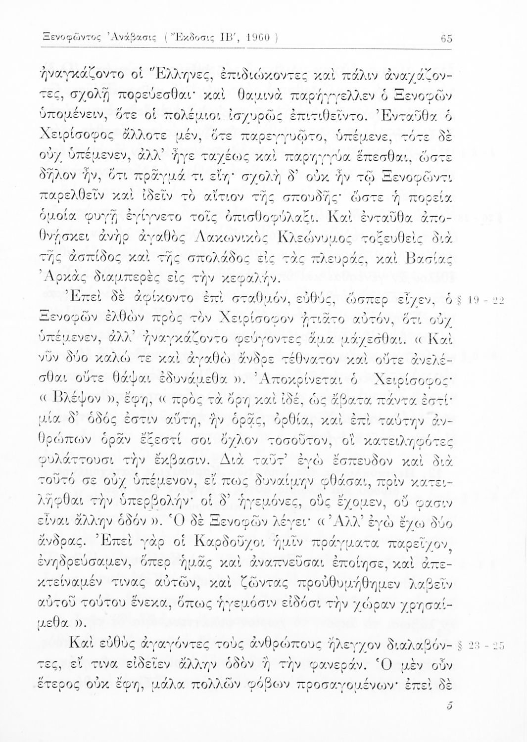 Σχολικό Εγχειρίδιο Αρχαίων Ελληνικών της Β' Γυμνασίου. Το βιβλίο αναφέρεται στο σύγγραμμα του Ξενοφώντα για την εκστρατεία του Κύρου κατά του Αρταξέρξη και κυρίως την κάθοδο ( επιστροφή) των Μυρίων. Στο δεύτερο μέρος το βιβλίο περιέχει τα “Ελληνικά” του Ξενοφώντα που αφορούν την ιστορία των τελευταίων επτά ετών του Πελοποννησιακού πολέμου και τα συμβάντα από το τέλος του Πελοποννησιακού πολέμου μέχρι τη μάχη της Μαντινείας.