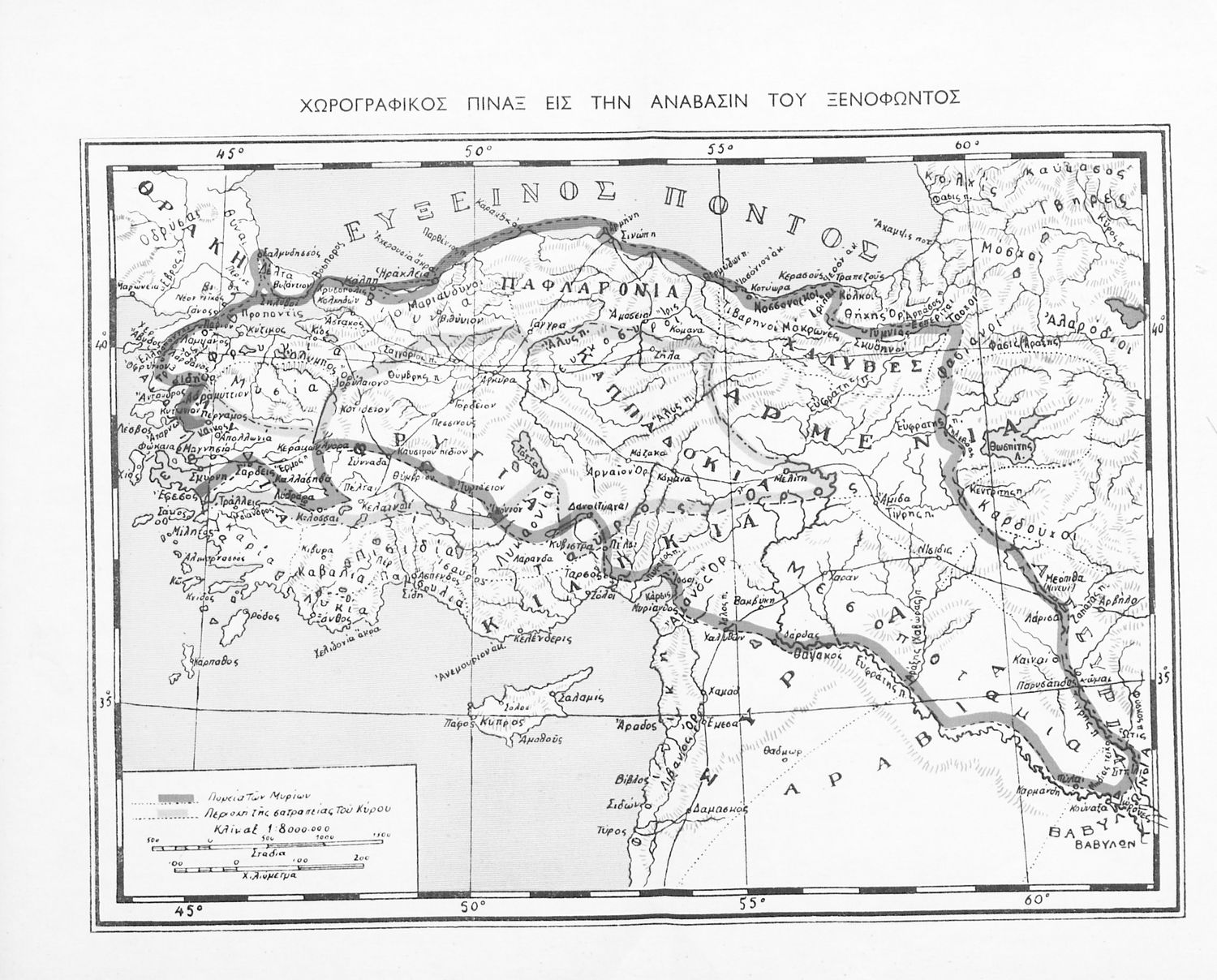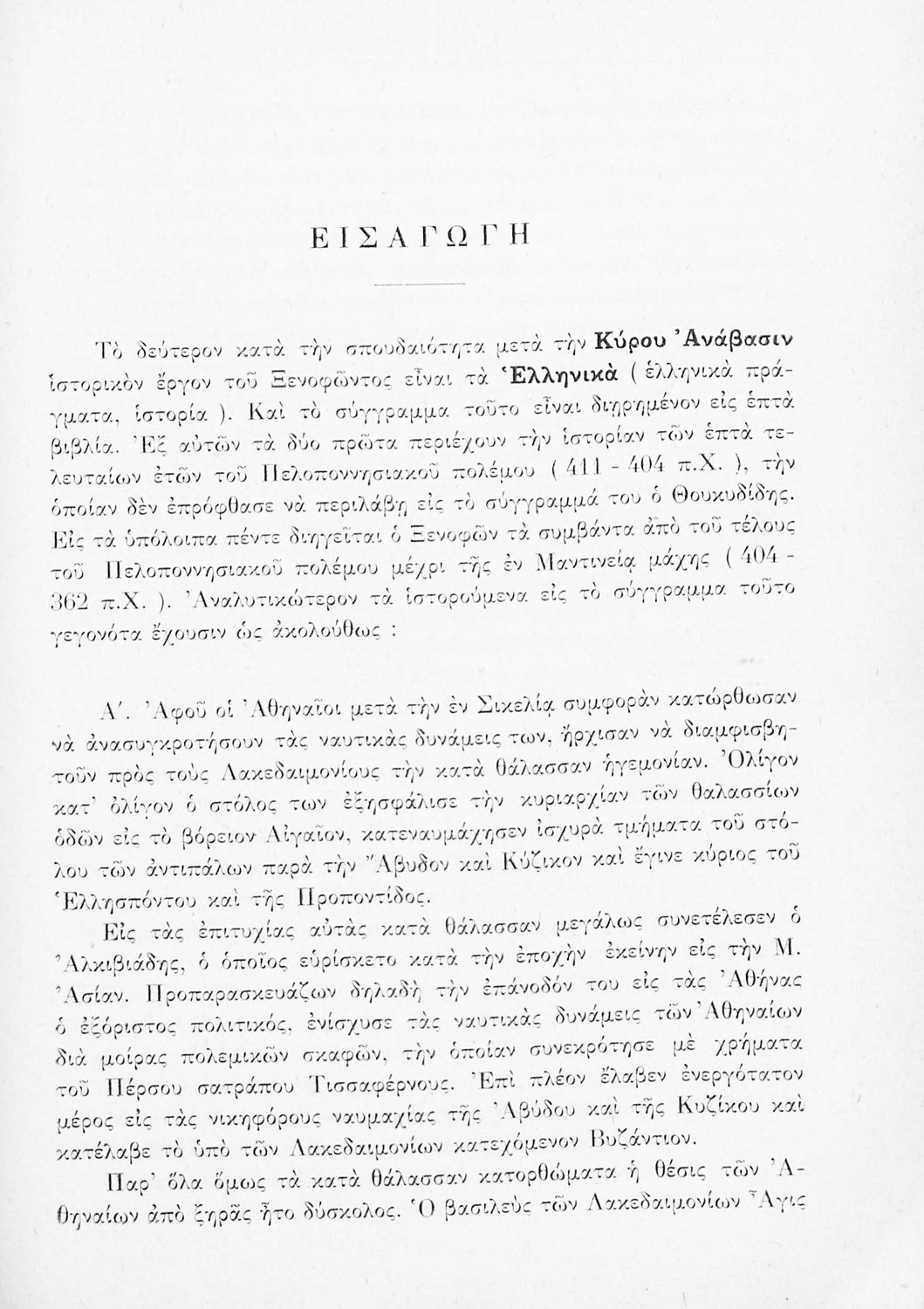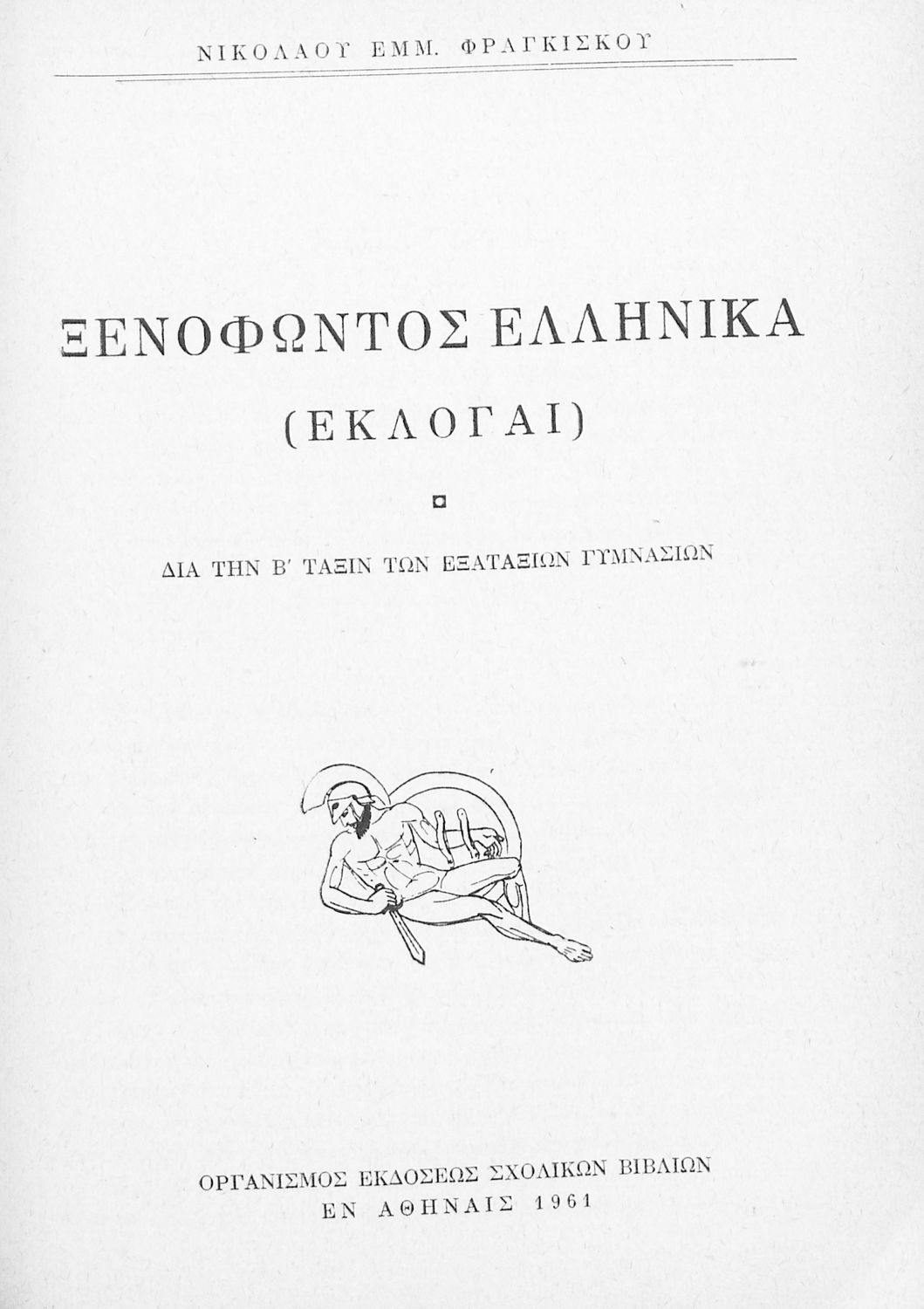 Σχολικό εγχειρίδιο Αρχαίων Ελληνικών της Β΄ Γυμνασίου. Παρουσιάζεται η εκστρατεία του Κύρου κατά του Αρταξέρξη και η κάθοδος των Μυρίων. Το δεύτερο μέρος το βιβλίο περιέχει τα “Ελληνικά” του Ξενοφώντα όπου εξιστορείται η ιστορία των τελευταίων επτά ετών του Πελοποννησιακού πολέμου και τα συμβάντα από το τέλος του Πελοποννησιακού πολέμου μέχρι τη μάχη της Μαντινείας.