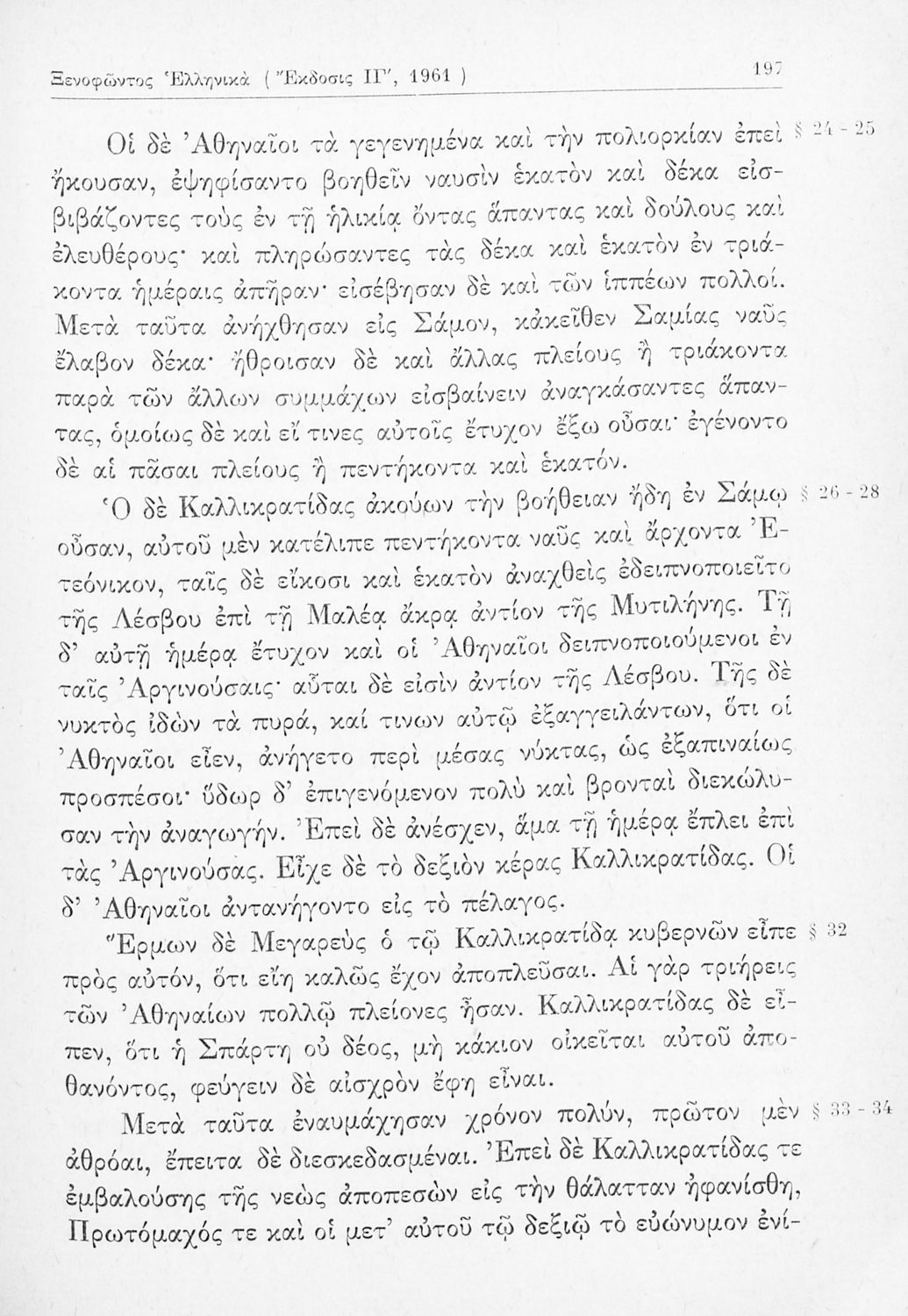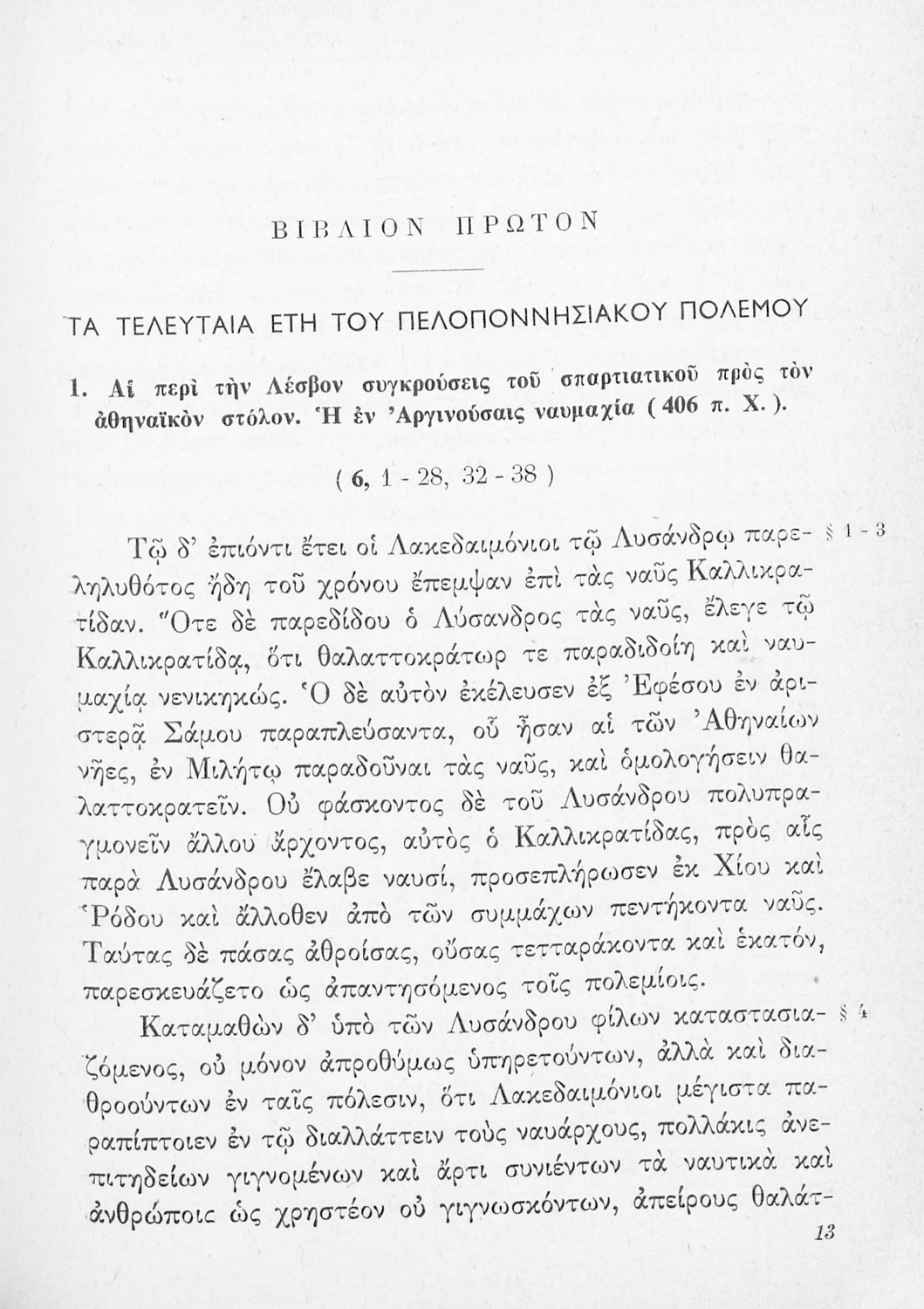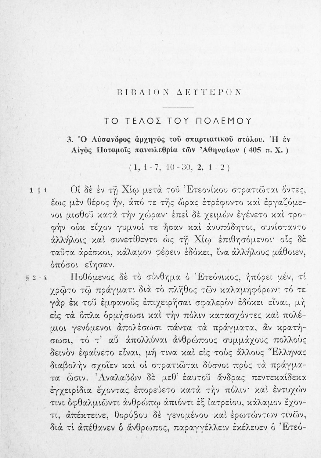 Σχολικό εγχειρίδιο Αρχαίων Ελληνικών Β΄ Γυμνασίου που περιλαμβάνει εισαγωγή στα Ελληνικά του Ξενοφώντα, το 3ο και το 4ο βιβλίο από τα Ελληνικά, ερμηνευτικές σημειώσεις και χωρογραφικό πίνακα της περιοχής.