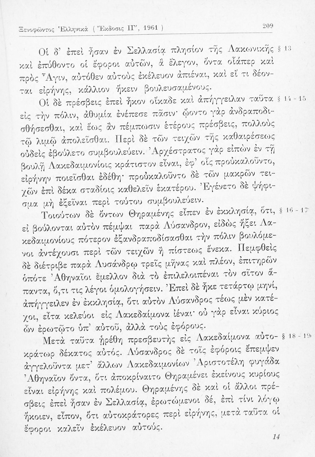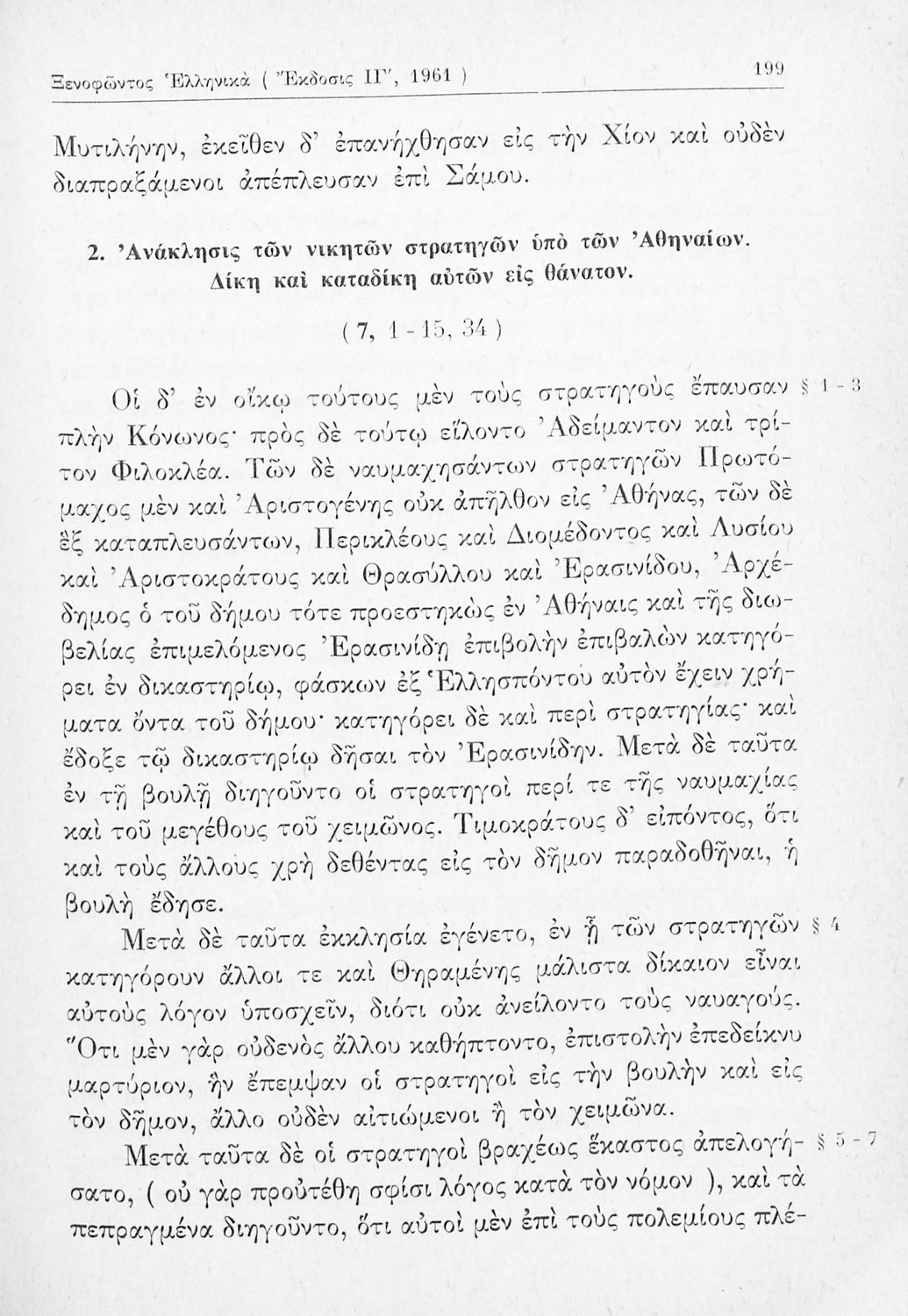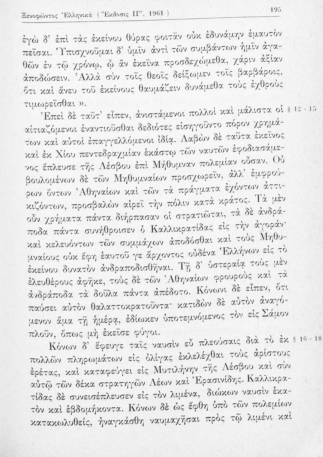 Σχολικό εγχειρίδιο Αρχαίων Ελληνικών Β΄ Γυμνασίου που περιλαμβάνει εισαγωγή στα Ελληνικά του Ξενοφώντα, το 3ο και το 4ο βιβλίο από τα Ελληνικά, ερμηνευτικές σημειώσεις και χωρογραφικό πίνακα της περιοχής.