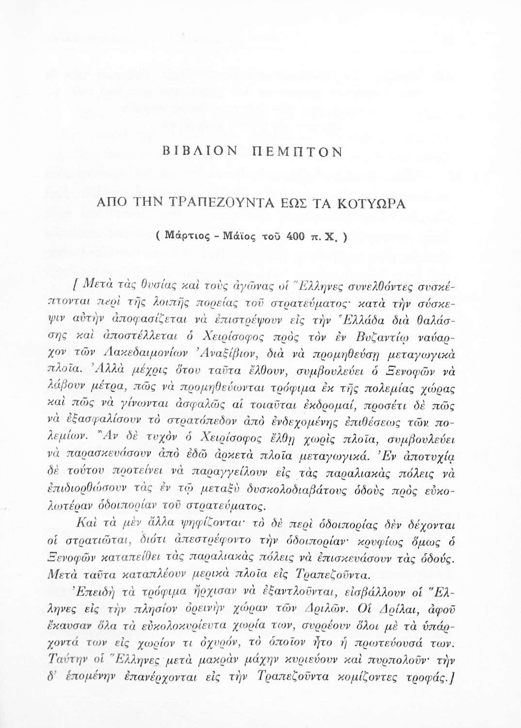 Σχολικό εγχειρίδιο Αρχαίων Ελληνικών του Γυμνασίου. Το βιβλίο αναφέρεται στην ιστορική συγγραφή του Ξενοφώντα για την εκστρατεία του Κύρου κατά του Αρταξέρξη και την κάθοδο των Μυρίων. Στο δεύτερο μέρος το βιβλίο περιέχει τα “Ελληνικά” του Ξενοφώντα που αφορούν την ιστορία των τελευταίων επτά ετών του Πελοποννησιακού πολέμου και τα συμβάντα από το τέλος του Πελοποννησιακού πολέμου μέχρι τη μάχη της Μαντινείας.