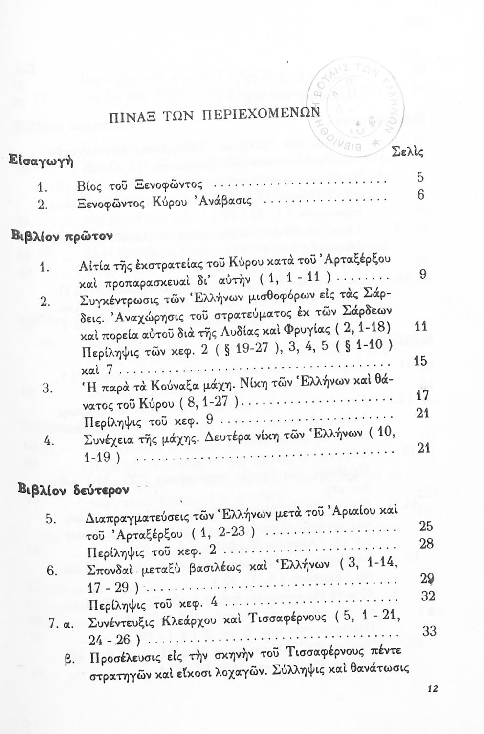 Σχολικό Εγχειρίδιο Αρχαίων Ελληνικών της Β' Γυμνασίου. Το βιβλίο αναφέρεται στην ιστορική συγγραφή του Ξενοφώντα για την εκστρατεία του Κύρου κατά του Αρταξέρξη και κυρίως την κάθοδο ( επιστροφή) των Μυρίων. Στο δεύτερο μέρος το βιβλίο περιέχει τα “Ελληνικά” του Ξενοφώντα που αφορούν την ιστορία των τελευταίων επτά ετών του Πελοποννησιακού πολέμου και τα συμβάντα από το τέλος του Πελοποννησιακού πολέμου μέχρι τη μάχη της Μαντινείας.