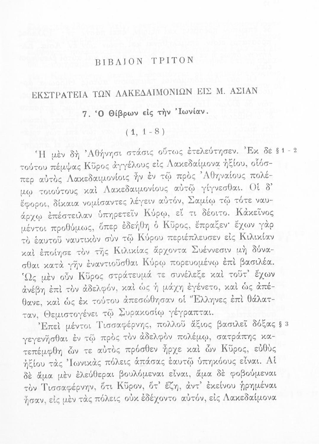 Σχολικό Εγχειρίδιο Αρχαίων Ελληνικών της Β' Γυμνασίου. Το βιβλίο αναφέρεται στην ιστορική συγγραφή του Ξενοφώντα για την εκστρατεία του Κύρου κατά του Αρταξέρξη και κυρίως την κάθοδο ( επιστροφή) των Μυρίων. Στο δεύτερο μέρος το βιβλίο περιέχει τα “Ελληνικά” του Ξενοφώντα που αφορούν την ιστορία των τελευταίων επτά ετών του Πελοποννησιακού πολέμου και τα συμβάντα από το τέλος του Πελοποννησιακού πολέμου μέχρι τη μάχη της Μαντινείας.