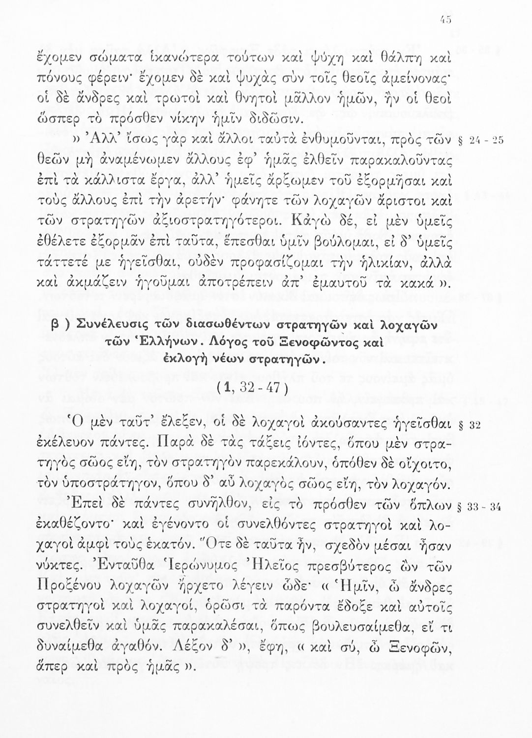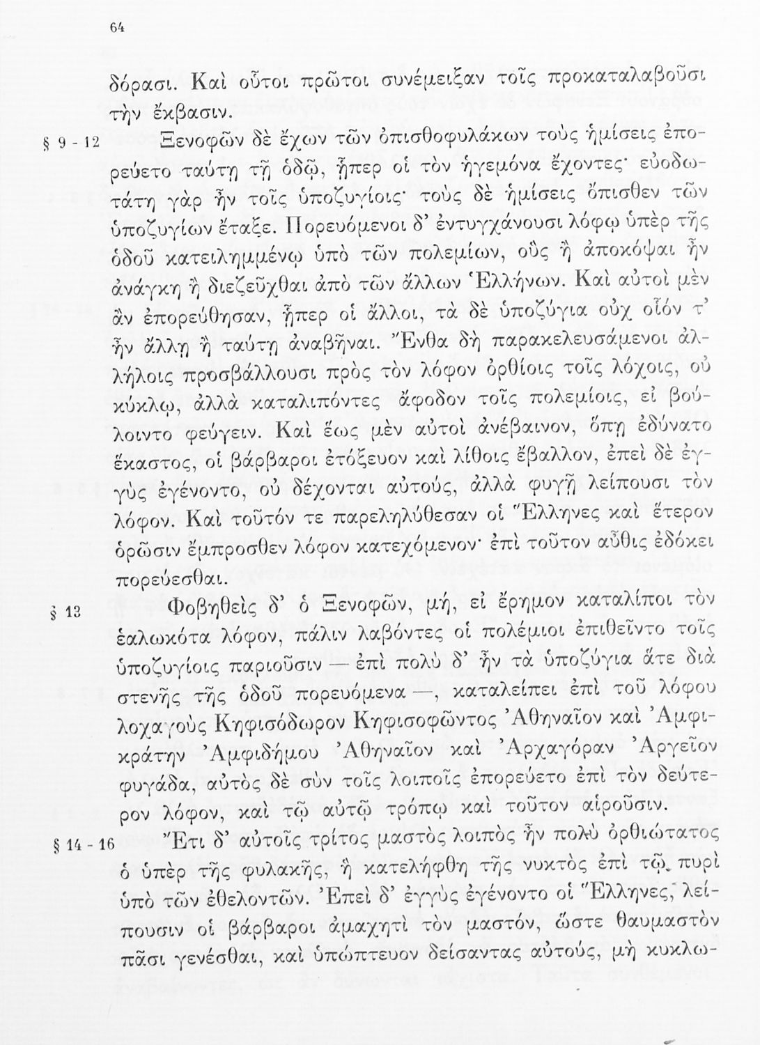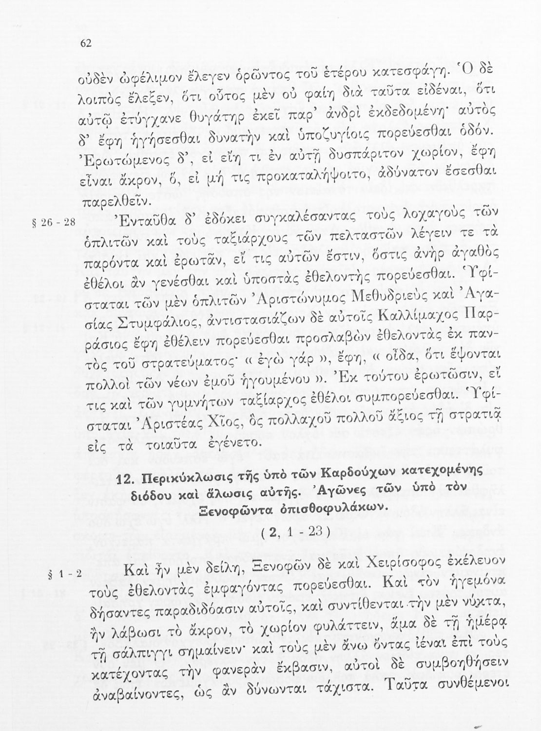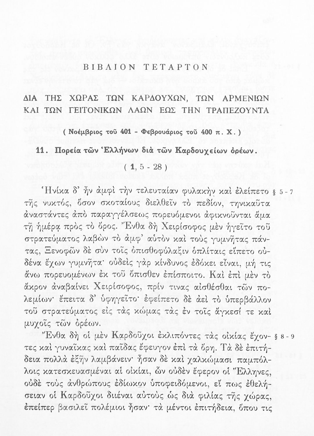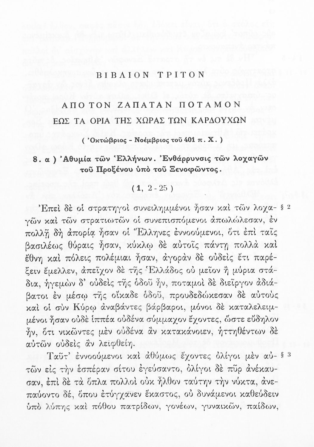 Σχολικό Εγχειρίδιο Αρχαίων Ελληνικών της Β' Γυμνασίου. Το βιβλίο αναφέρεται στην ιστορική συγγραφή του Ξενοφώντα για την εκστρατεία του Κύρου κατά του Αρταξέρξη και κυρίως την κάθοδο ( επιστροφή) των Μυρίων. Στο δεύτερο μέρος το βιβλίο περιέχει τα “Ελληνικά” του Ξενοφώντα που αφορούν την ιστορία των τελευταίων επτά ετών του Πελοποννησιακού πολέμου και τα συμβάντα από το τέλος του Πελοποννησιακού πολέμου μέχρι τη μάχη της Μαντινείας.