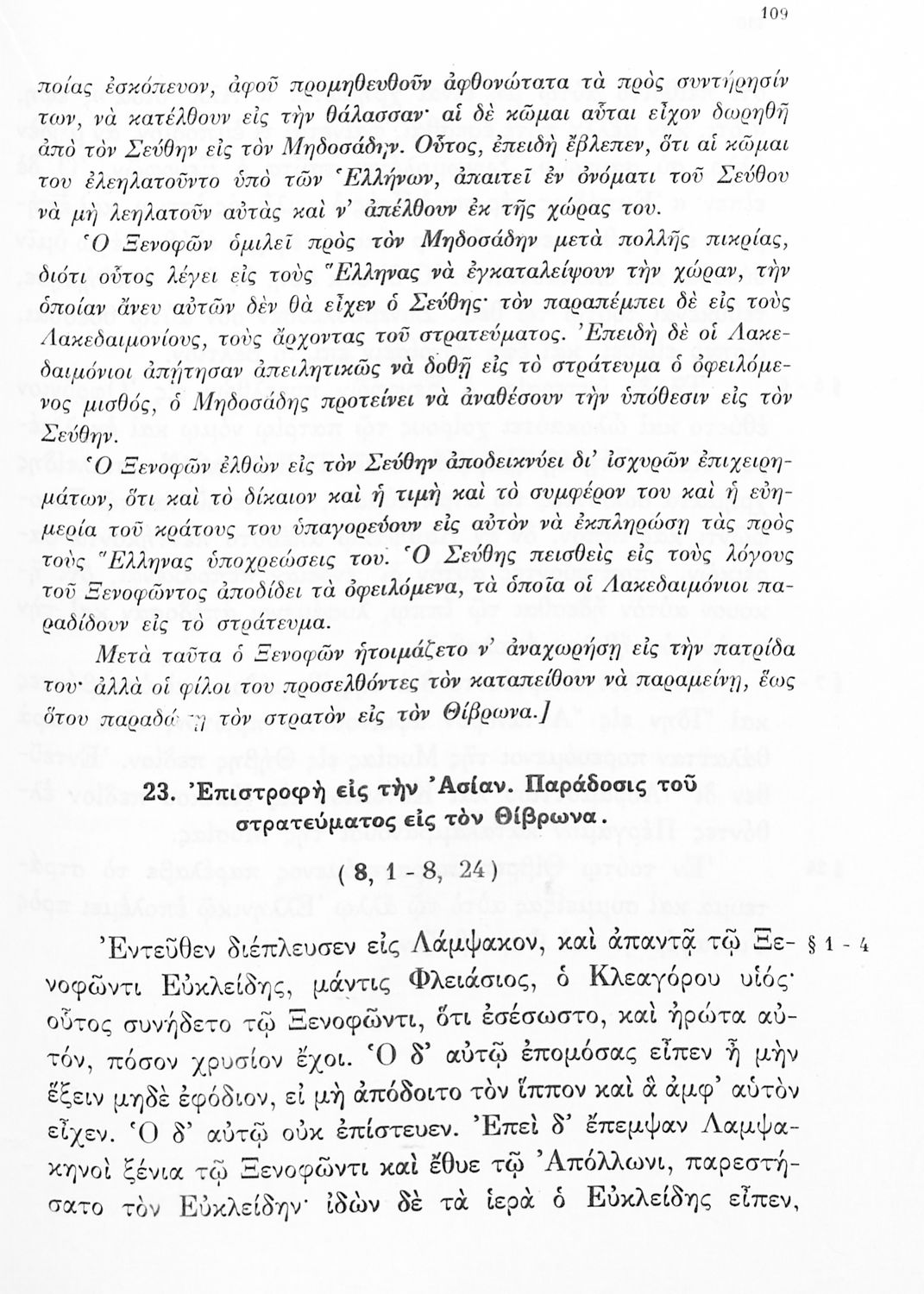 Σχολικό εγχειρίδιο Αρχαίων Ελληνικών του Γυμνασίου. Το βιβλίο αναφέρεται στην ιστορική συγγραφή του Ξενοφώντα για την εκστρατεία του Κύρου κατά του Αρταξέρξη και την κάθοδο των Μυρίων. Στο δεύτερο μέρος το βιβλίο περιέχει τα “Ελληνικά” του Ξενοφώντα που αφορούν την ιστορία των τελευταίων επτά ετών του Πελοποννησιακού πολέμου και τα συμβάντα από το τέλος του Πελοποννησιακού πολέμου μέχρι τη μάχη της Μαντινείας.