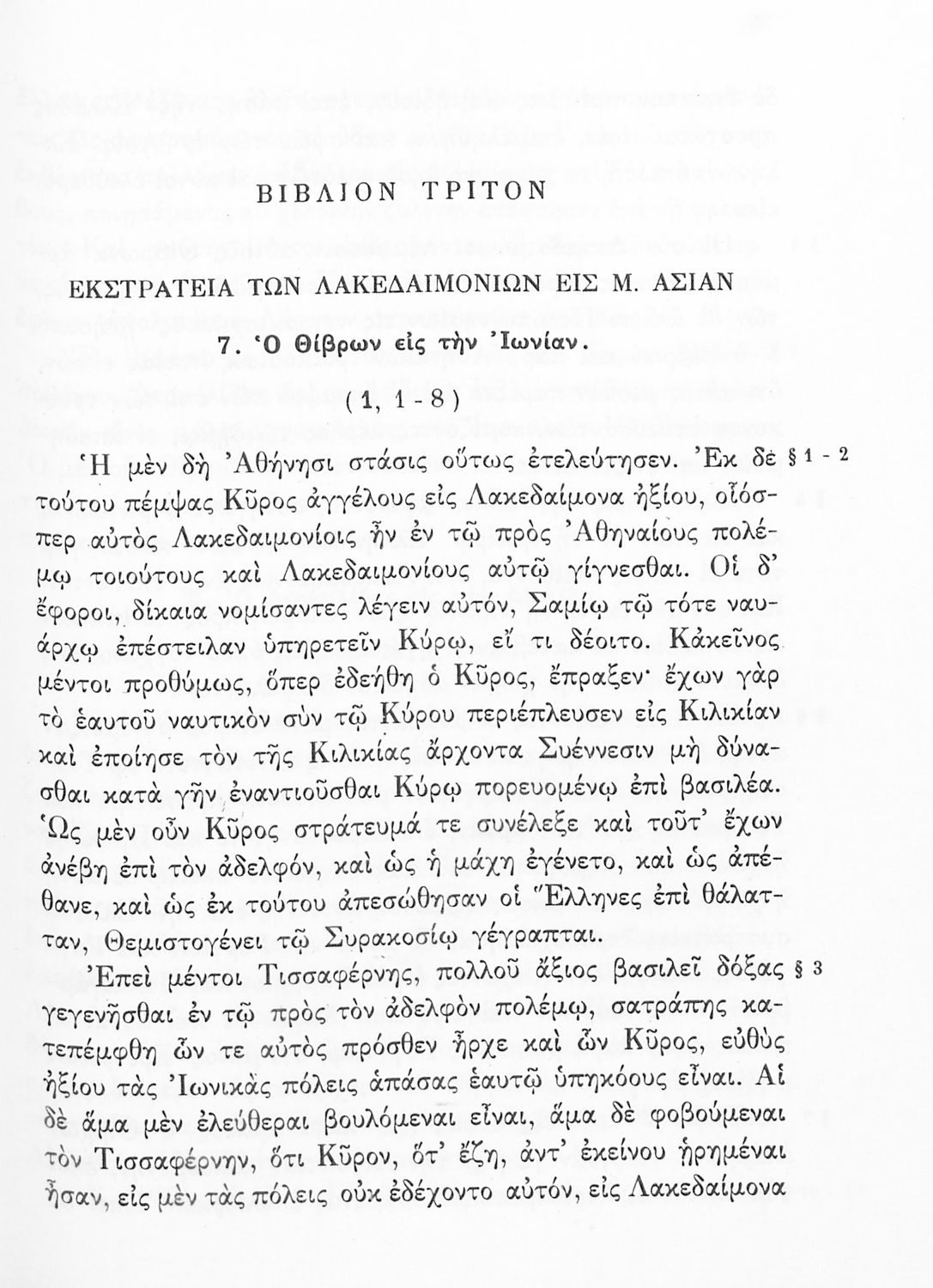 Σχολικό εγχειρίδιο Αρχαίων Ελληνικών του Γυμνασίου. Το βιβλίο αναφέρεται στην ιστορική συγγραφή του Ξενοφώντα για την εκστρατεία του Κύρου κατά του Αρταξέρξη και την κάθοδο των Μυρίων. Στο δεύτερο μέρος το βιβλίο περιέχει τα “Ελληνικά” του Ξενοφώντα που αφορούν την ιστορία των τελευταίων επτά ετών του Πελοποννησιακού πολέμου και τα συμβάντα από το τέλος του Πελοποννησιακού πολέμου μέχρι τη μάχη της Μαντινείας.