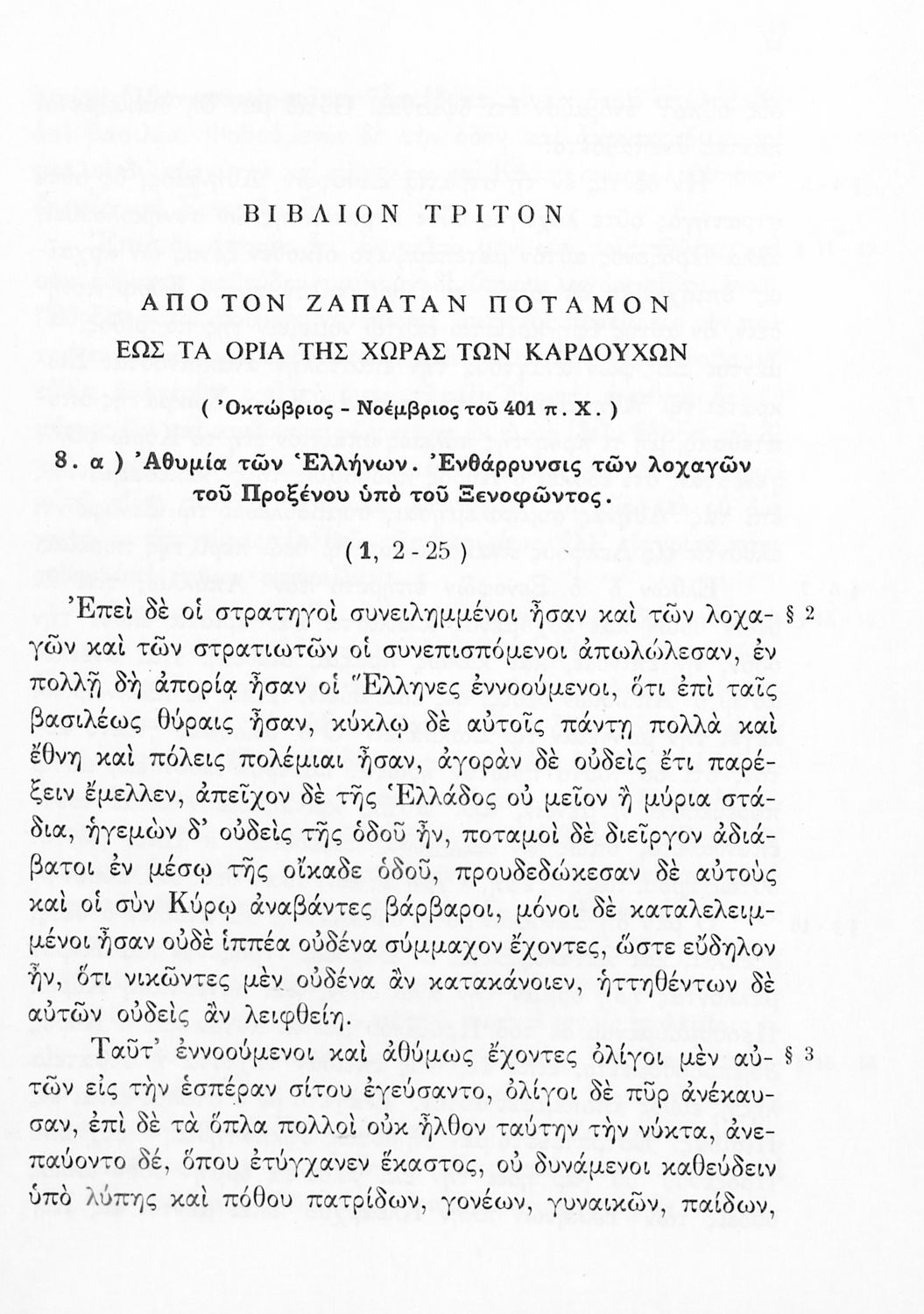 Σχολικό εγχειρίδιο Αρχαίων Ελληνικών του Γυμνασίου. Το βιβλίο αναφέρεται στην ιστορική συγγραφή του Ξενοφώντα για την εκστρατεία του Κύρου κατά του Αρταξέρξη και την κάθοδο των Μυρίων. Στο δεύτερο μέρος το βιβλίο περιέχει τα “Ελληνικά” του Ξενοφώντα που αφορούν την ιστορία των τελευταίων επτά ετών του Πελοποννησιακού πολέμου και τα συμβάντα από το τέλος του Πελοποννησιακού πολέμου μέχρι τη μάχη της Μαντινείας.