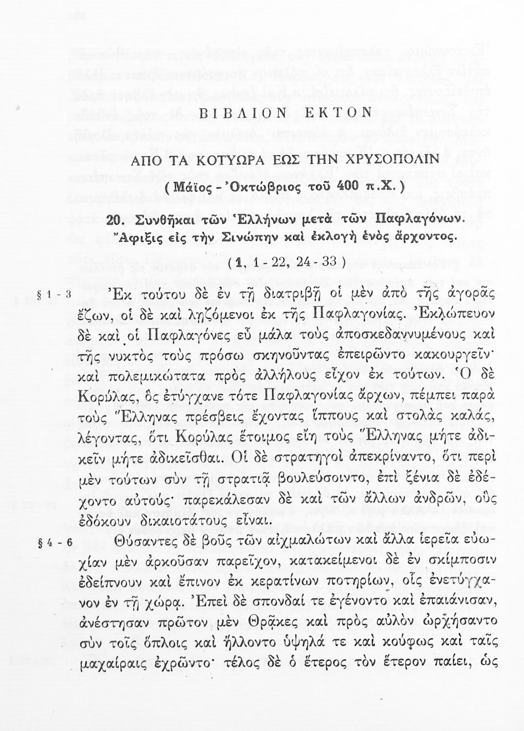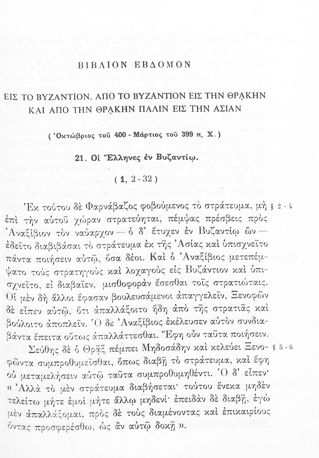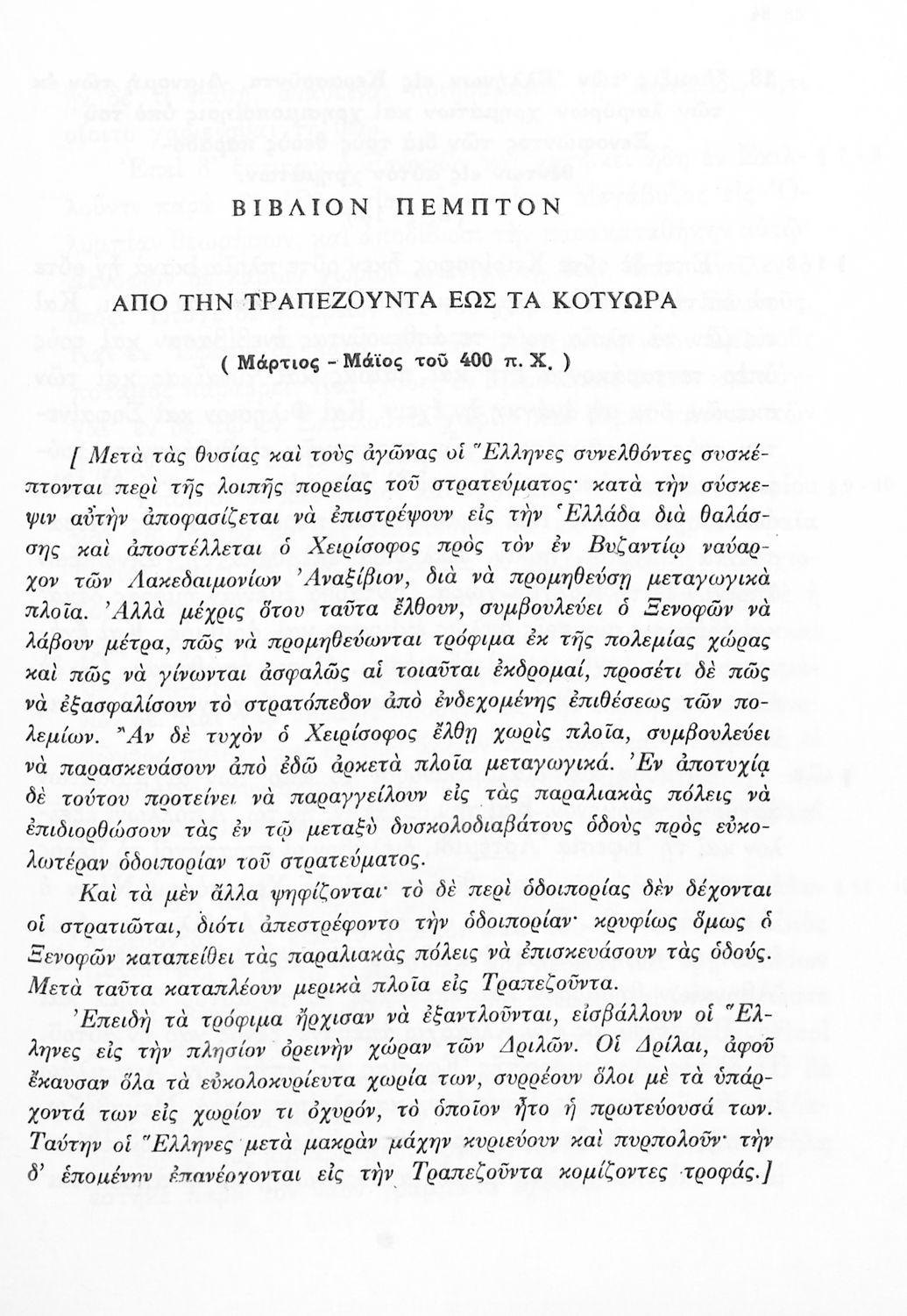 Σχολικό εγχειρίδιο Αρχαίων Ελληνικών του Γυμνασίου. Το βιβλίο αναφέρεται στην ιστορική συγγραφή του Ξενοφώντα για την εκστρατεία του Κύρου κατά του Αρταξέρξη και την κάθοδο των Μυρίων. Στο δεύτερο μέρος το βιβλίο περιέχει τα “Ελληνικά” του Ξενοφώντα που αφορούν την ιστορία των τελευταίων επτά ετών του Πελοποννησιακού πολέμου και τα συμβάντα από το τέλος του Πελοποννησιακού πολέμου μέχρι τη μάχη της Μαντινείας.