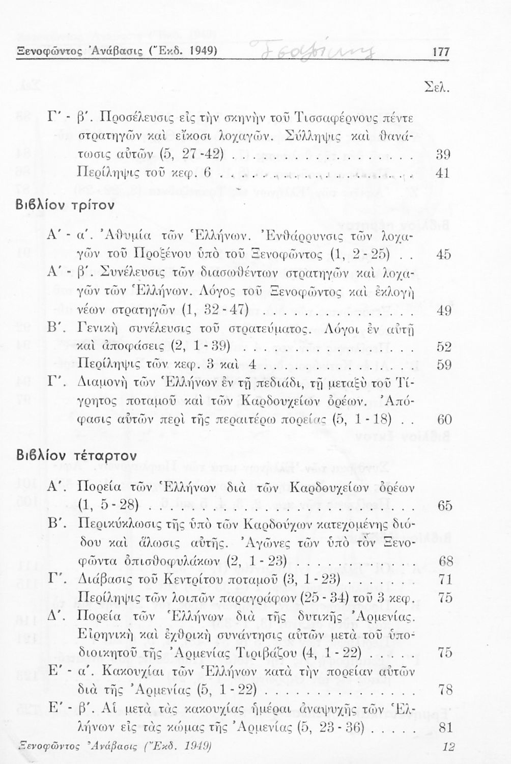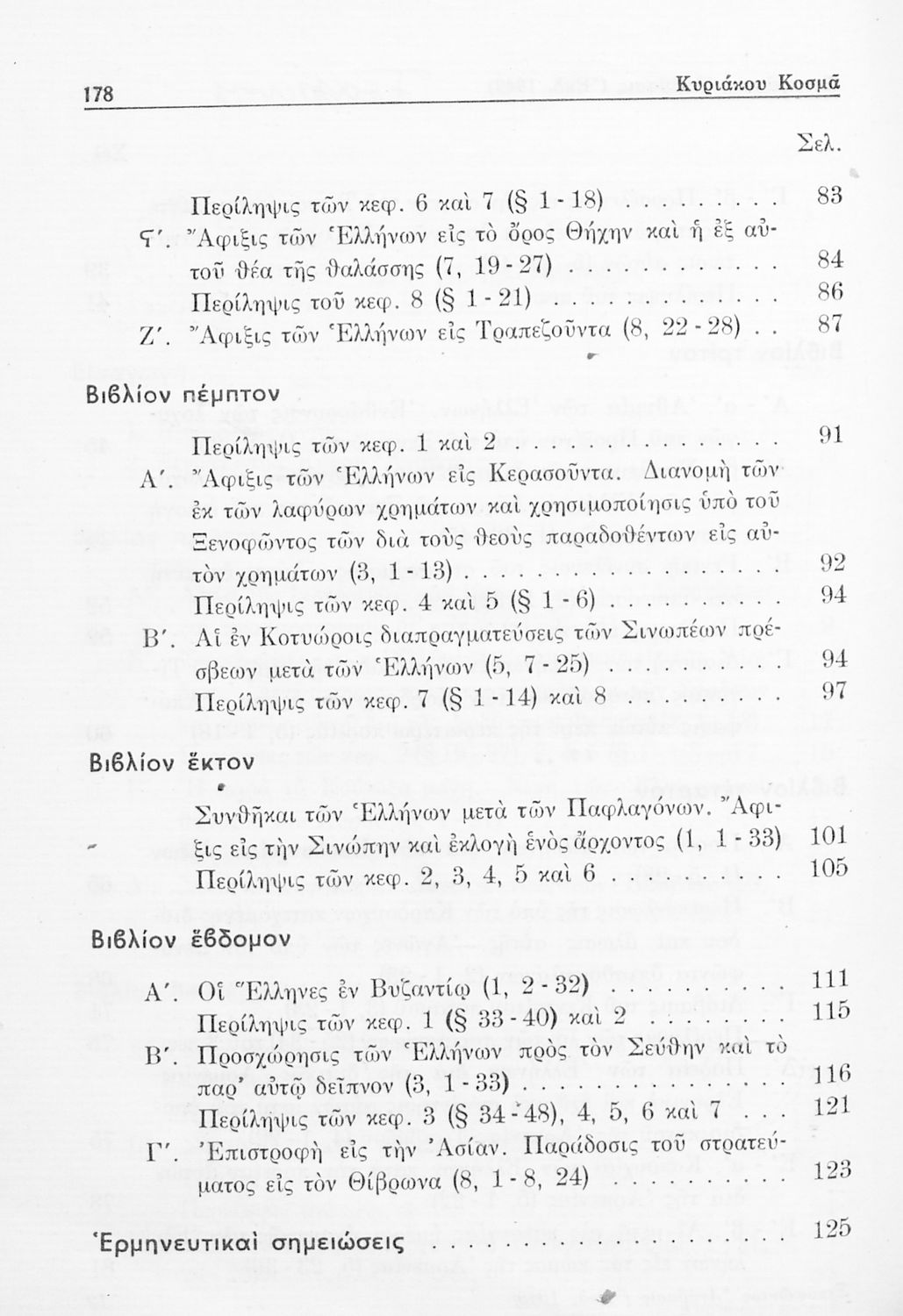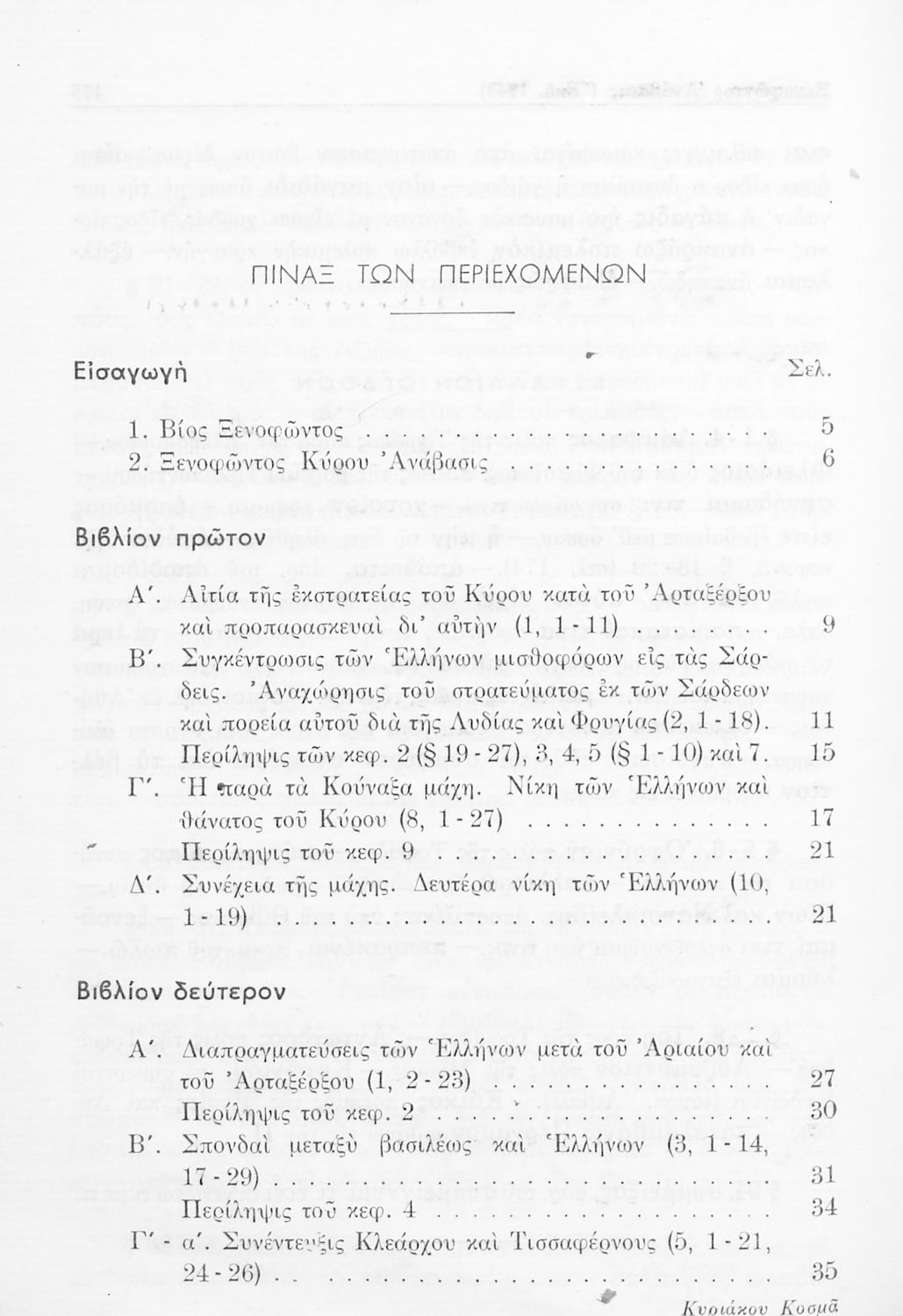Παρουσίαση περιεχομένου: Το σύγγραμμα ήταν σχολικό εγχειρίδιο για το μάθημα των Αρχαίων Ελληνικών στο Γυμνάσιο. Περιλαμβάνει το πρωτότυπο κείμενο από το έργο του Ξενοφώντα, καθώς και ερμηνευτικές και λεξιλογικές παρατηρήσεις του συγγραφέα.