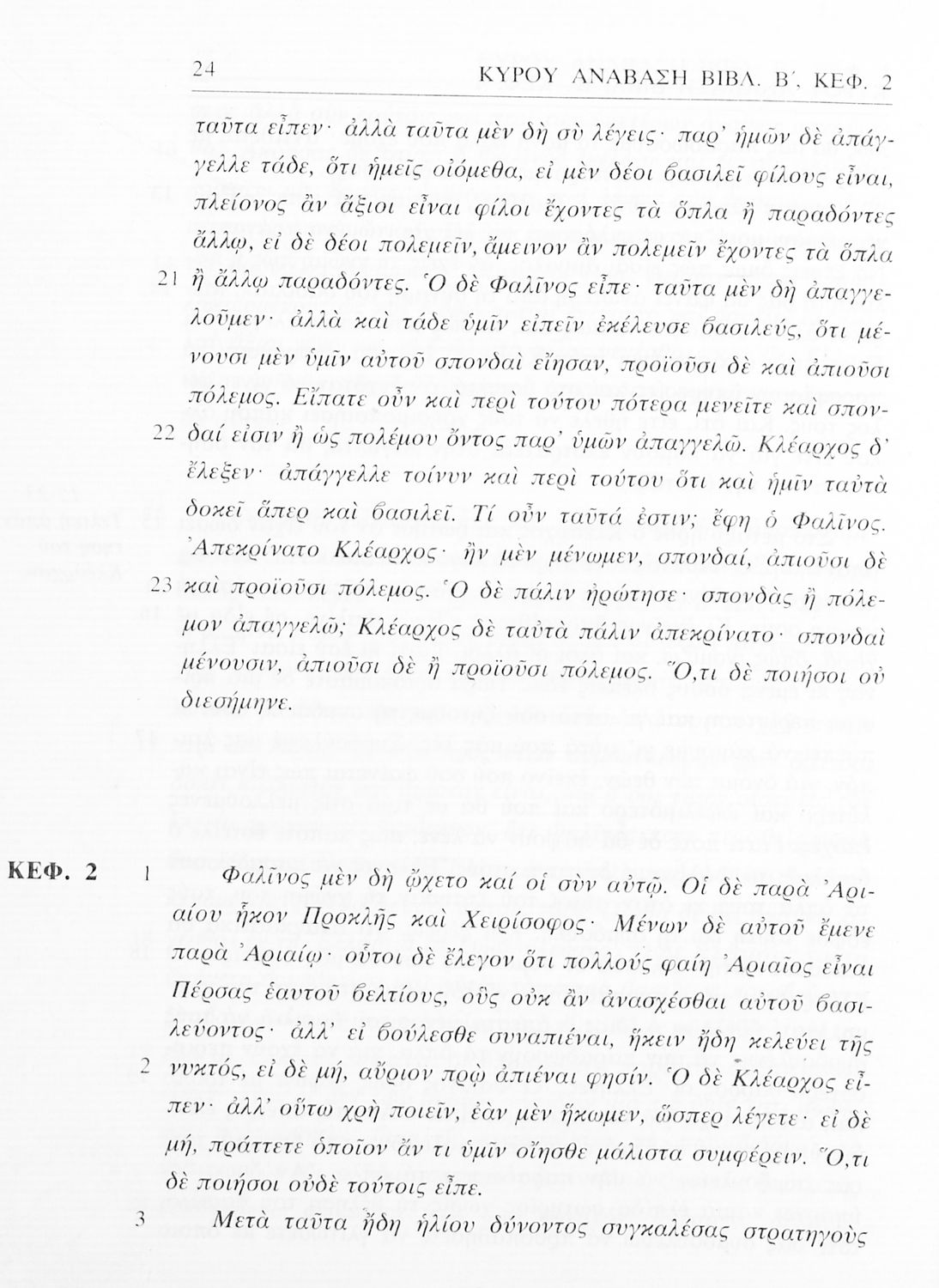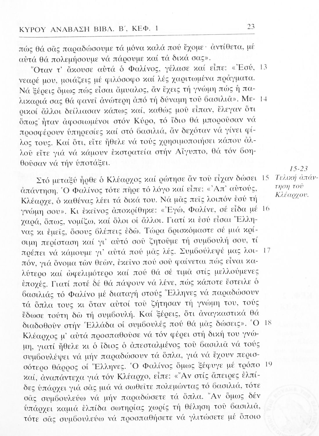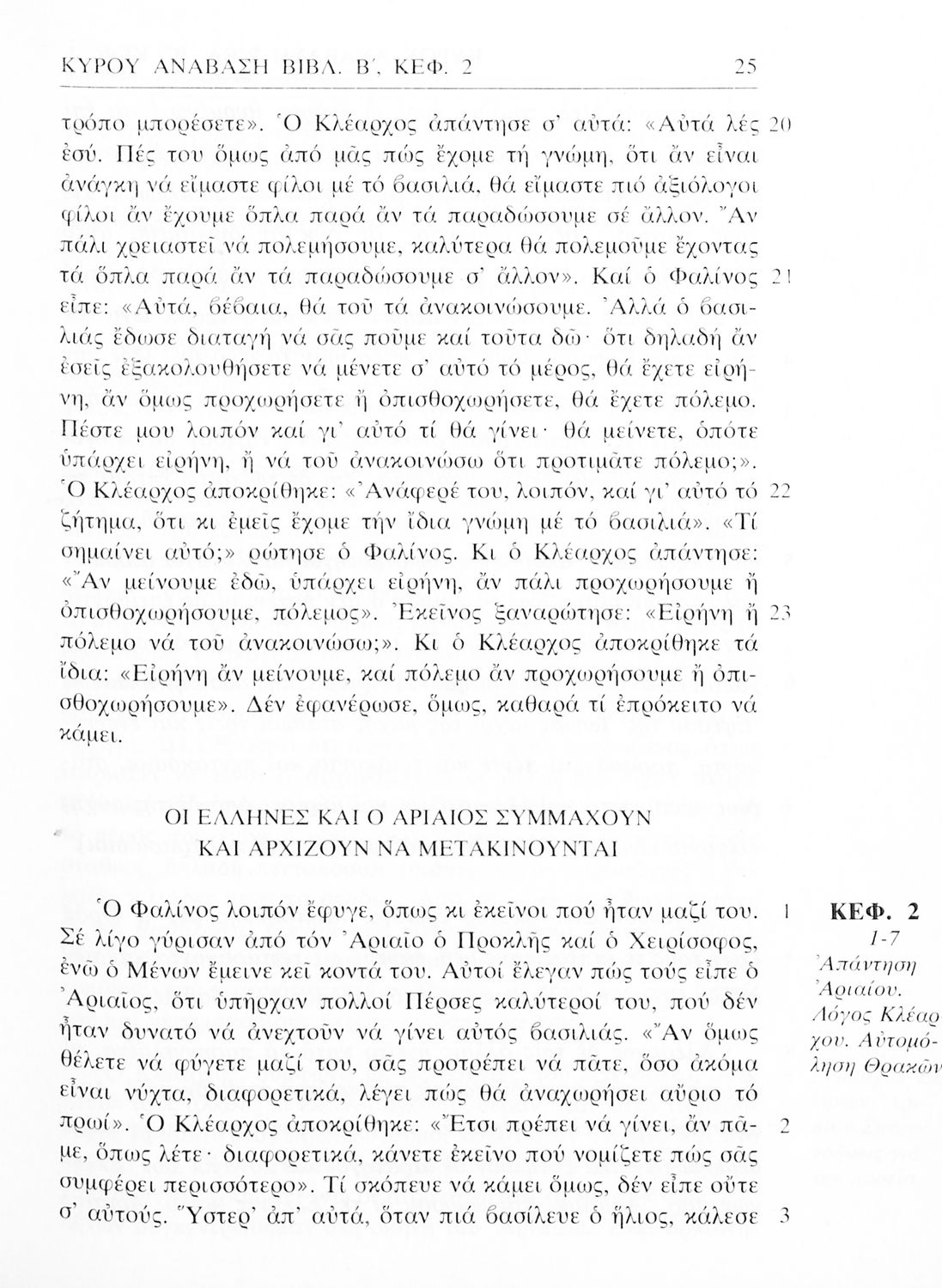 Σχολικό εγχειρίδιο Αρχαίων Ελληνικών α΄ Γυμνασίου που περιλαμβάνει μετάφραση του έργου του Ξενοφώντα Κύρου Ανάβασις, εισαγωγικά σχόλια για τη ζωή και το έργο του, και ερμηνευτικές παρατηρήσεις.