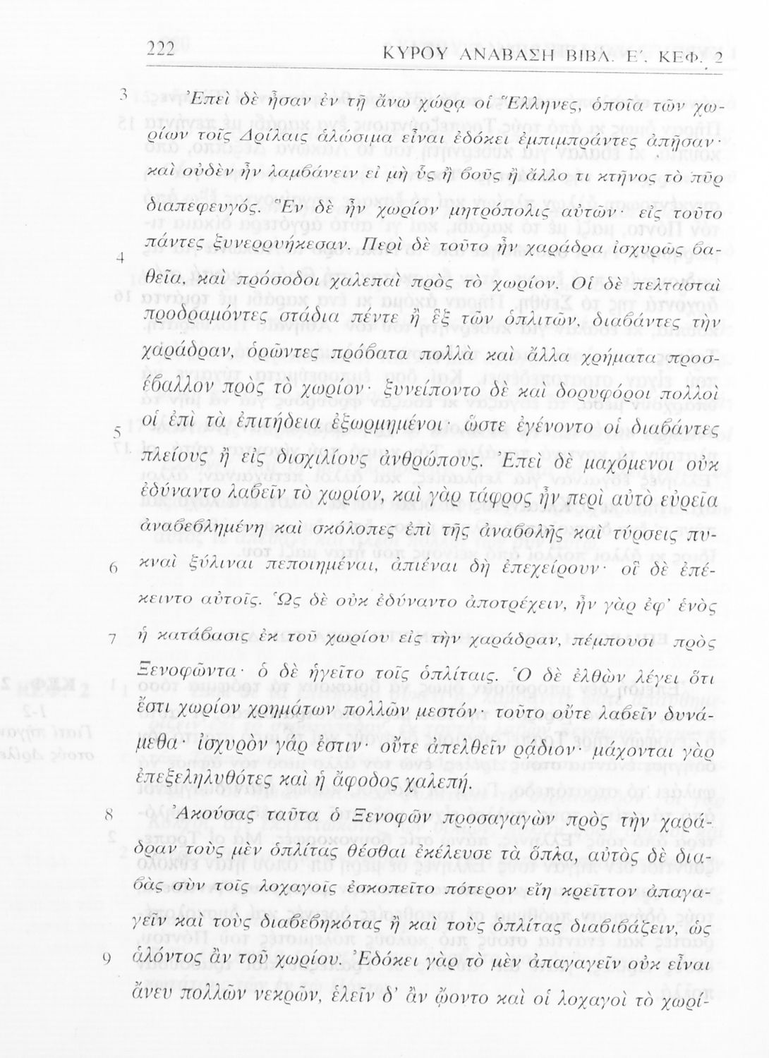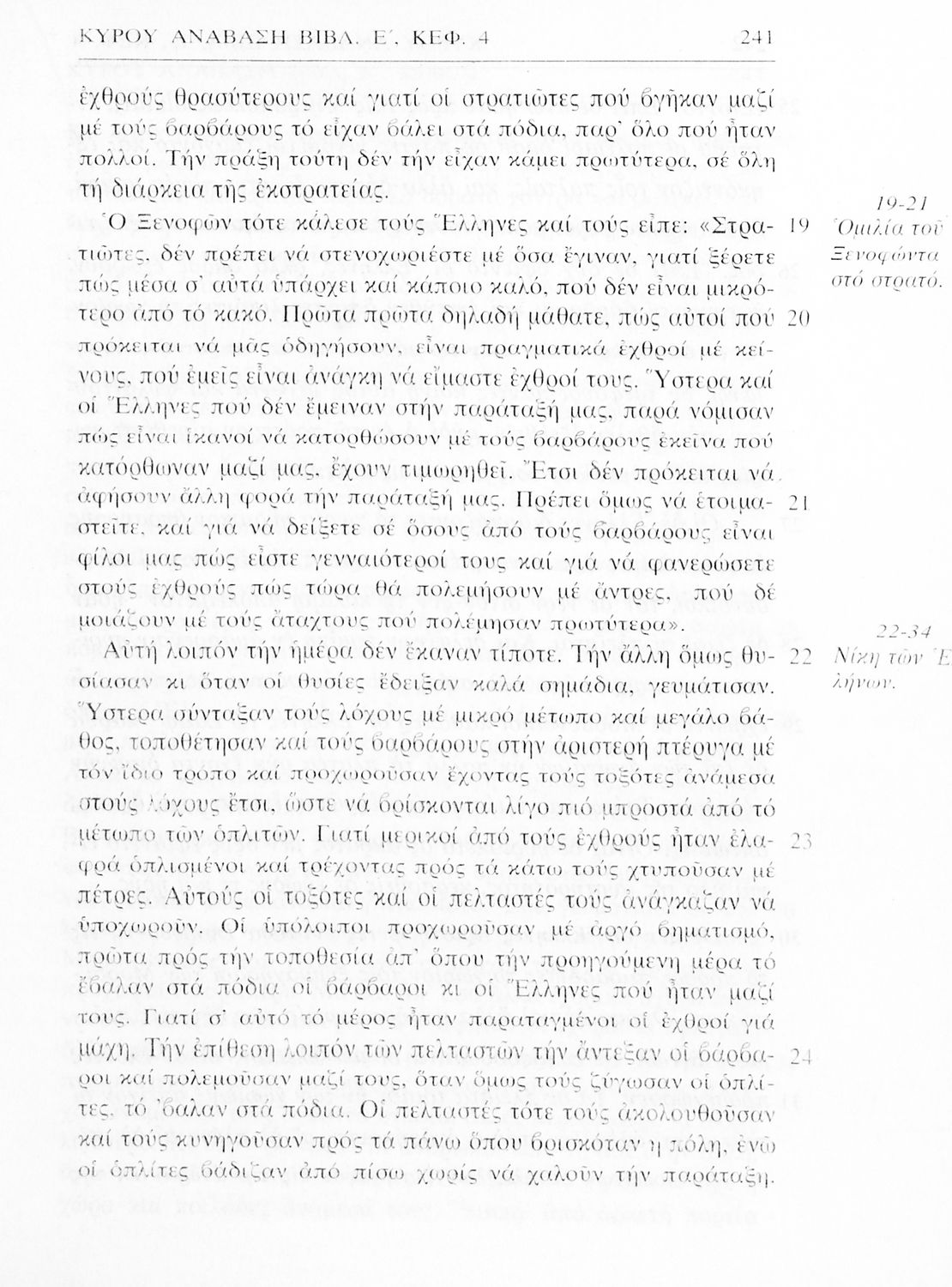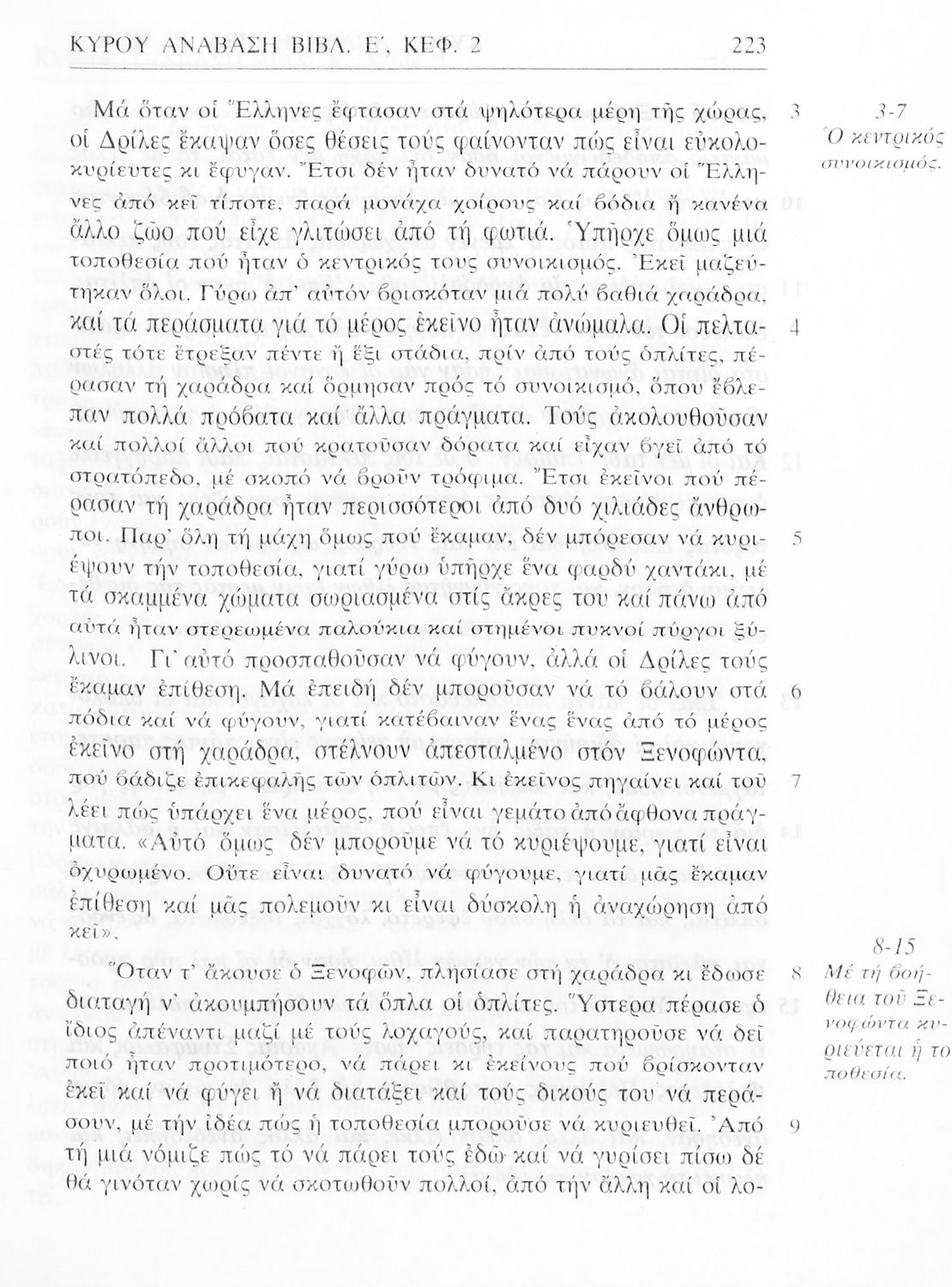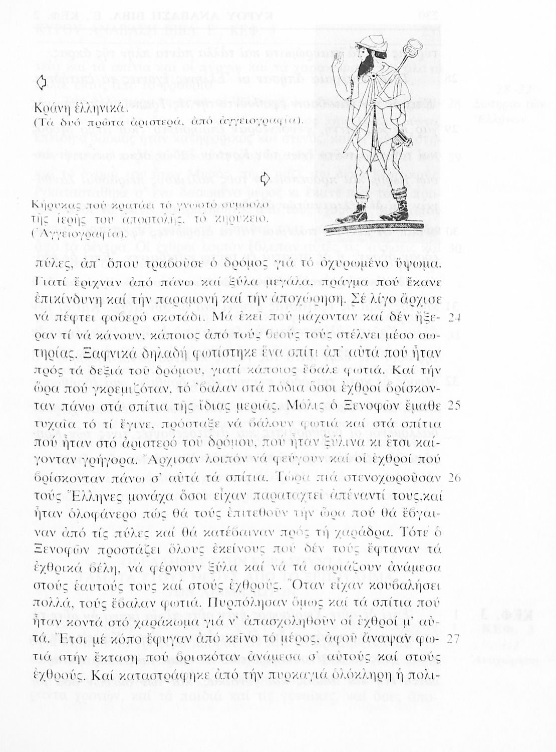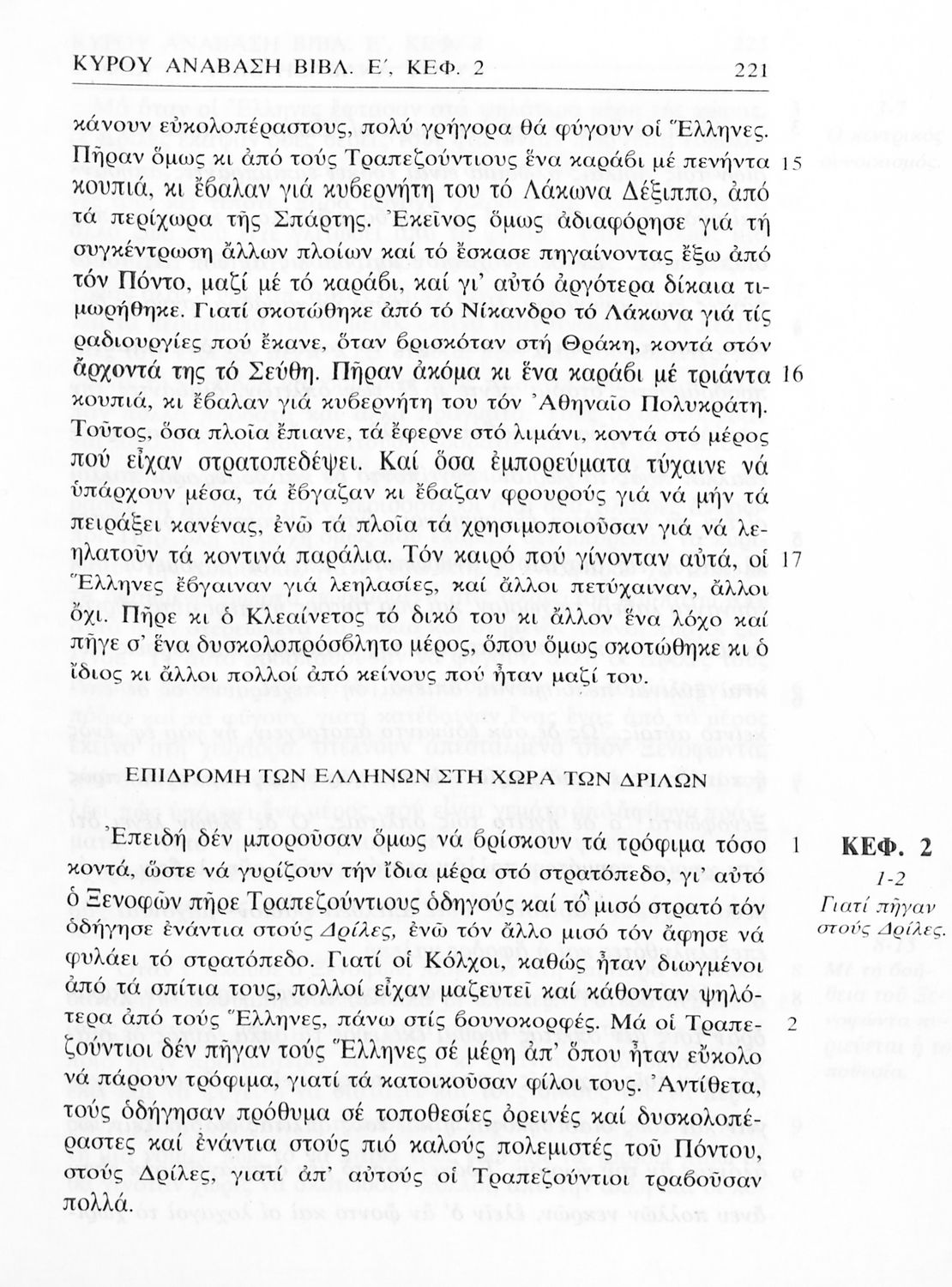 Σχολικό εγχειρίδιο Αρχαίων Ελληνικών α΄ Γυμνασίου που περιλαμβάνει μετάφραση του έργου του Ξενοφώντα Κύρου Ανάβασις, εισαγωγικά σχόλια για τη ζωή και το έργο του, και ερμηνευτικές παρατηρήσεις.