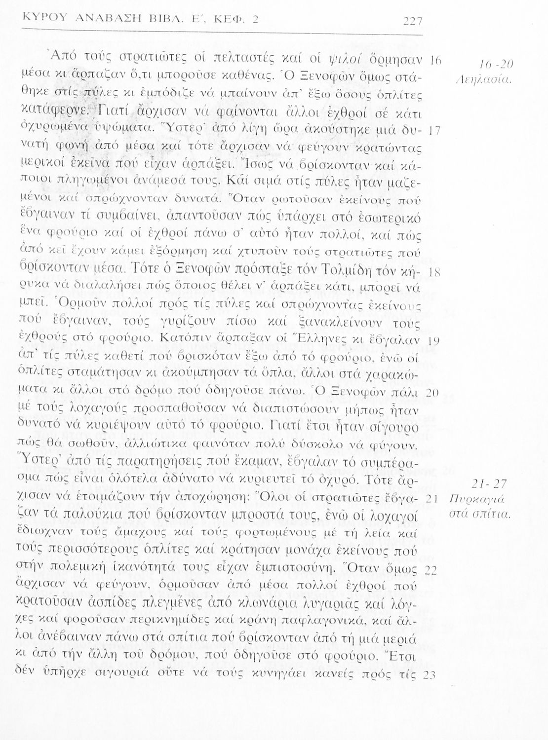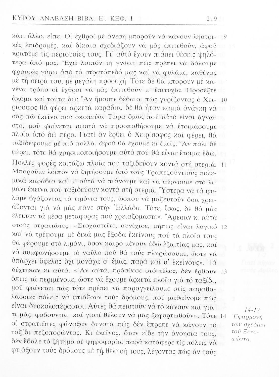 Σχολικό εγχειρίδιο Αρχαίων Ελληνικών της Α' Γυμνασίου. Το βιβλίο παρουσιάζει από μετάφραση το έργο του Ξενοφώντα “Κύρου Ανάβασις” στο οποίο περιγράφεται η εκστρατεία του Κύρου για την κατάληψη της εξουσίας από τον αδερφό του Αρταξέρξη. Στο τελευταίο μέρος το βιβλίο περιλαμβάνει ερμηνευτικές σημειώσεις.