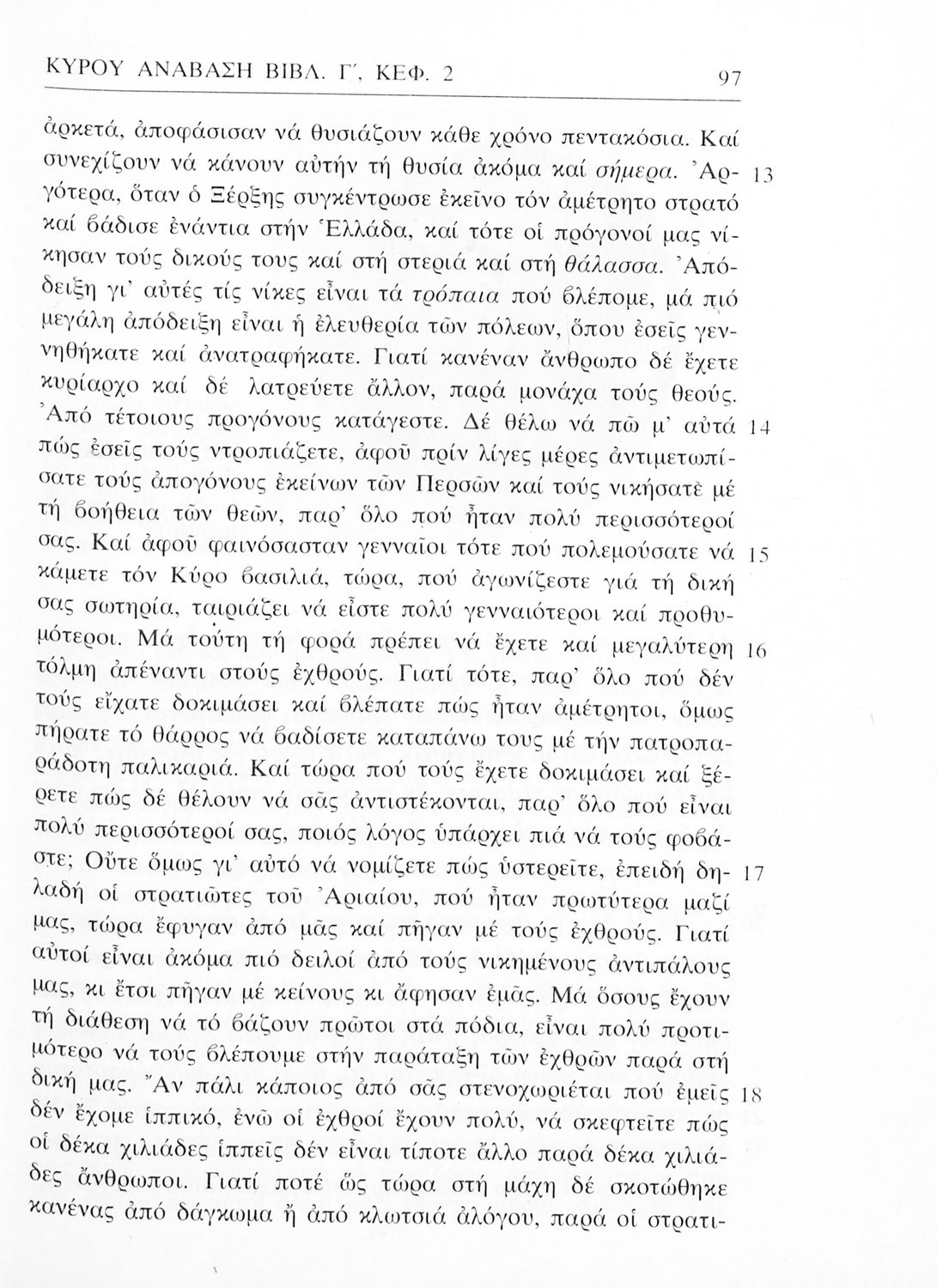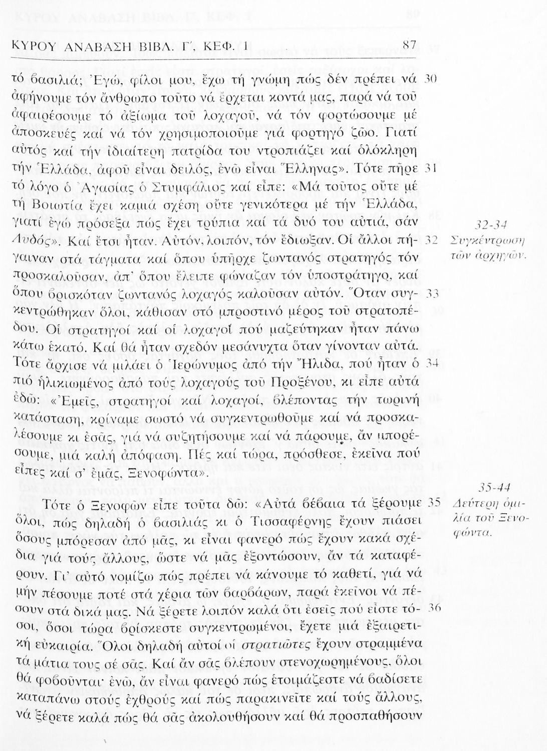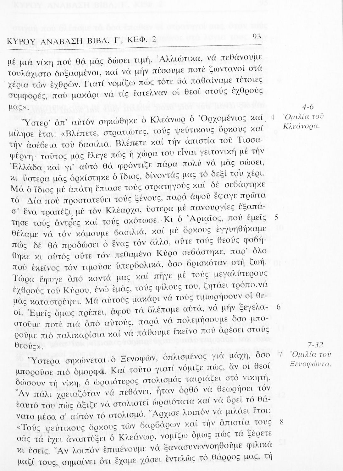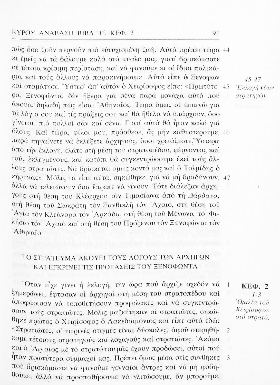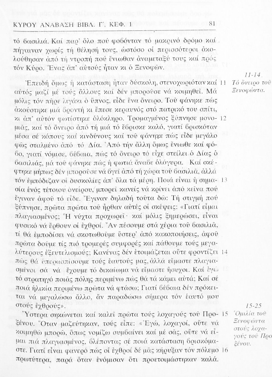 Σχολικό εγχειρίδιο Αρχαίων Ελληνικών α΄ Γυμνασίου που περιλαμβάνει μετάφραση του έργου του Ξενοφώντα Κύρου Ανάβασις, εισαγωγικά σχόλια για τη ζωή και το έργο του, και ερμηνευτικές παρατηρήσεις.