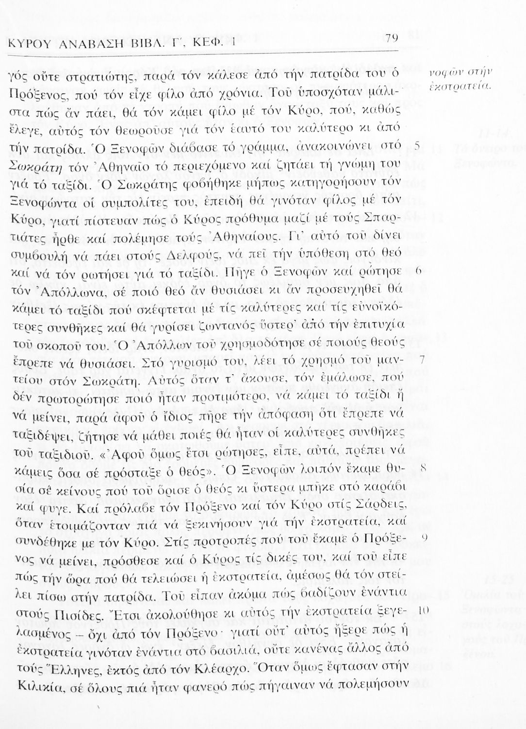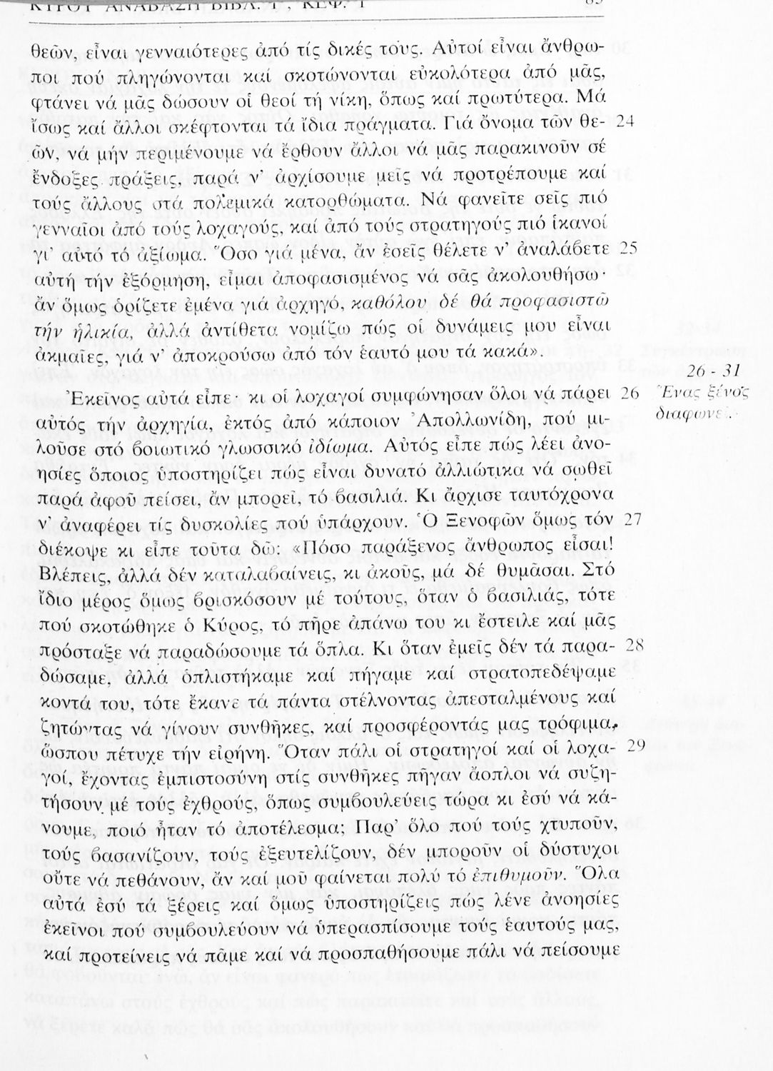 Σχολικό εγχειρίδιο Αρχαίων Ελληνικών της Α' Γυμνασίου. Το βιβλίο παρουσιάζει από μετάφραση το έργο του Ξενοφώντα “Κύρου Ανάβασις” στο οποίο περιγράφεται η εκστρατεία του Κύρου για την κατάληψη της εξουσίας από τον αδερφό του Αρταξέρξη. Στο τελευταίο μέρος το βιβλίο περιλαμβάνει ερμηνευτικές σημειώσεις.