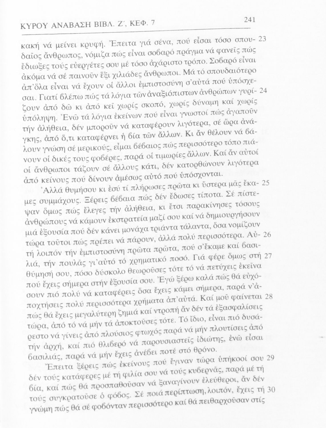 Σχολικό εγχειρίδιο Αρχαίων Ελληνικών α΄ Γυμνασίου που περιλαμβάνει μετάφραση του έργου του Ξενοφώντα Κύρου Ανάβασις, εισαγωγικά σχόλια για τη ζωή και το έργο του, και ερμηνευτικές παρατηρήσεις.