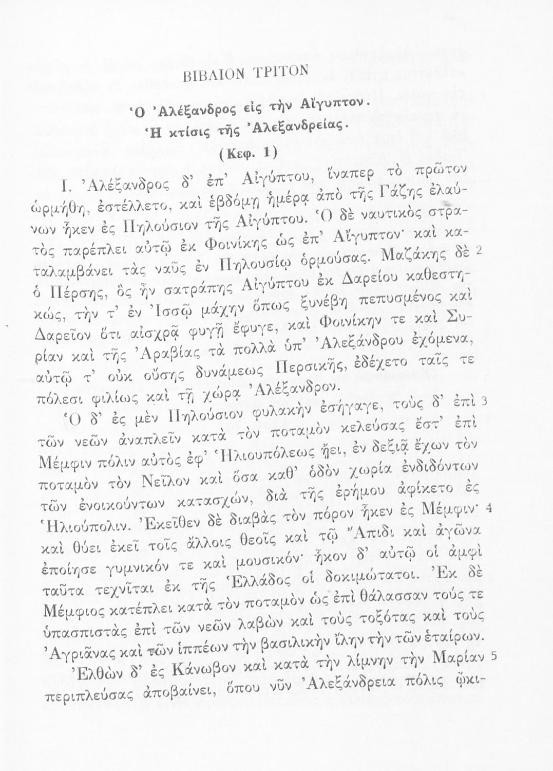 Σχολικό εγχειρίδιο Αρχαίων Ελληνικών για τη Γ΄ Γυμνασίου που περιλαμβάνει σύντομο βιογραφικό σημείωμα του Αρριανού, εισαγωγή στο έργο, αποσπάσματα από το πρώτο και δεύτερο βιβλίο της Ανάβασης του Αλέξανδρου και ετυμολογικές σημειώσεις. Φέρει το σύμβολο της δικτατορίας.