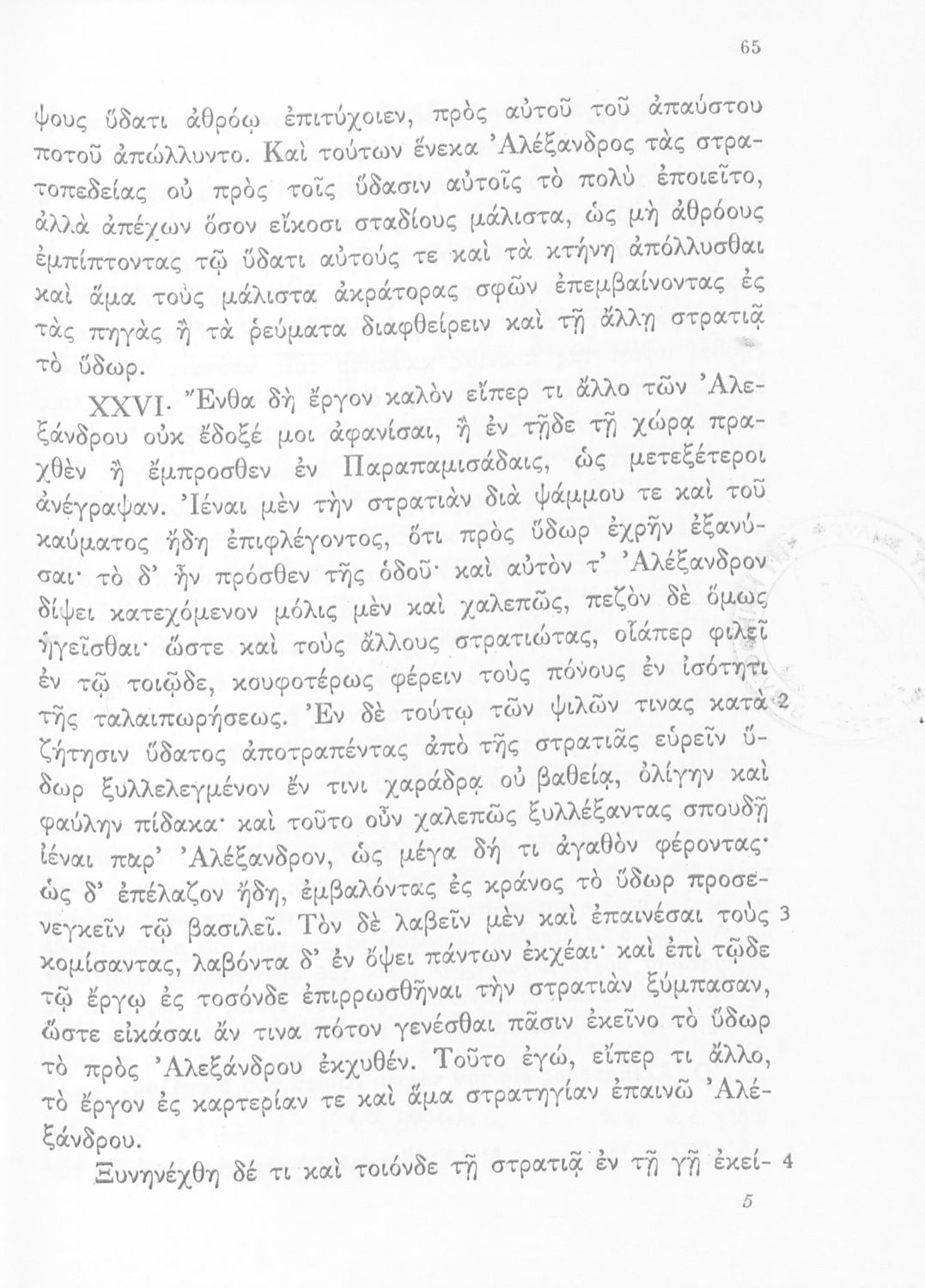 Σχολικό εγχειρίδιο Αρχαίων Ελληνικών για τη Γ΄ Γυμνασίου που περιλαμβάνει σύντομο βιογραφικό σημείωμα του Αρριανού, εισαγωγή στο έργο, αποσπάσματα από το πρώτο και δεύτερο βιβλίο της Ανάβασης του Αλέξανδρου και ετυμολογικές σημειώσεις. Φέρει το σύμβολο της δικτατορίας.