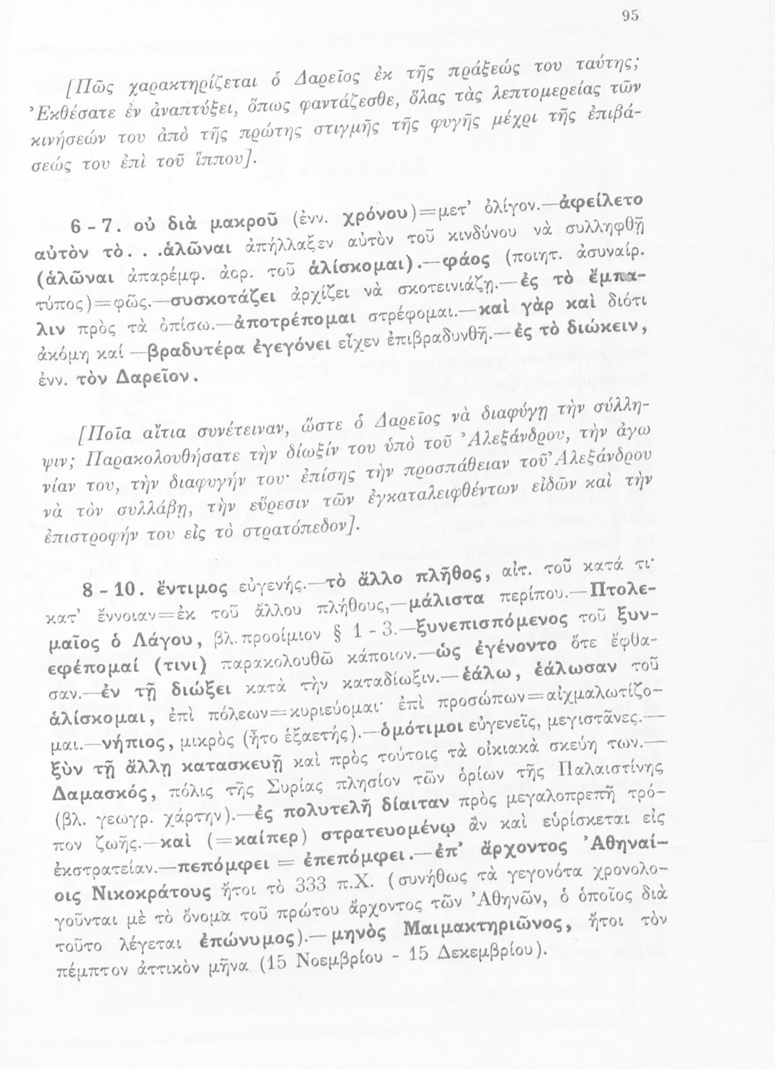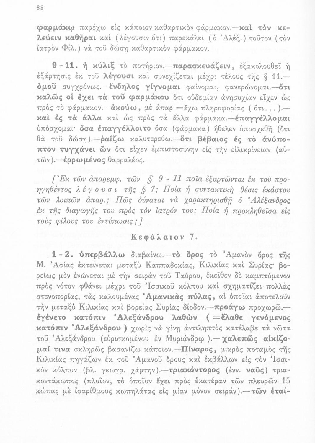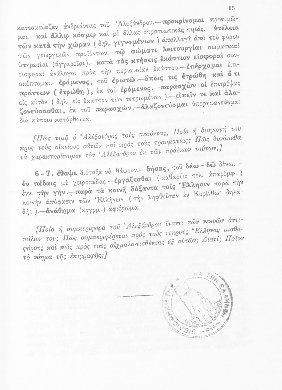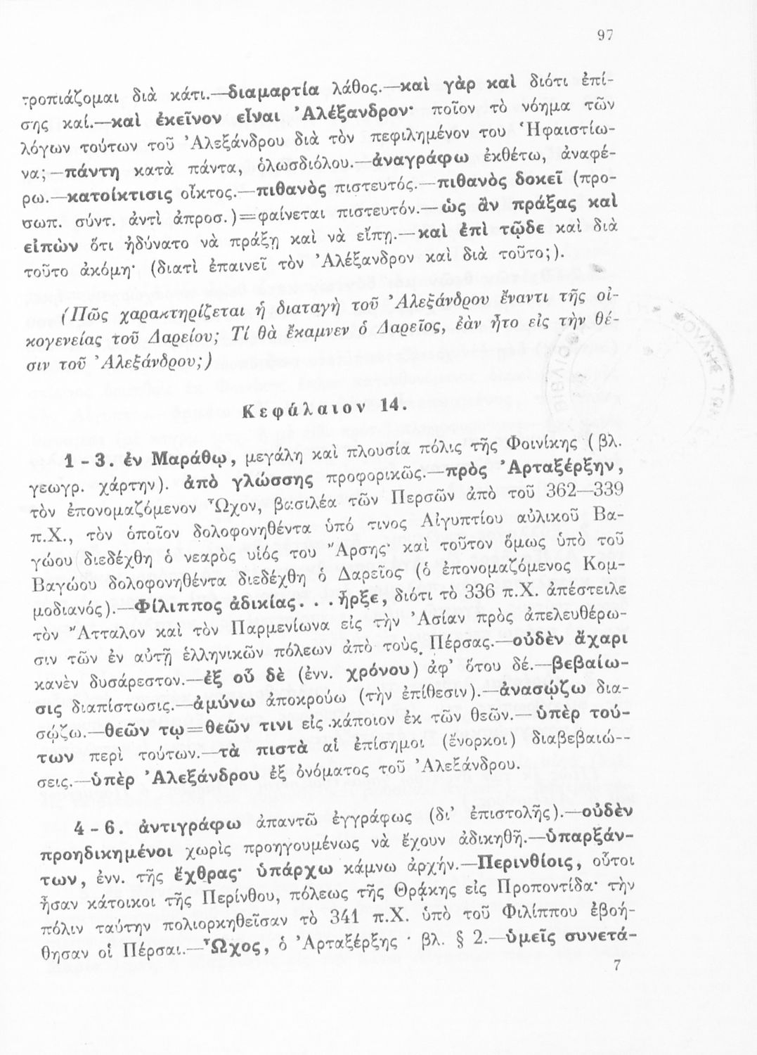 Βαθμίδα εκπαίδευσης: Δευτεροβάθμια Τάξη: Γ' Γυμνασίου Μάθημα: Αρχαία Ελληνικά Γλώσσα: Απλή καθαρεύουσα Παρουσίαση περιεχομένου: Σχολικό εγχειρίδιο Αρχαίων Ελληνικών για τη Γ΄ Γυμνασίου που περιλαμβάνει σύντομο βιογραφικό σημείωμα του Αρριανού, εισαγωγή στο έργο, αποσπάσματα από το πρώτο και δεύτερο βιβλίο της Ανάβασης του Αλέξανδρου και ετυμολογικές σημειώσεις. Φέρει το σύμβολο της δικτατορίας. |