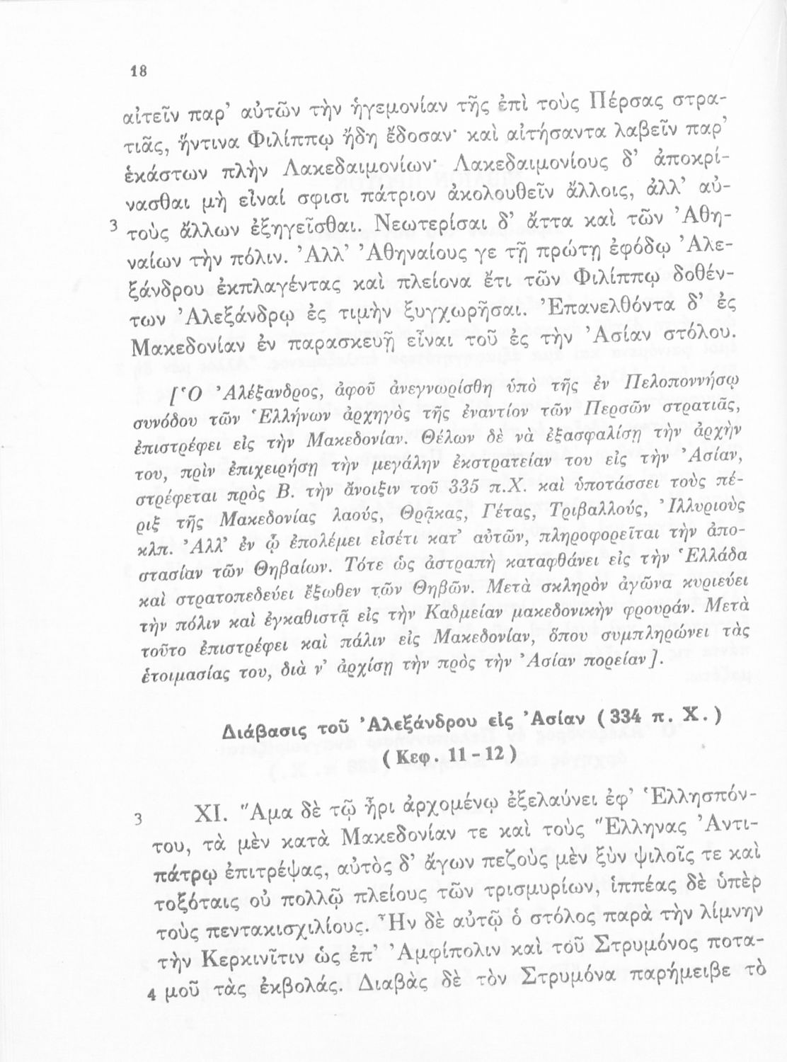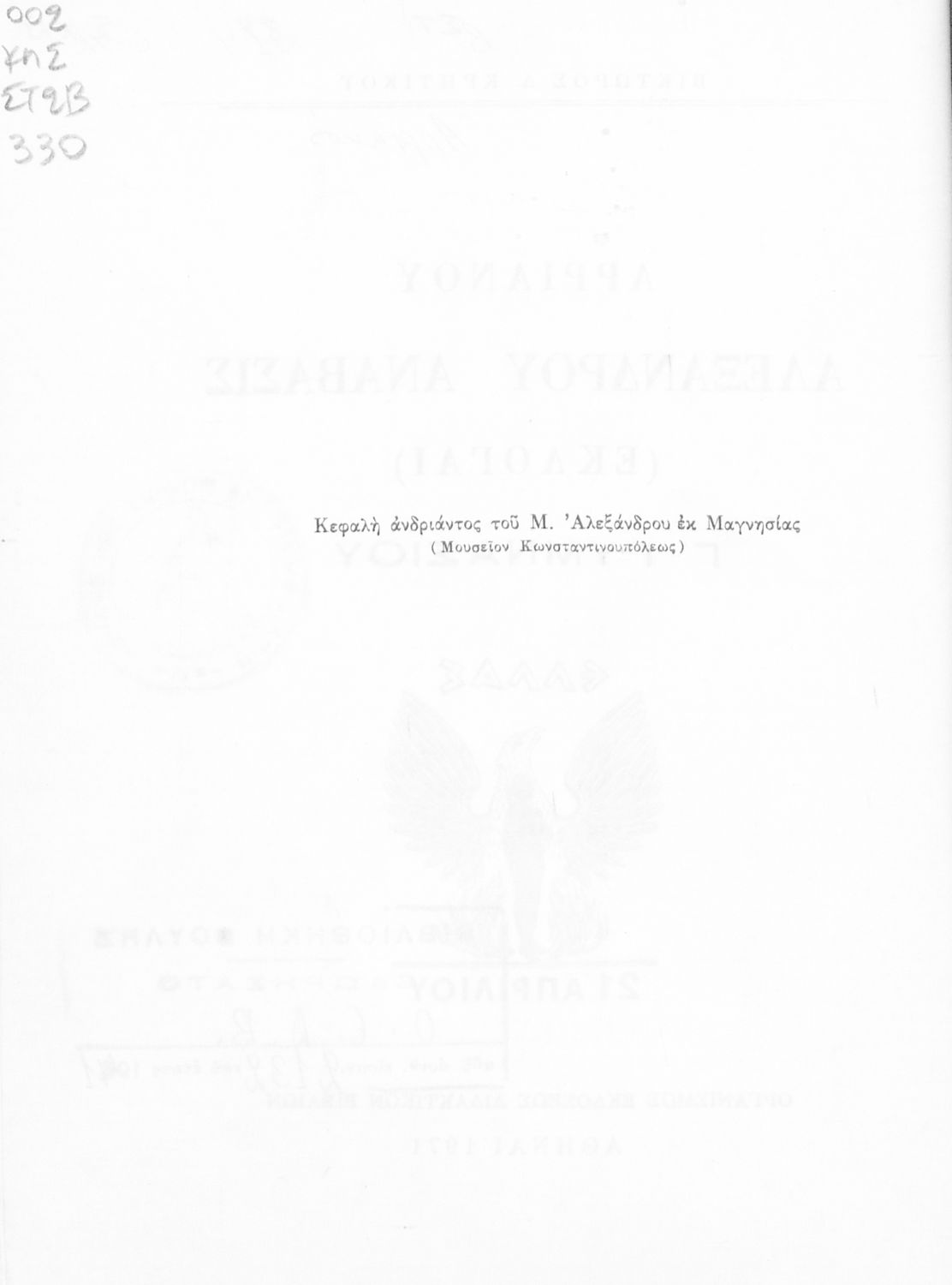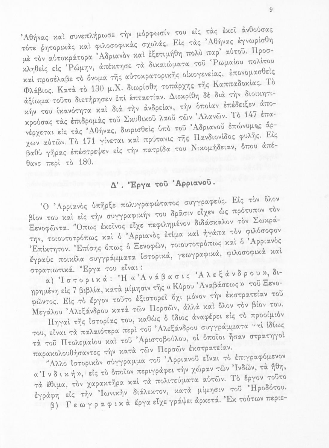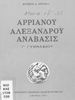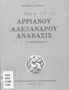 Σχολικό εγχειρίδιο Αρχαίων Ελληνικών για τη Γ΄ Γυμνασίου που περιλαμβάνει σύντομο βιογραφικό σημείωμα του Αρριανού, εισαγωγή στο έργο, αποσπάσματα από το πρώτο και δεύτερο βιβλίο της Ανάβασης του Αλέξανδρου και ετυμολογικές σημειώσεις. Φέρει το σύμβολο της δικτατορίας.