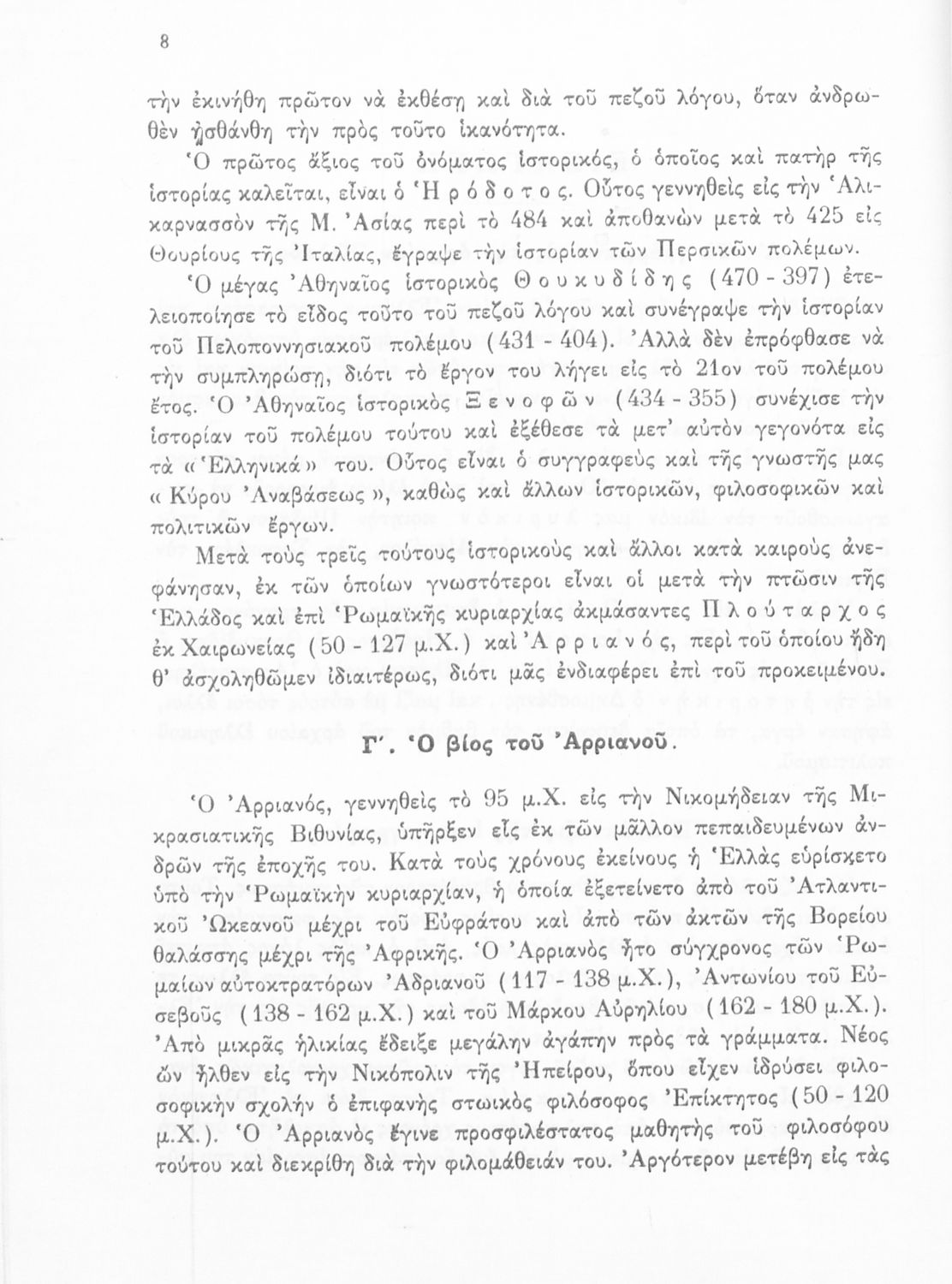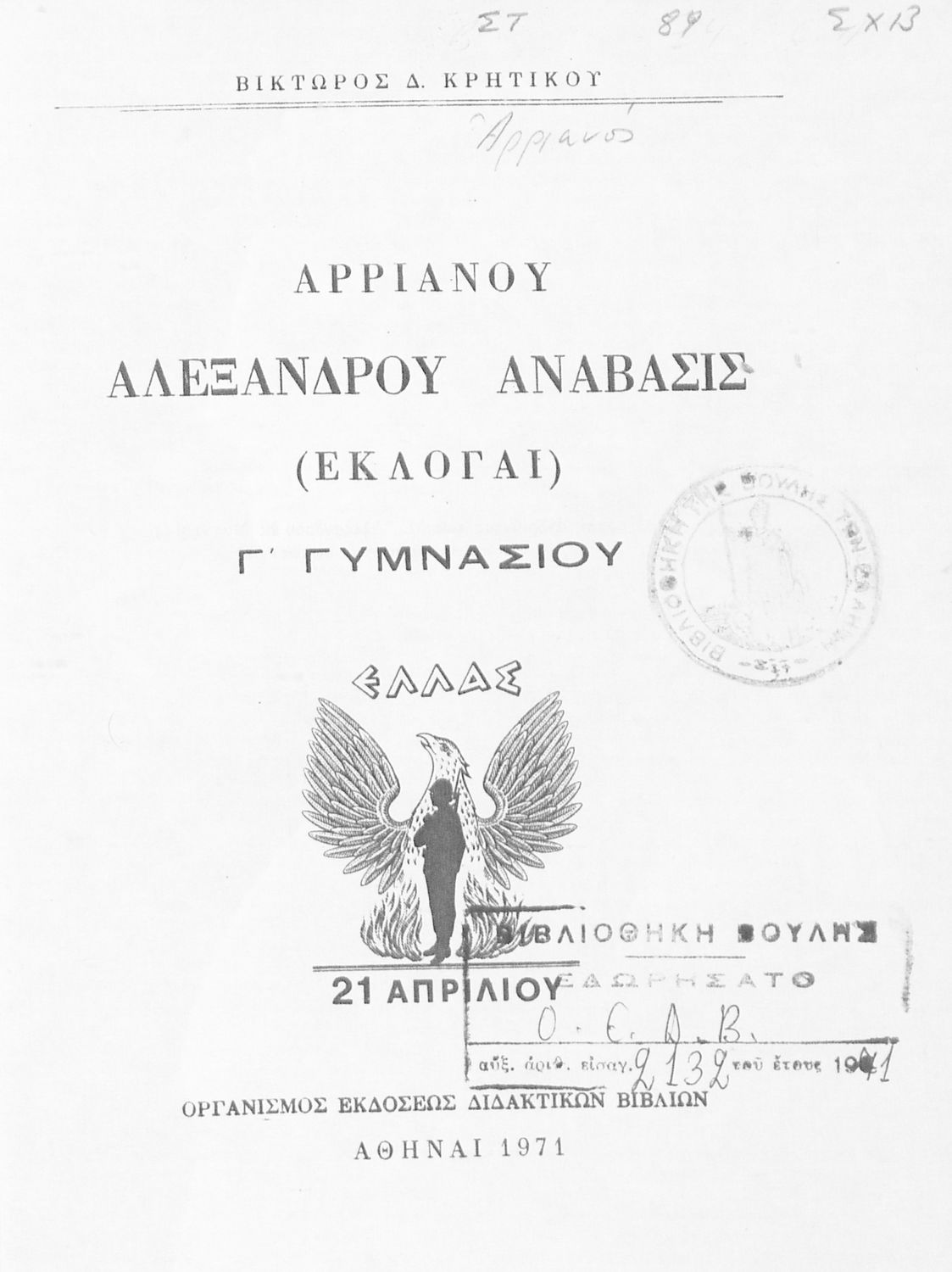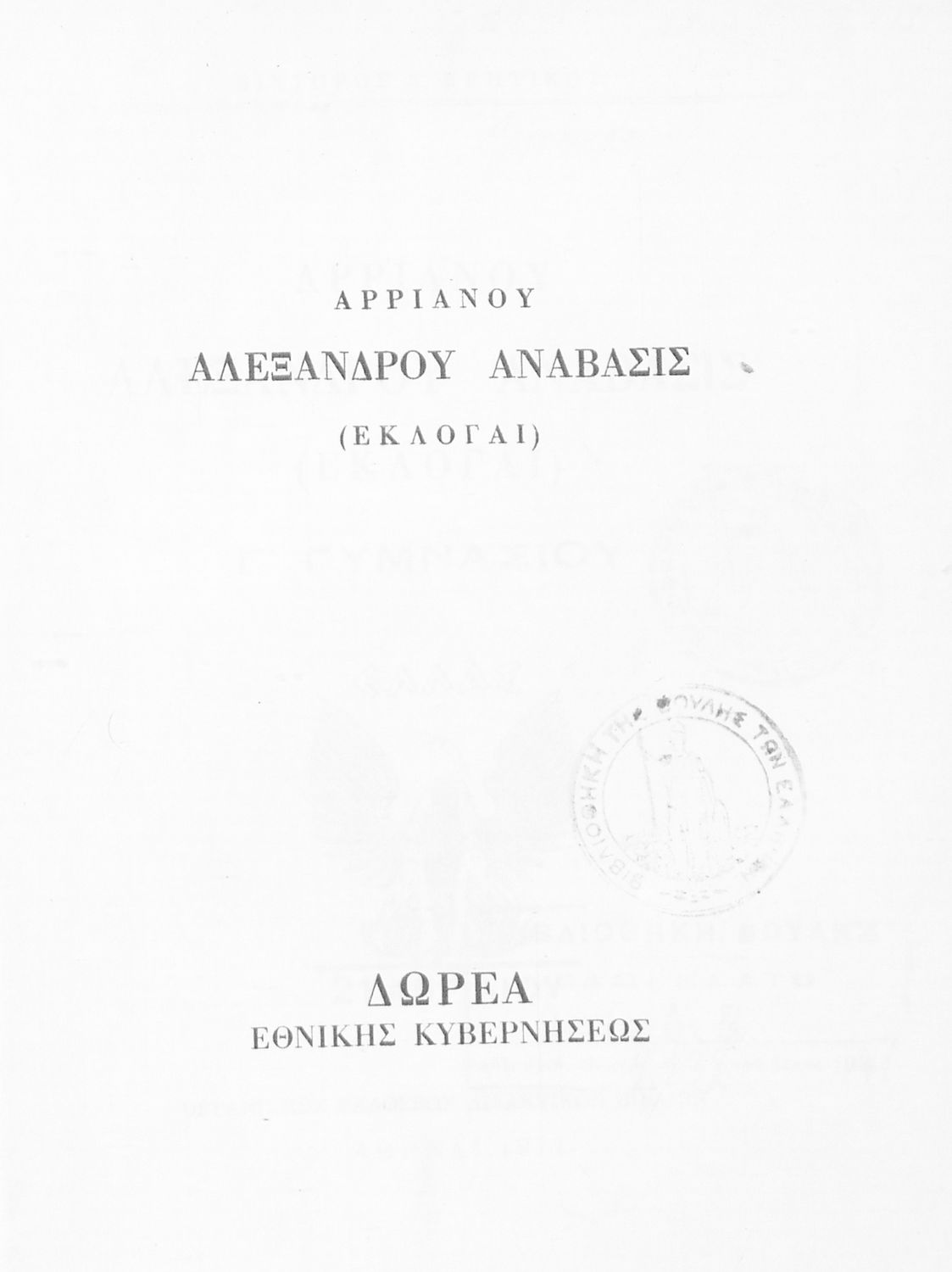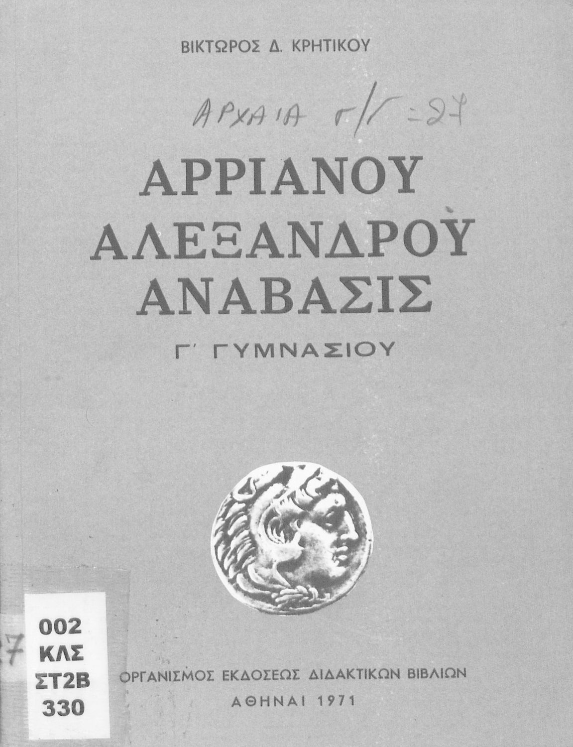 Βαθμίδα εκπαίδευσης: Δευτεροβάθμια Τάξη: Γ' Γυμνασίου Μάθημα: Αρχαία Ελληνικά Γλώσσα: Απλή καθαρεύουσα Παρουσίαση περιεχομένου: Σχολικό εγχειρίδιο Αρχαίων Ελληνικών για τη Γ΄ Γυμνασίου που περιλαμβάνει σύντομο βιογραφικό σημείωμα του Αρριανού, εισαγωγή στο έργο, αποσπάσματα από το πρώτο και δεύτερο βιβλίο της Ανάβασης του Αλέξανδρου και ετυμολογικές σημειώσεις. Φέρει το σύμβολο της δικτατορίας. |