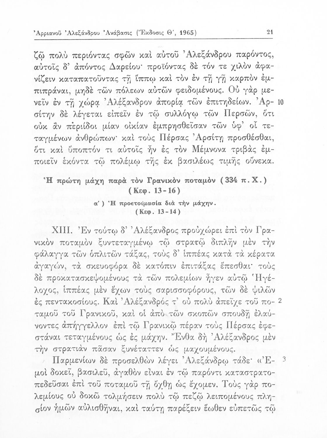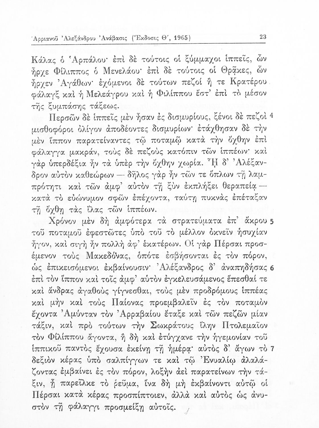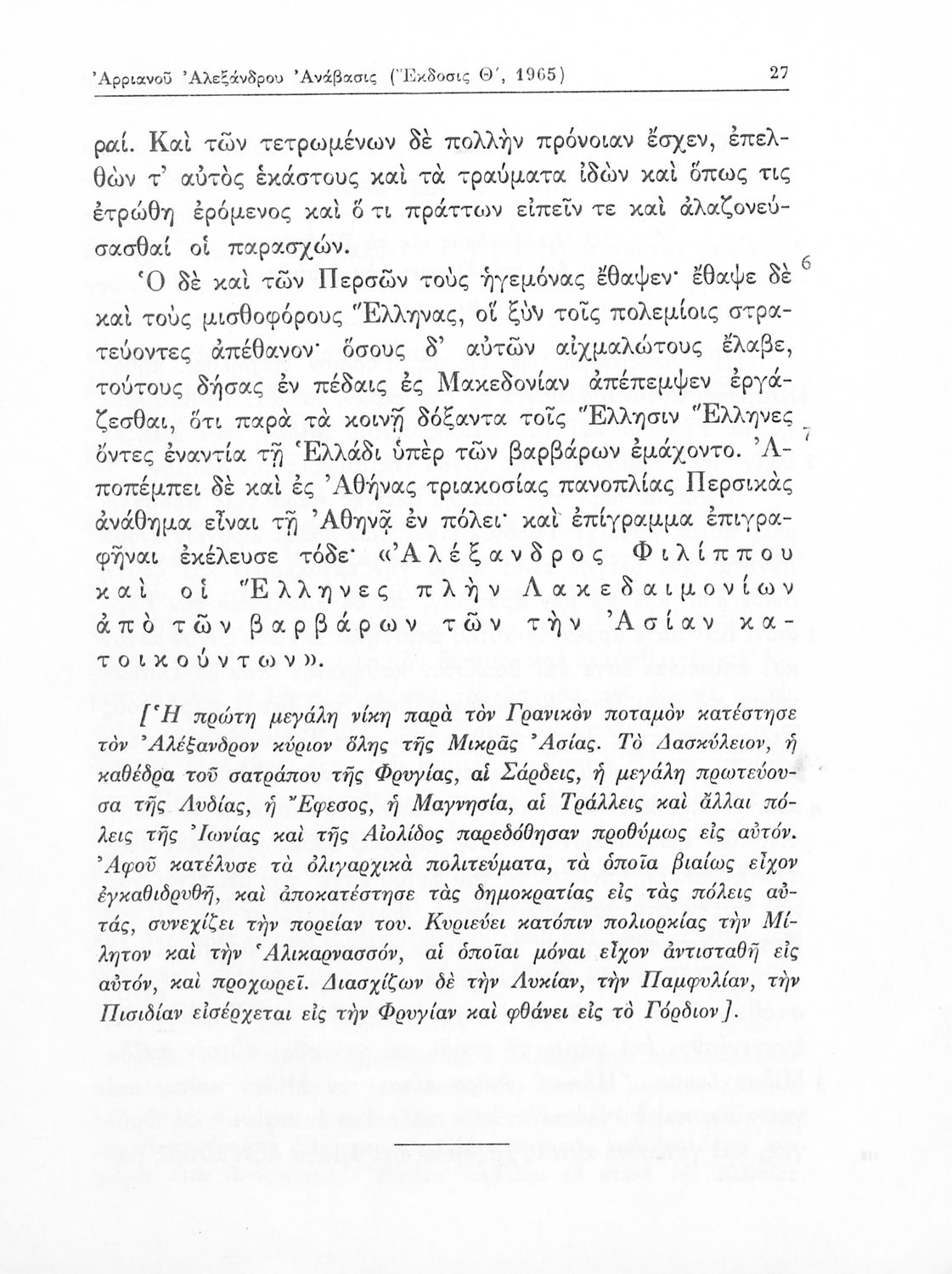 Σχολικό εγχειρίδιο Αρχαίων Ελληνικών που περιλαμβάνει αποσπάσματα από το έργο του Αρριανού Αλέξανδρου Ανάβασις και του Ηρόδοτου Ιστορίαι, ερμηνευτικές και λεξιλογικές παρατηρήσεις καθώς και τοπογραφικούς πίνακες και χάρτες..