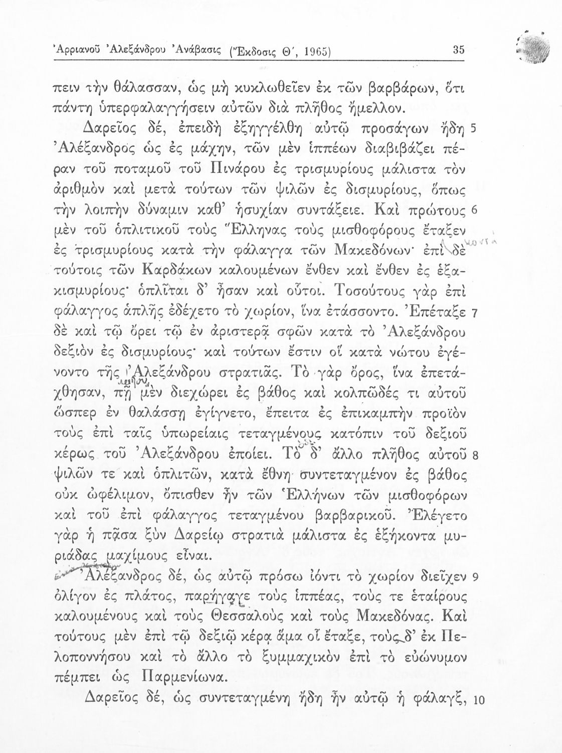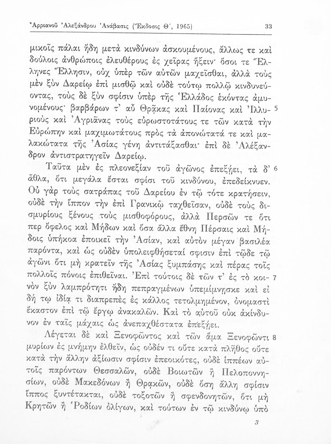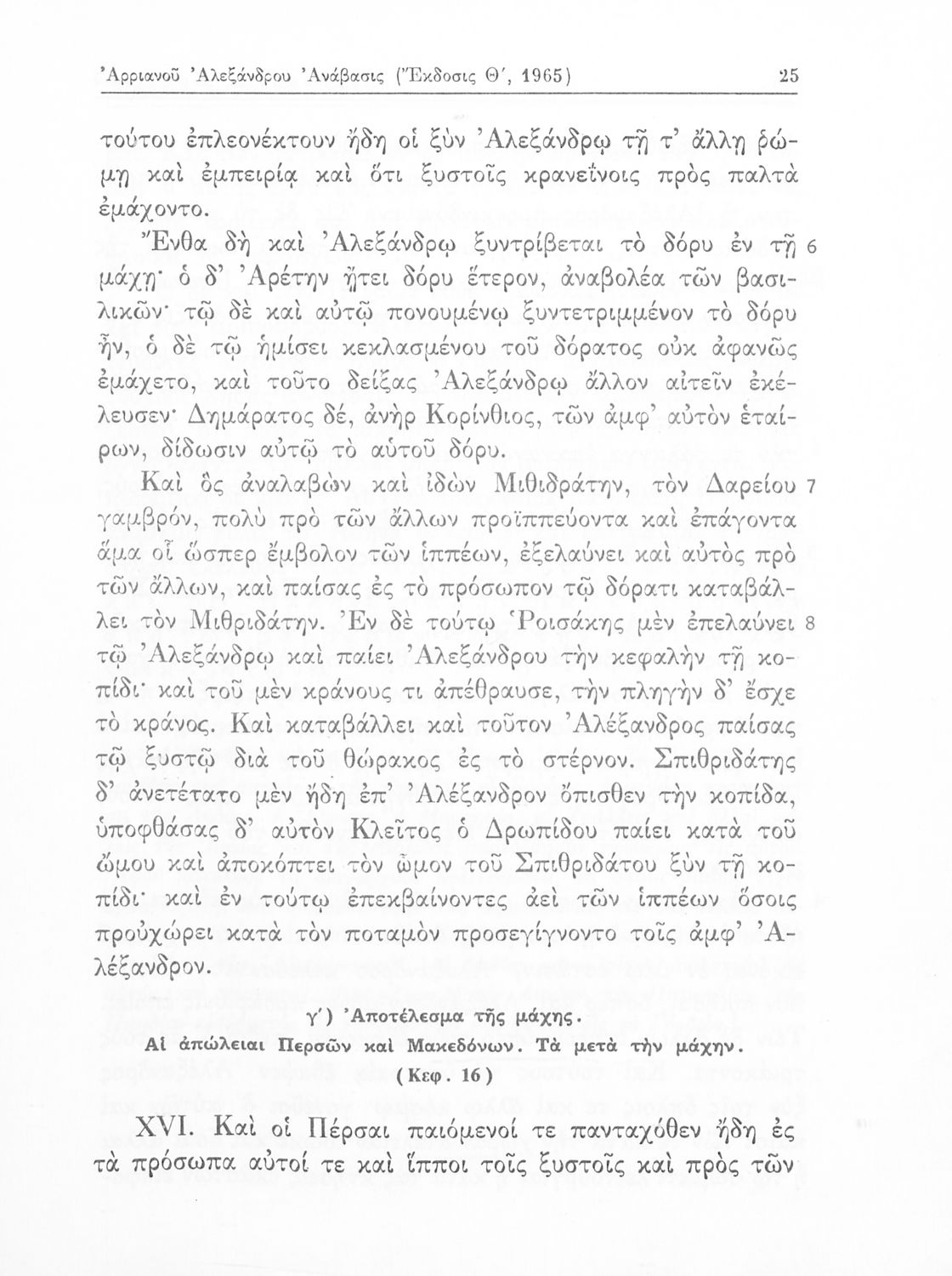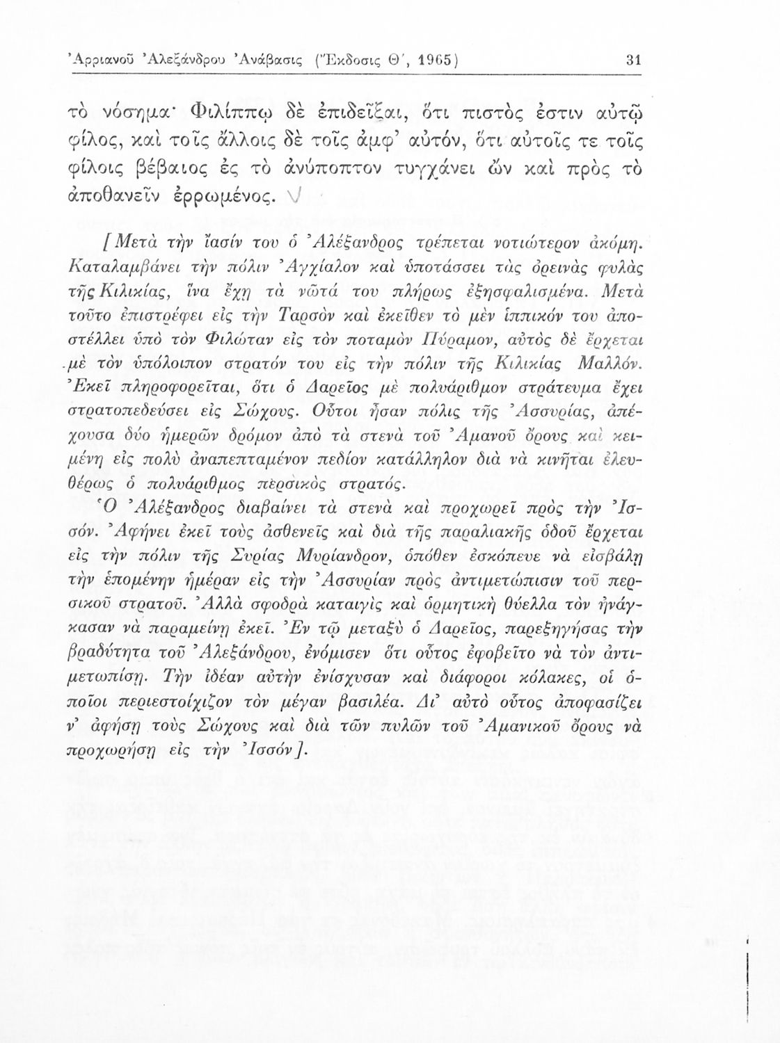 Σχολικό εγχειρίδιο Αρχαίων Ελληνικών που περιλαμβάνει αποσπάσματα από το έργο του Αρριανού Αλέξανδρου Ανάβασις και του Ηρόδοτου Ιστορίαι, ερμηνευτικές και λεξιλογικές παρατηρήσεις καθώς και τοπογραφικούς πίνακες και χάρτες..